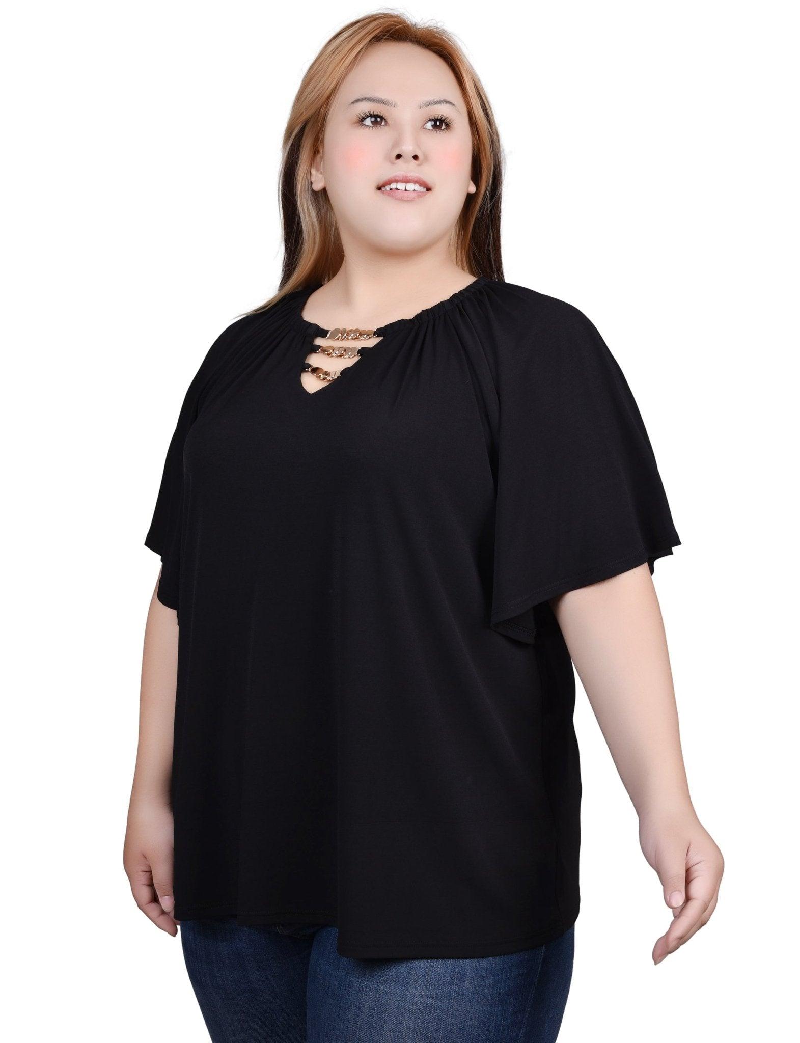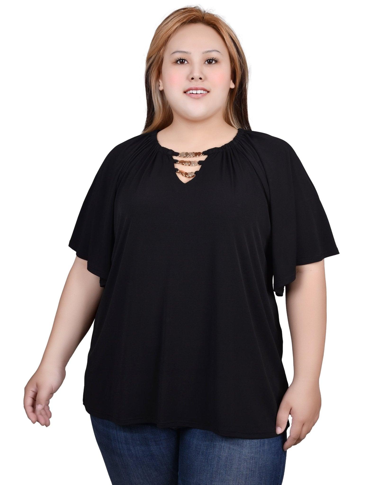 It's all about the details on this raglan sleeve top from NY Collection. The chain details highlight the neckline.