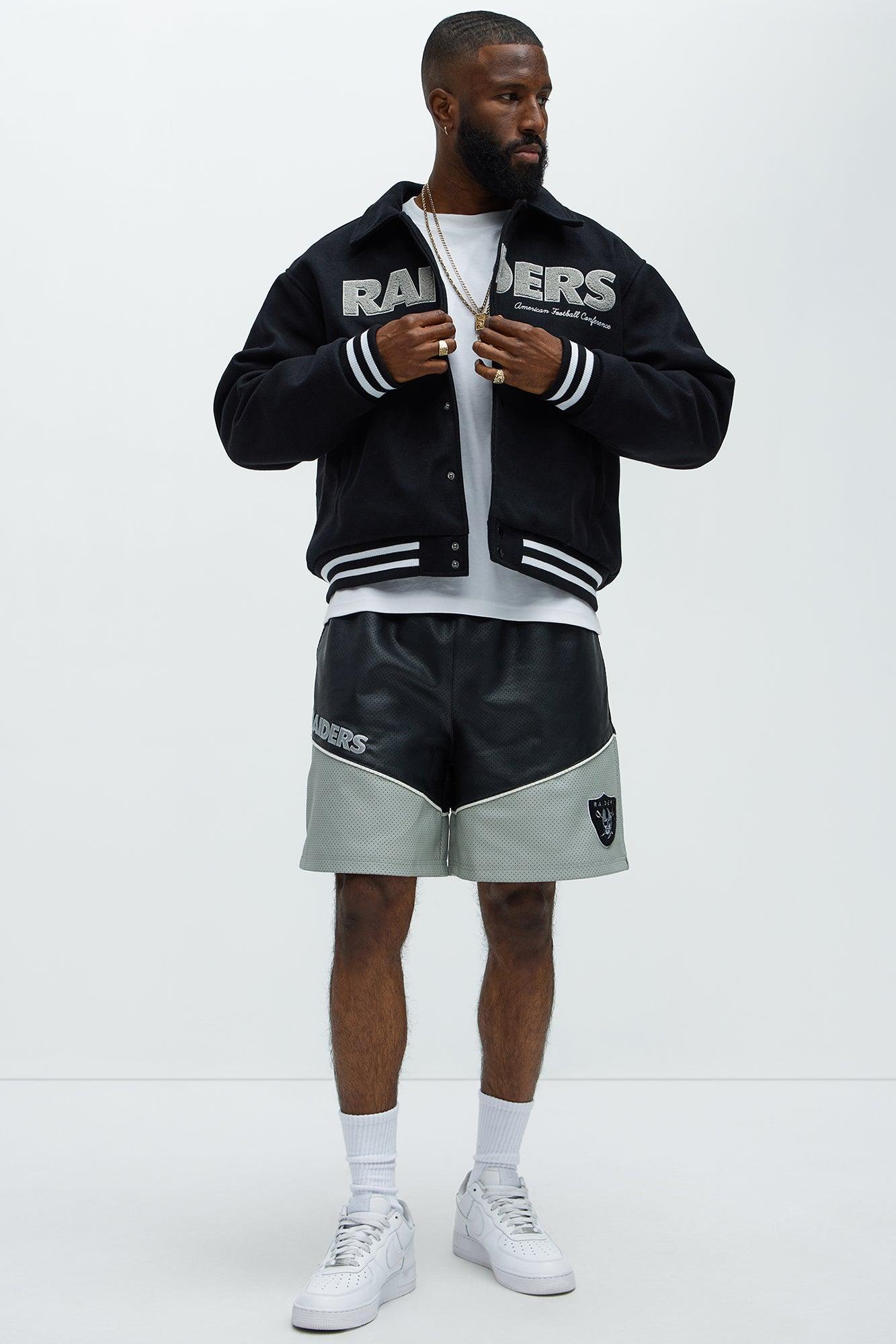 Available In Black/Grey. Folded Collar Front Full Snap Closure Front Las Vegas Raiders and NFL Embroidered Details Side Hand Pockets Contrast Trim Back Las Vegas Raiders Chenille Patch And Embroidered Details Ribbed Cuffs and Hem Long Sleeves Shell: 100% Polyester Lining: 100% Polyester Filling: 100% Polyester Imported