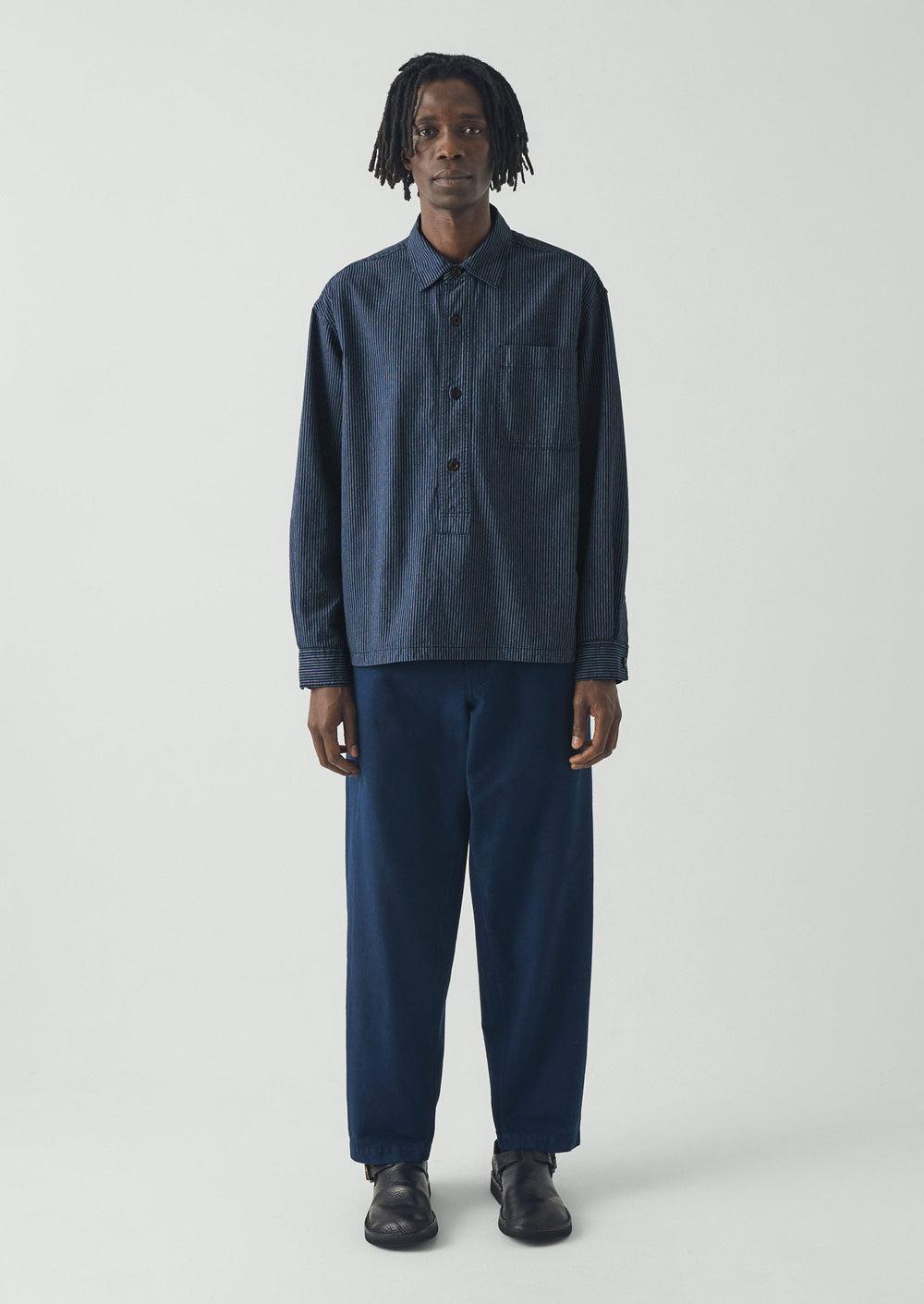 Striped organic cotton. Oversized shape. Point collar. Curved hem. Half placket. Corozo buttons.