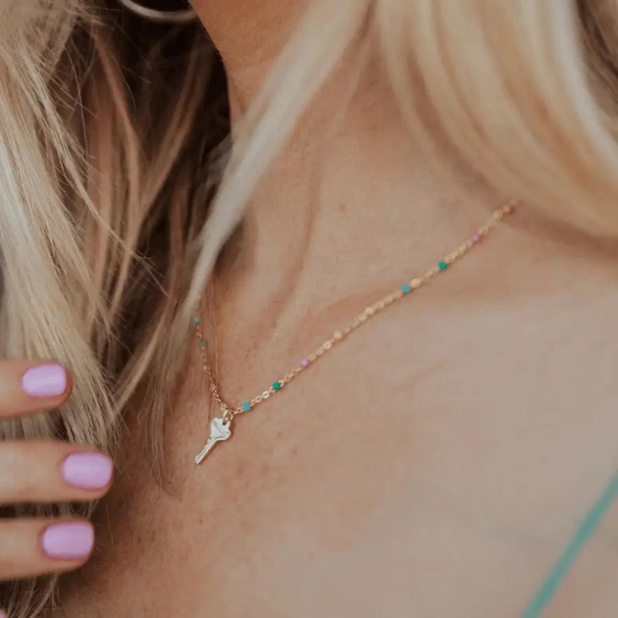 • Multicolor beaded and gold 16" chain with 2" extender • Lobster clasp closure • Features a 1/4" x 3/4" gold key engraved with BELIEVE