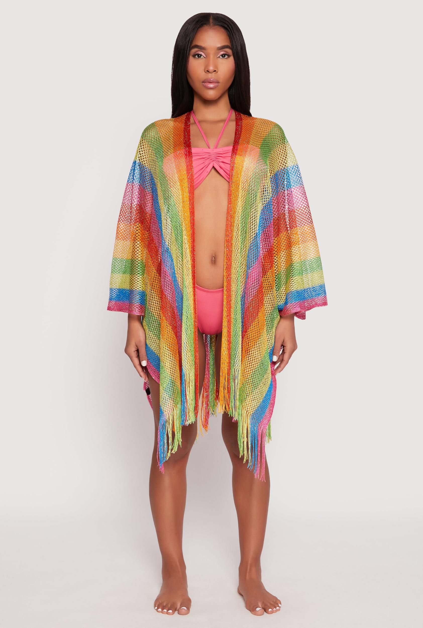 This lightweight cover up features a collarless neckline and 3/4 sleeves that offer breezy coverage. Crafted from a fishnet and lurex blend, it drapes effortlessly to a 39 in length with an open front design. Its one-size-fits-most cut ensures easy layering over swimwear for casual vacation vibes. Open front for quick on and off at the pool or beach One size fits XS through 4X, embracing inclusive style Subtle shimmer from lurex adds a touch of fun without overpowering Model Pictured Wearing Size NO SIZEHeight 5 ft 10 in, Bust 38 in, Waist 33 in, Hips 47 inFits True To SizeMeasurementsFull Length: 39 inContent and Care Material: 100% Polyester Care Instructions: Machine Wash, Tumble Dry Country Of Origin: China Rainbow Item Number 1125067442616 MULTI COLOR - 1125067442616407