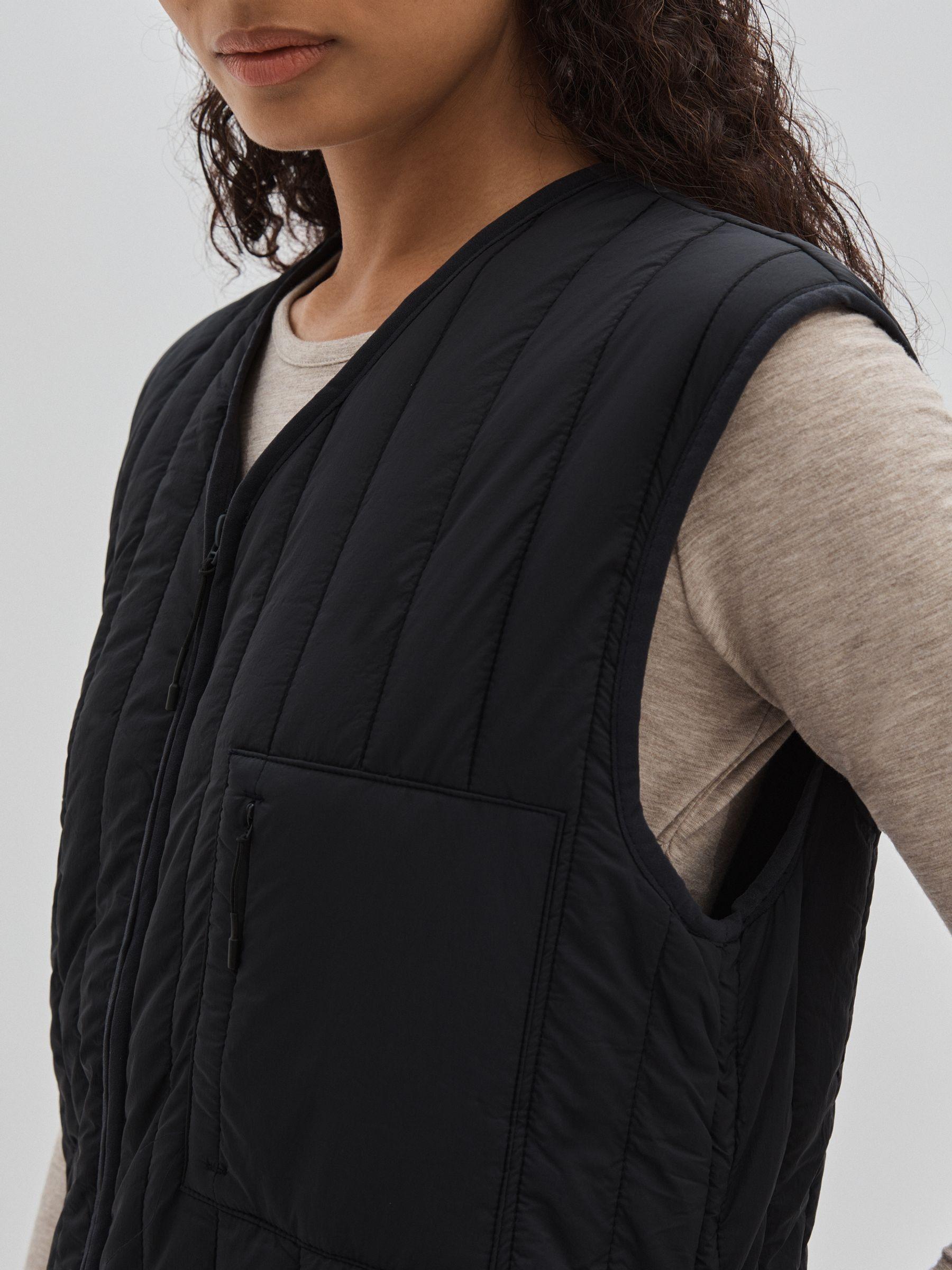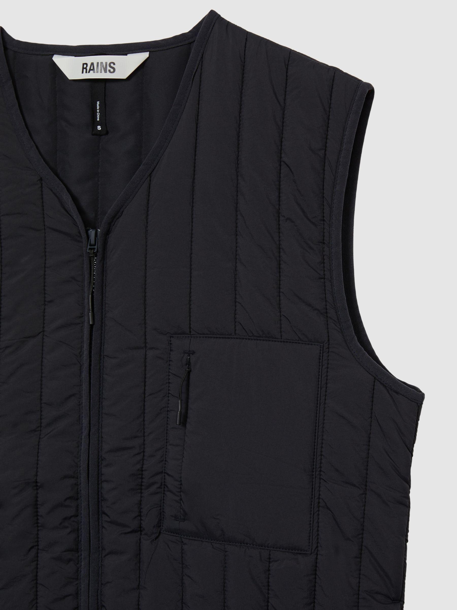 The Banja Liner gilet offers warmth without the weight of a coat ideal making it ideal for cooler trans-seasonal days. Crafted from the shell that's quilted with a lightweight fill, it has a V-Neck and zipped patch pocket. Lightweight quilted shell. V-Neck. Zipped patch pocket. Inseam pockets. Front zip. Rains, curated by Reiss, is a collection of outerwear and lifestyle garments with conceptual design details and a neo-Scandinavian aesthetic. The Danish label expertly embodies a balance between function and style.