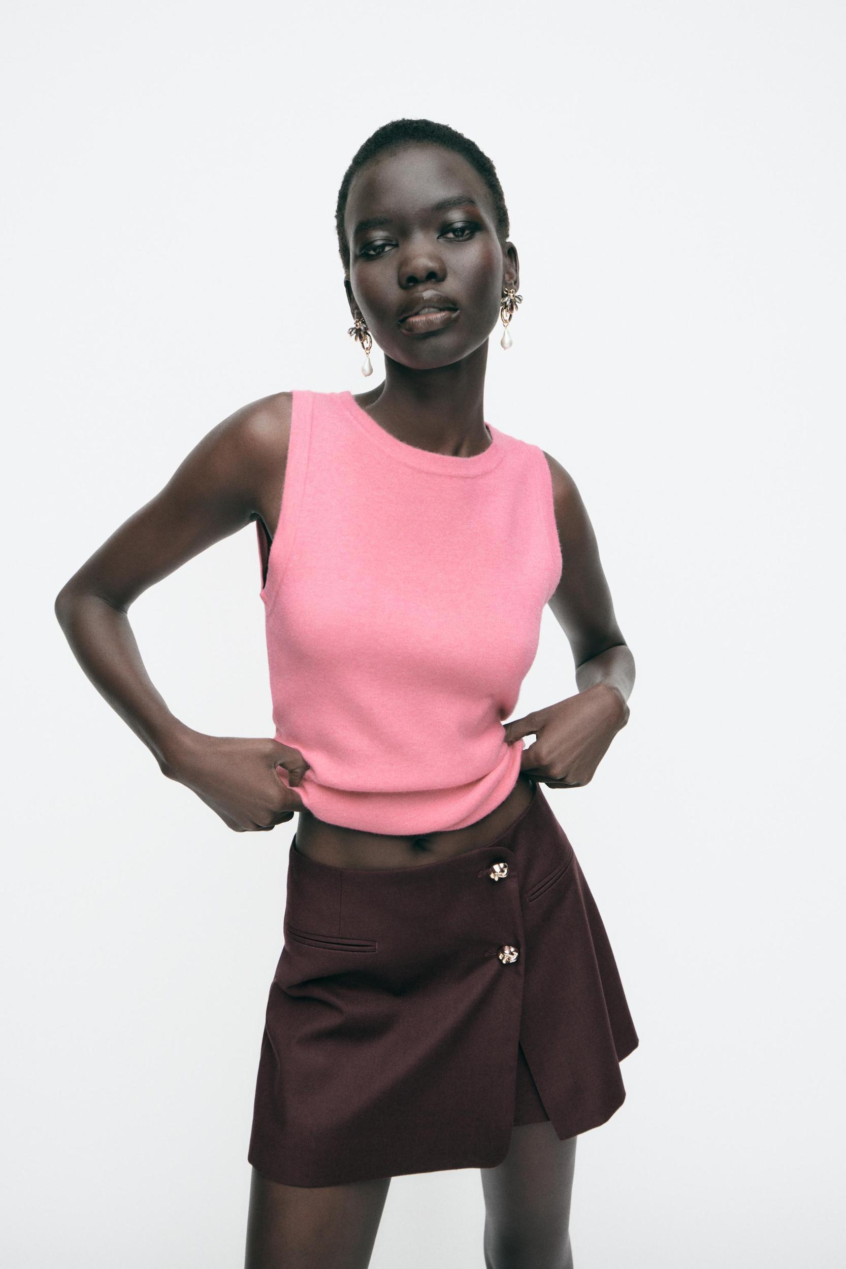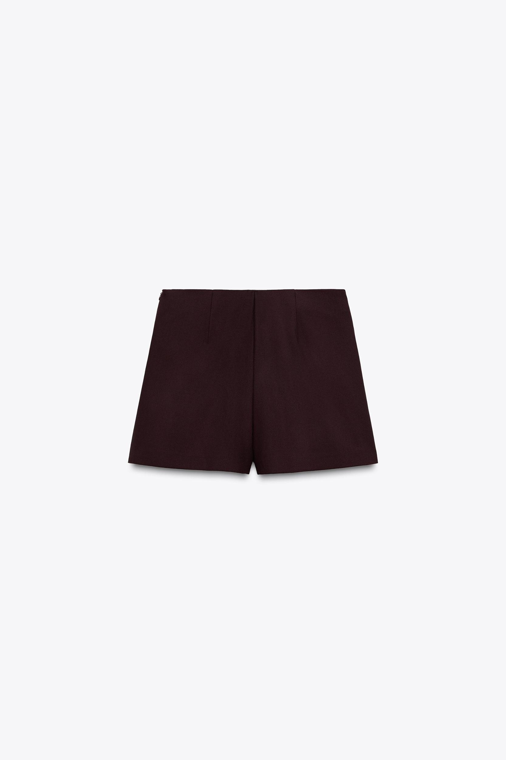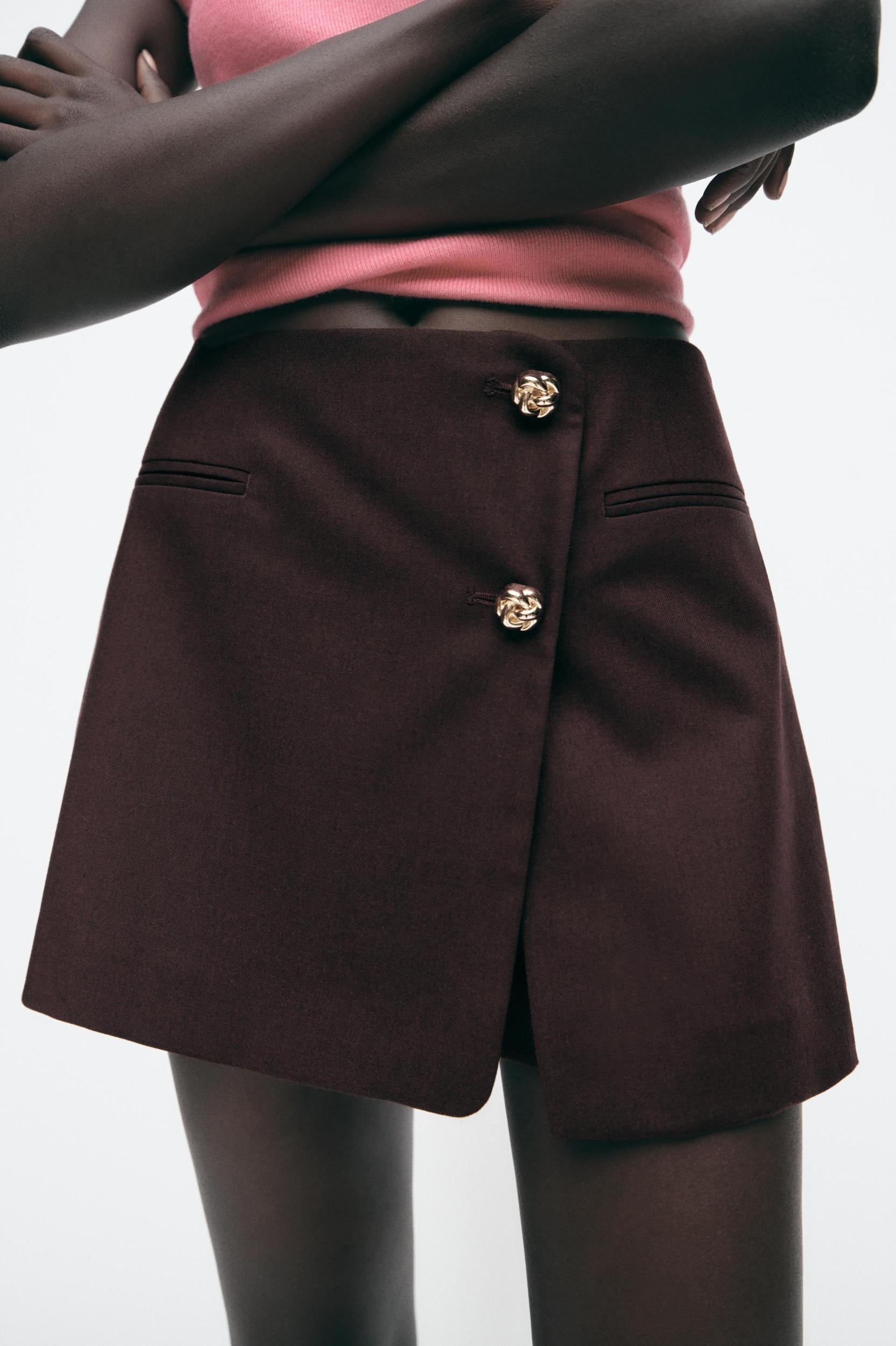 High-waisted skort with faux gold buttons and faux double welt front pockets. Hidden in-seam side zipper closure.