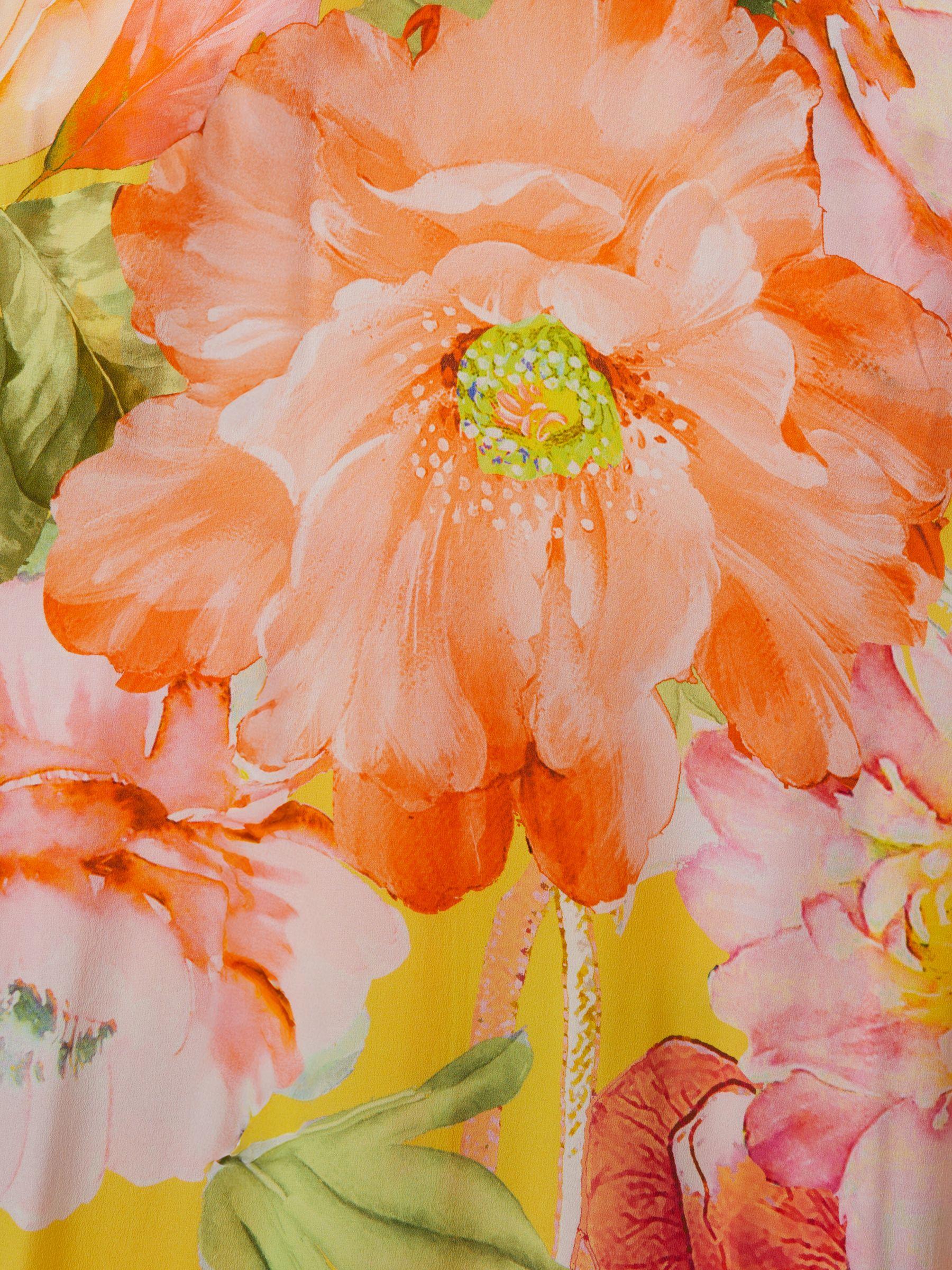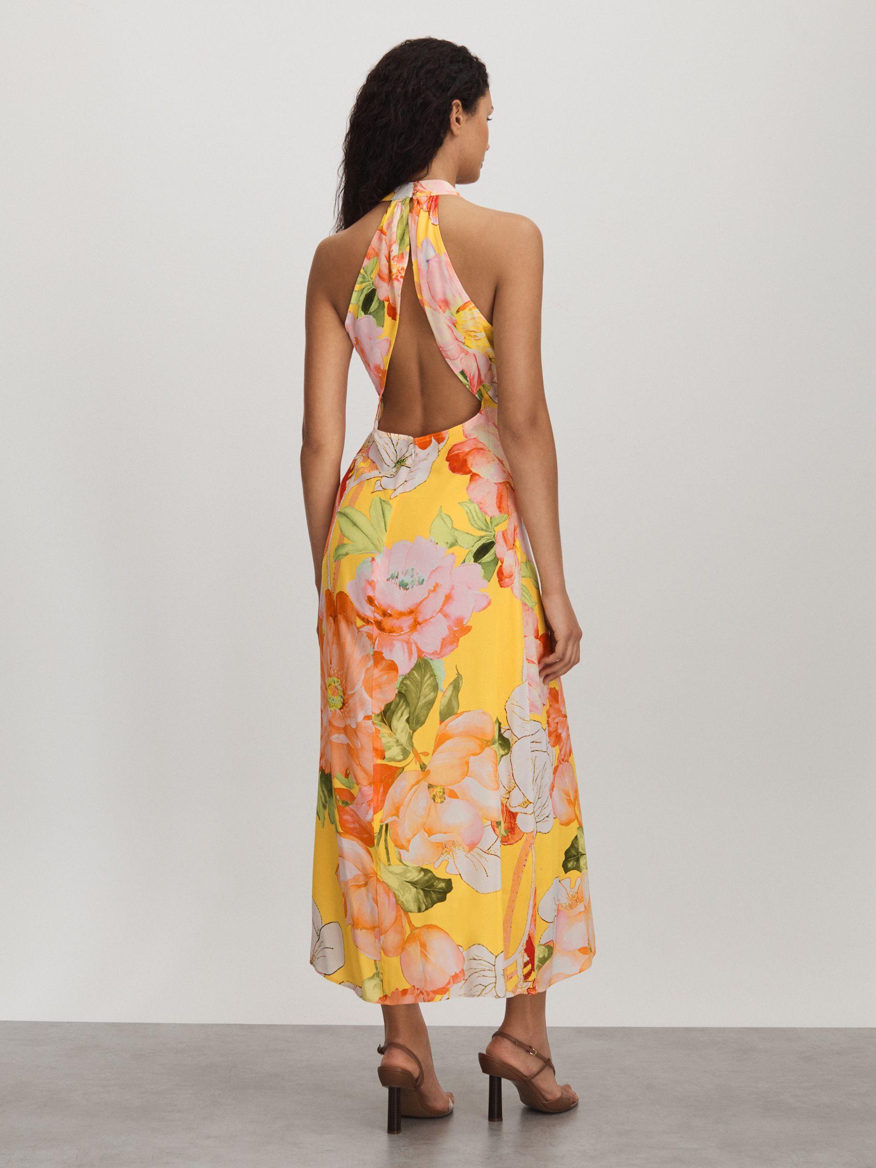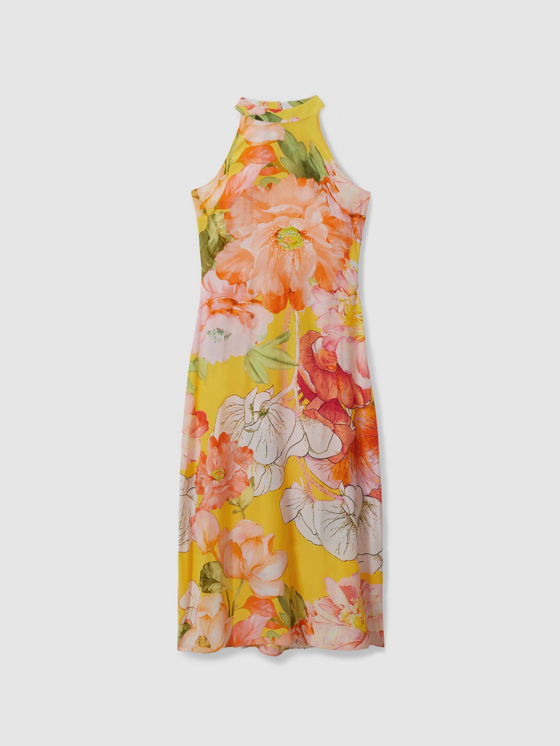 Made from 100% silk in a floral print, the Ariana dress has a floaty shape that fastens in a halter-neck style and finishes above the ankle. A diamond shaped cut-out features to the back. 100% silk Printed Halter neckline Cut-out to reverse Zip-closure to reverse Midi length Raishma, curated by Reiss, is a UK-based dress brand for women keen to embrace colour and texture into their occasionwear wardrobe.