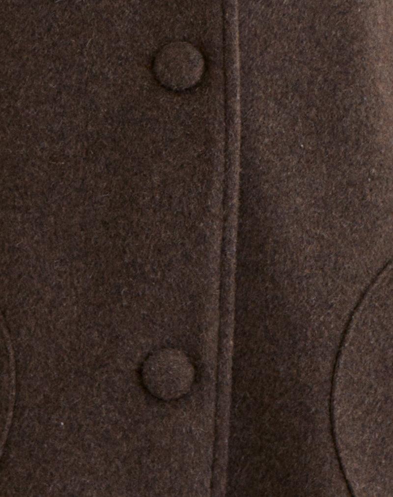 The Rakai coat in chocolate brown features long sleeves and a classic collar. It has a front button closure with large matching buttons and two rounded side pockets. The coat is mid-length, with a clean and simple design. MODEL WEARS SIZE:EXTRA SMALL - MODEL HEIGHT:5'7