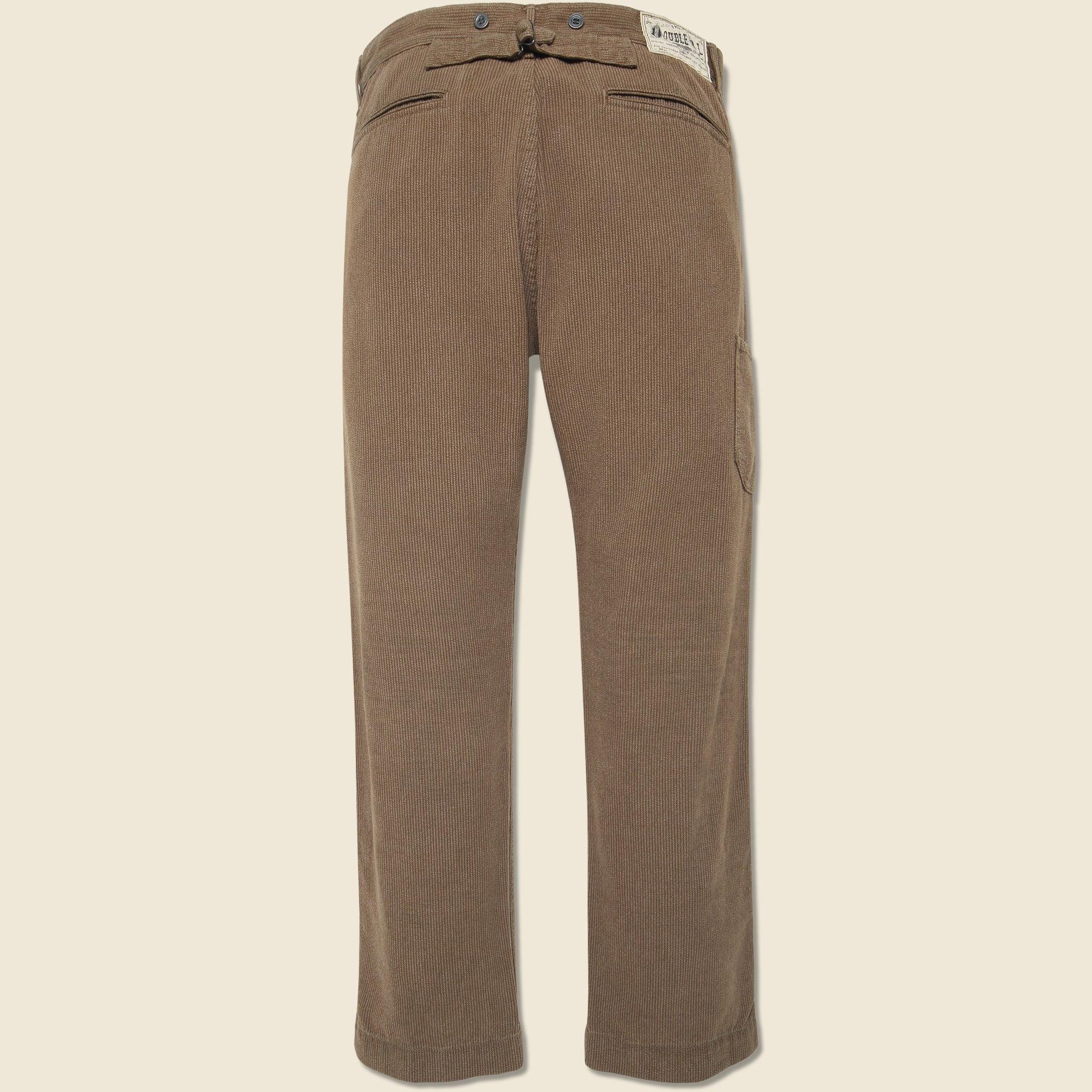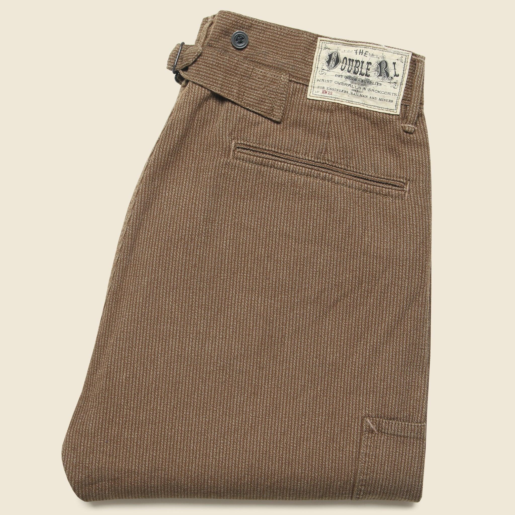 The Rambler Pants from Double RL are made with rugged cotton twill that features an open-weave construction that’s woven with a yarn-dyed striped pattern for a vintage workwear-inspired look. Tailored with a relaxed, straight-leg silhouette that runs true to size and detailed with metal exterior buttons for suspenders, a button fly, two front-angled pockets, two back welt pockets, a right-leg tool pocket, and an adjustable buckled back. Rugged cotton twill Yarn-dyed striped pattern Classic workwear-inspired details Adjustable buckled back Exterior metal buttons Button fly Two angled front pockets Two back welt pockets Right leg tool pocket Relaxed, straight leg fit that runs true to size We recommend taking your normal size Materials: 100% cotton The following measurements are for Size 32: Waist: 32” | Inseam: 32” | Thigh: 12” | Leg opening: 17” | Rise: 12”