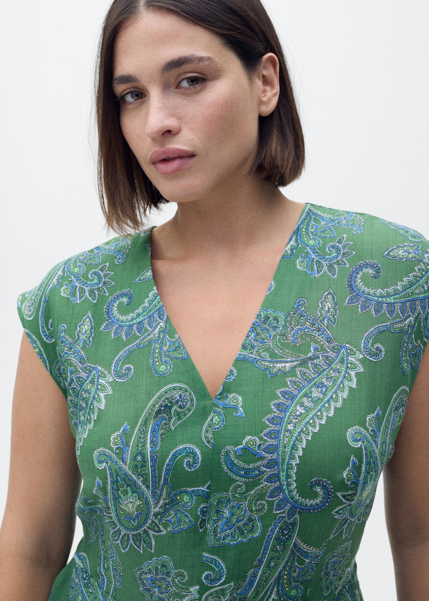 A-line design. Midi design. Paisley print. V-neck. Sleeveless. Two side pockets. Plus available. Side length 38.62 in. Back length 49.17 in