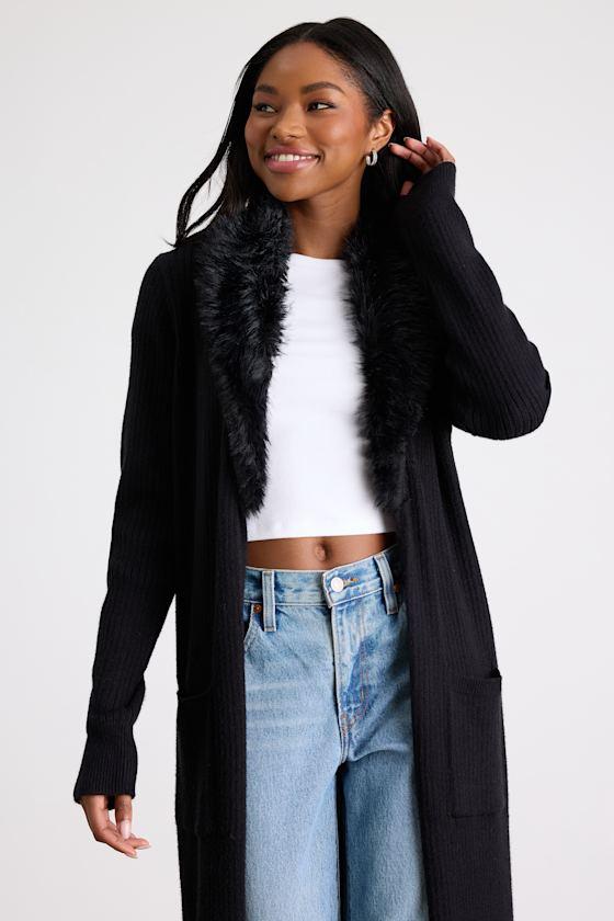 Cozy in the most fabulous way possible, this ribbed sweater knit coat is essential for fall styling that keeps the compliments coming even when you have to bundle up. Framed by long sleeves with fitted cuffs, the dramatic longline silhouette features an open-front design, a faux fur-trimmed collared neckline, and convenient patch pockets to keep your hands warm.