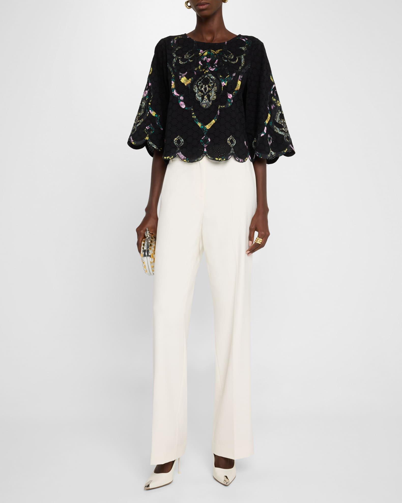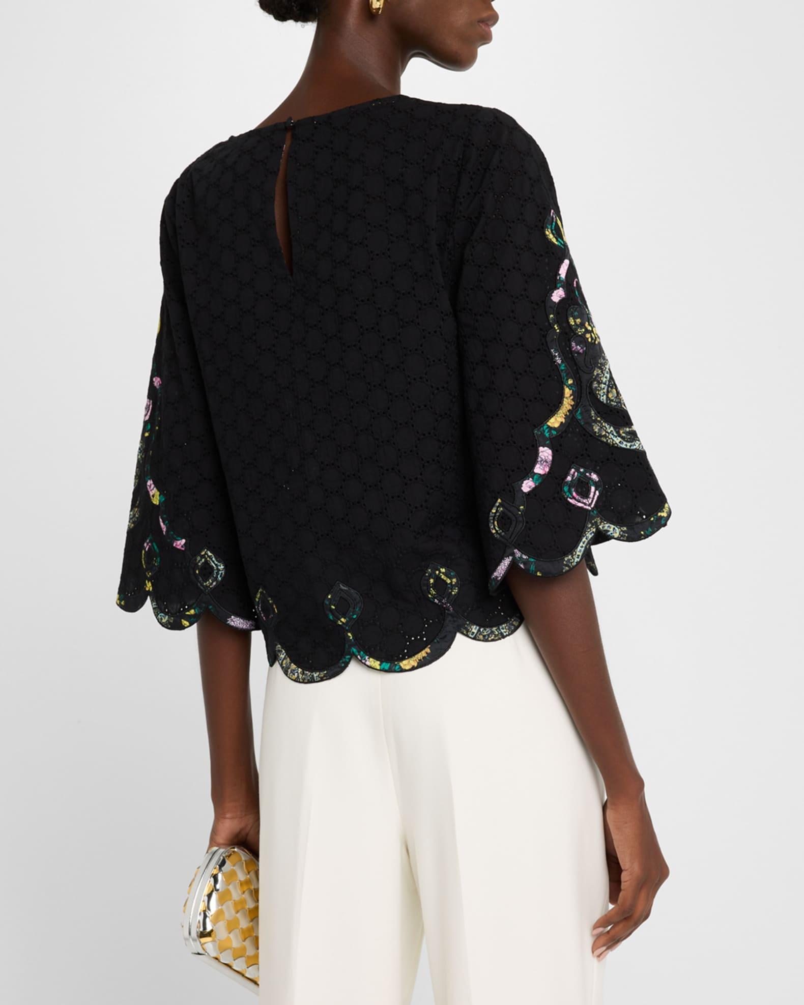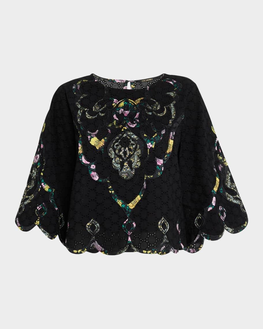 Kobi Halperin "Ramona" eyelet blouse with floral-print appliqué Approx. 21"L from shoulders to hem Scoop neckline Elbow sleeves Scalloped cuffs and hem Relaxed fit Keyhole button back Pullover style Cotton Partially lined Dry clean Imported Model is 5'10"/177cm.