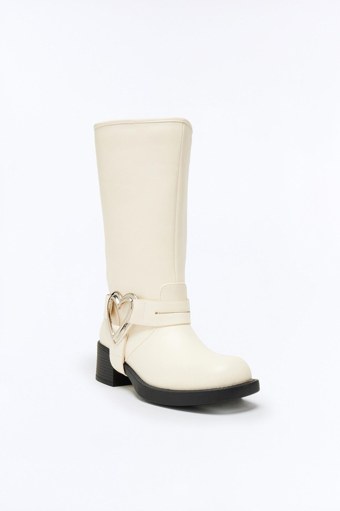 Available In Beige And Brown. Flat Boots Heart Hardware Detail Square Toe 1.5" Low Block Heel Imported California Proposition 65WARNING: Cancer and Reproductive Harm - www.P65Warnings.ca.gov.