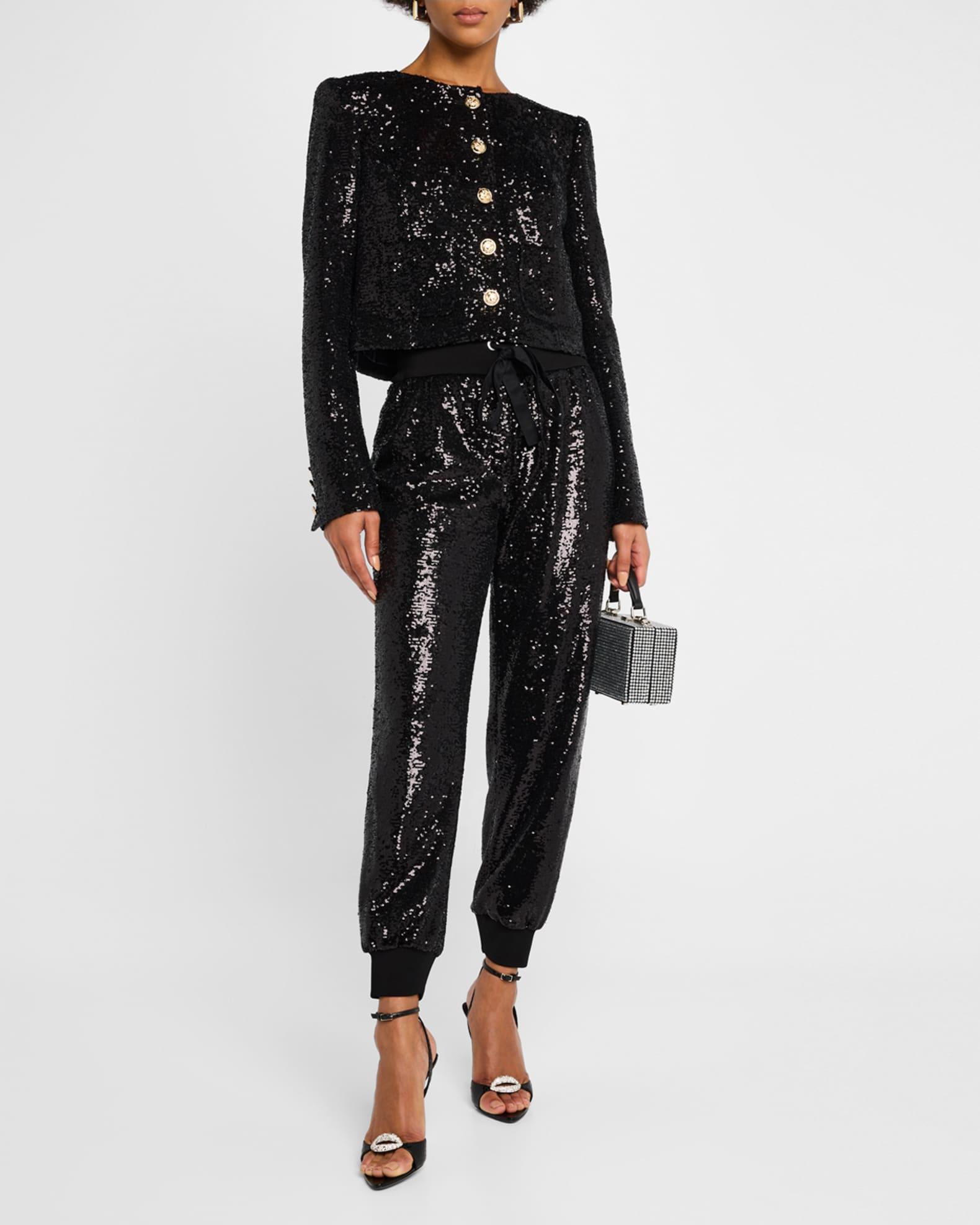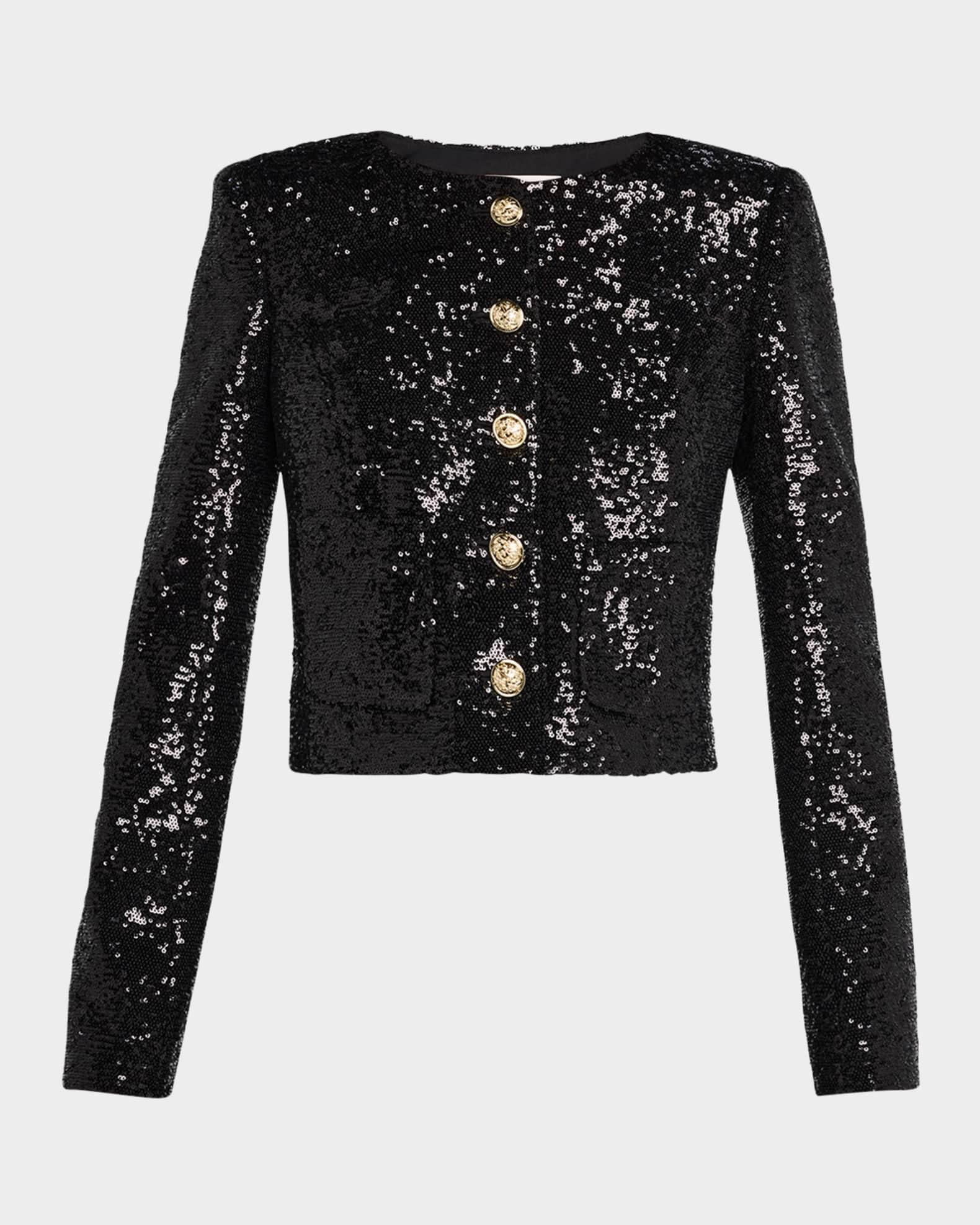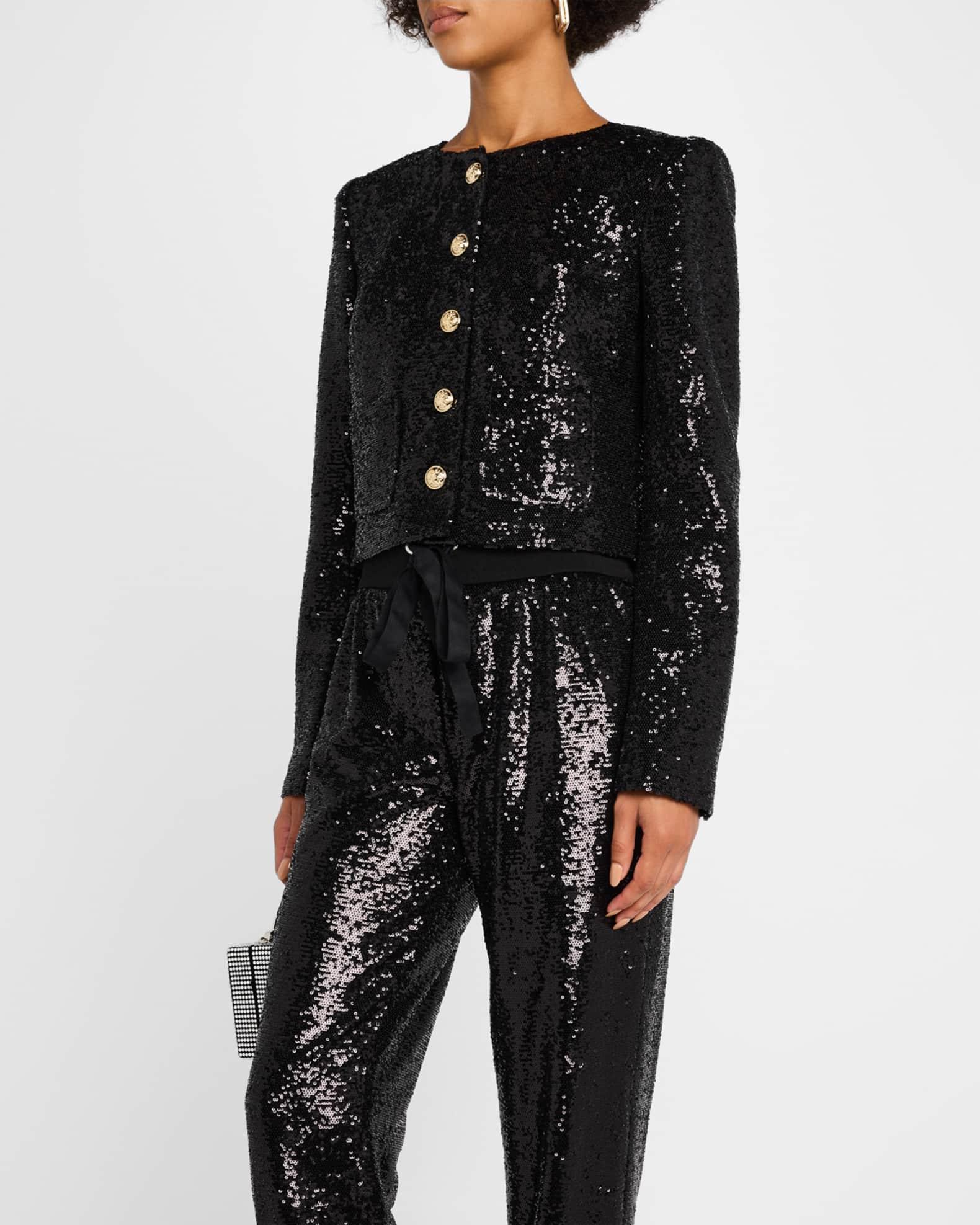 Cinq a Sept "Randi" sequin jacket with metallic buttons Approx. 19"L from shoulders to hem Crew neckline; button front Long sleeves Front patch pockets Cropped style Relaxed fit Polyester Lining: Polyester Dry clean Imported Model is 5'10"/177cm.