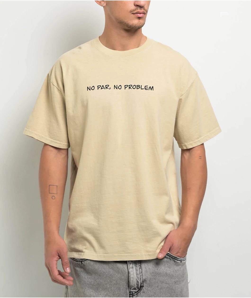 Random Golf Club introduces the Grinders Clubhouse t-shirt in a natural colorway with "No par, No problem" screen-printed on the front in black. The back of the shirt showcases a character wearing a red floral shirt pushing his clubs on the green wit