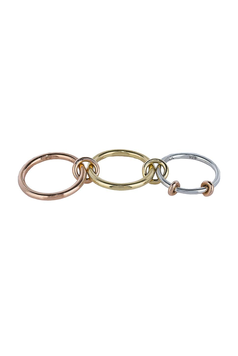 Spinelli Kilcollin Raneth MX Ring in Metallic Gold Made of mixed solid 18K rose and yellow gold, the Raneth Ring is crafted of three linked bands joined by mixed gold connectors and adorned with 18K solid rose gold accents.. Made in USA. 18K solid yellow and rose gold connectors. SLKN-WL15. G3-RANMX. About the designer: Yves Spinelli set out to create a minimal and architectural inspired fine line of jewelry with a cool yet timeless aesthetic. Partnering with artist Dwyer Kilcollin in 2010, Spinelli Kilcollin was born. Designed and crafted in Los Angeles, the brand found immediate success in their interlocking multi-band ring design which featured various sizes that could be styled a number of ways making it all your own. Using polished metals and precious stones accented with pave diamonds, the edgy yet iconic pieces represent a contemporary minimalism with intricate craftsmanship and materials that aspires to become a leading voice in the luxury jewelry industry.