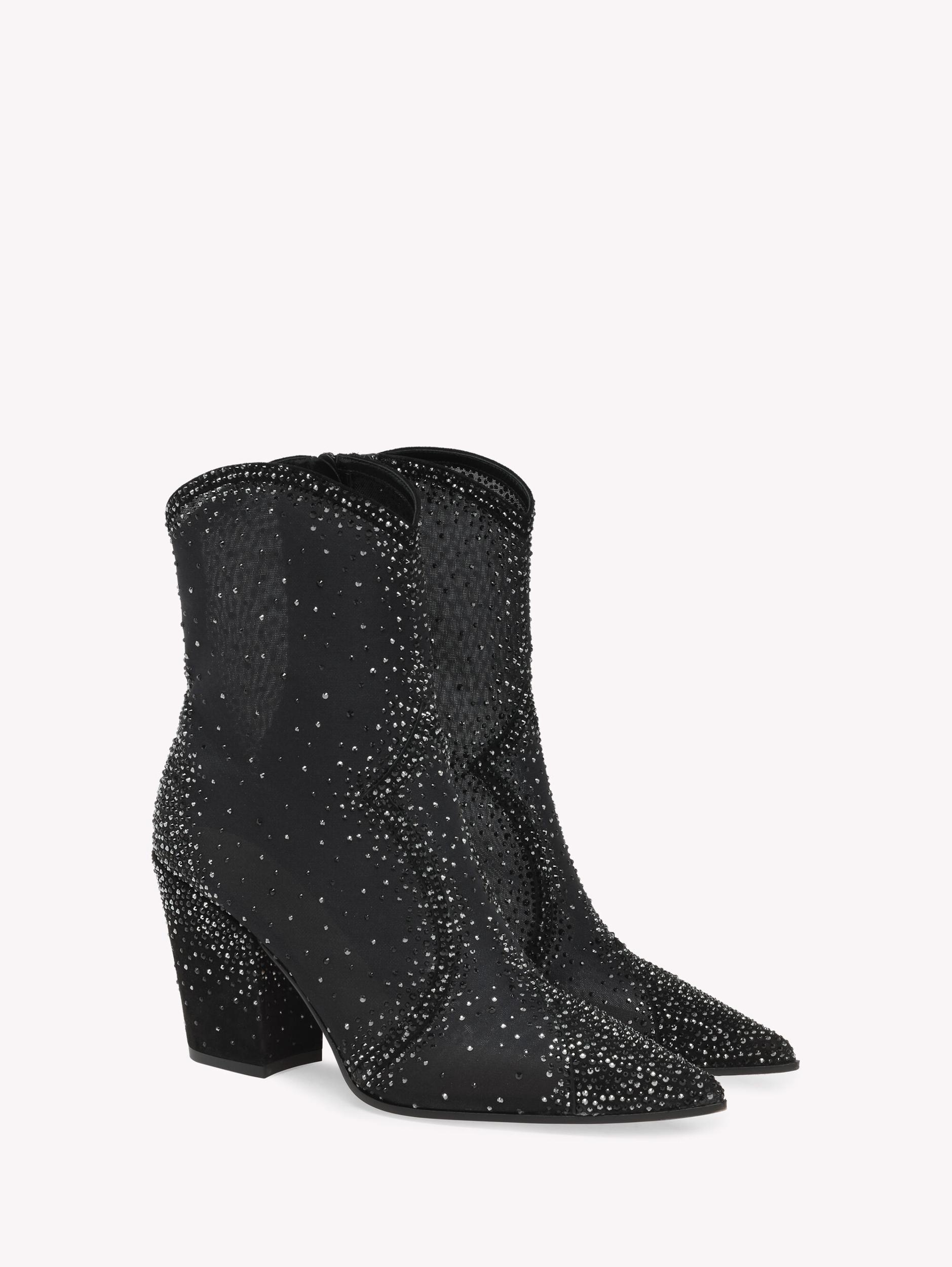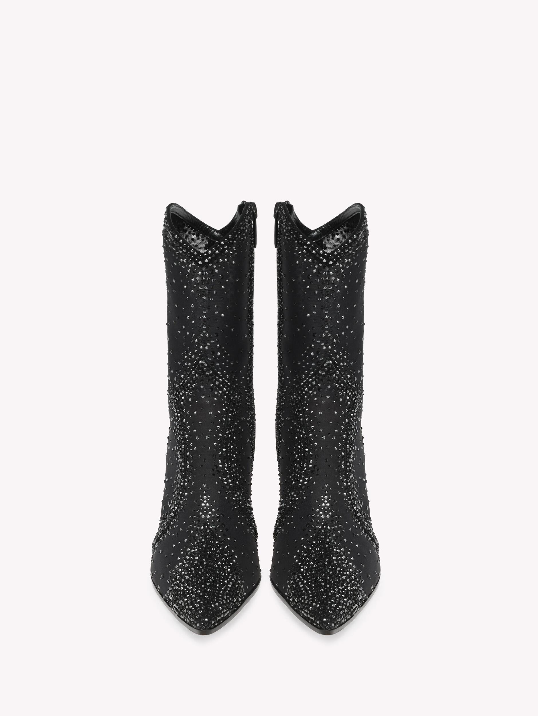 Crafted from see-through silk organza and finished with a suede trim, Rania West is a pointed-toe fitted bootie with a Western cut. The design presents an 85mm block heel and an inner zip. Each pair is approximately enriched with 9100 precious crystals. Handmade in Italy.