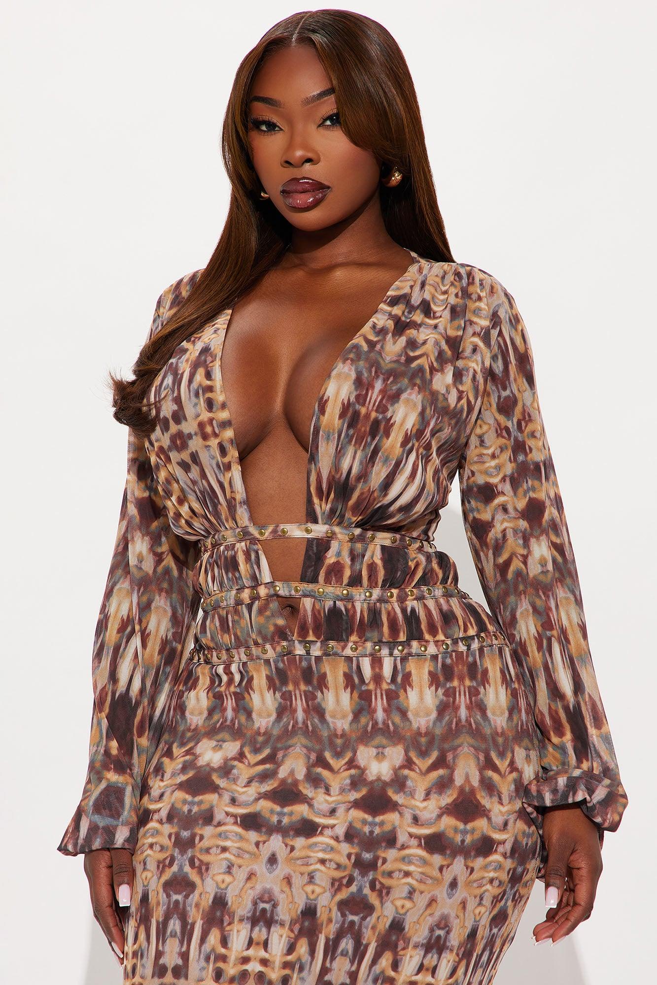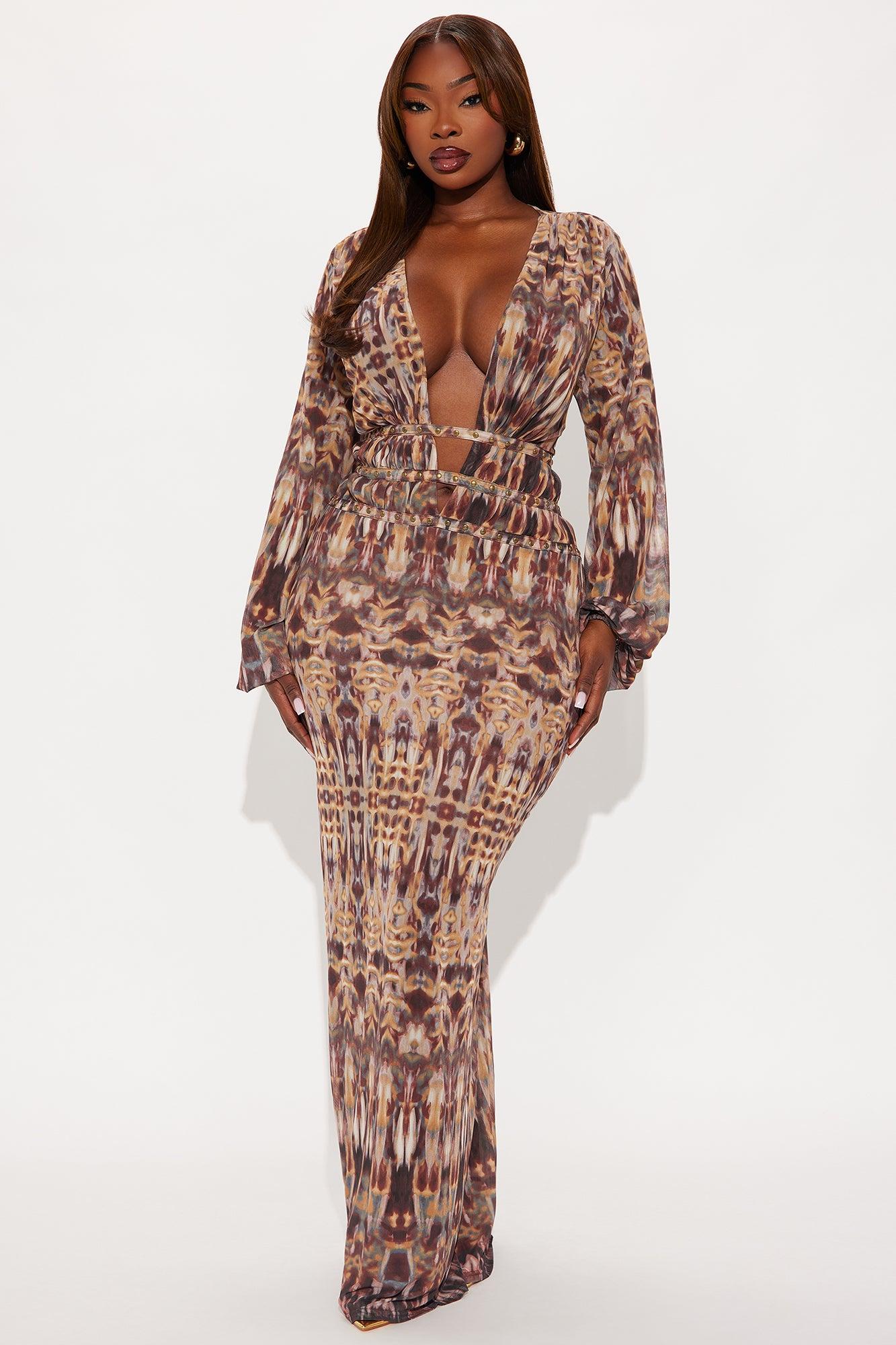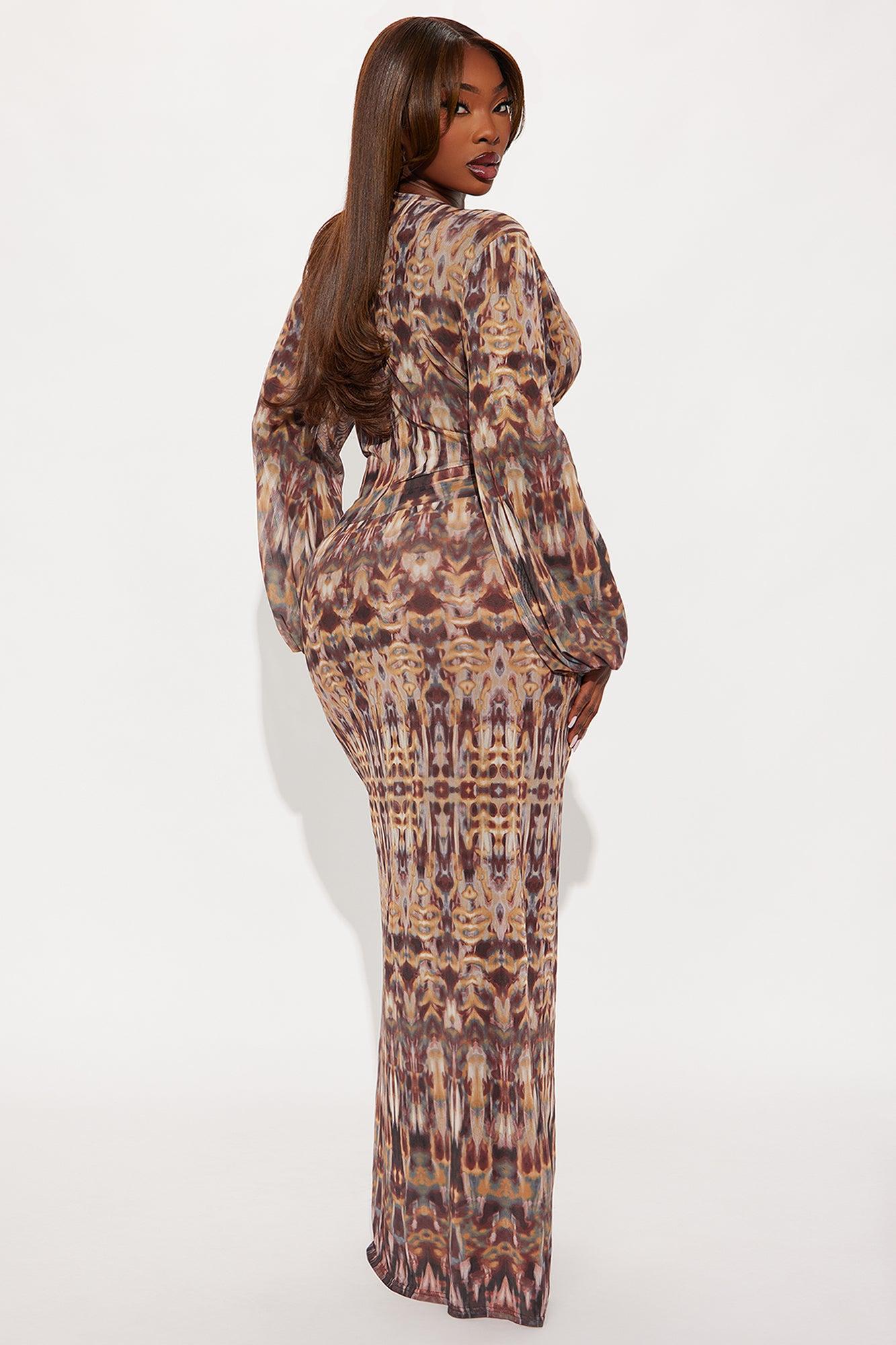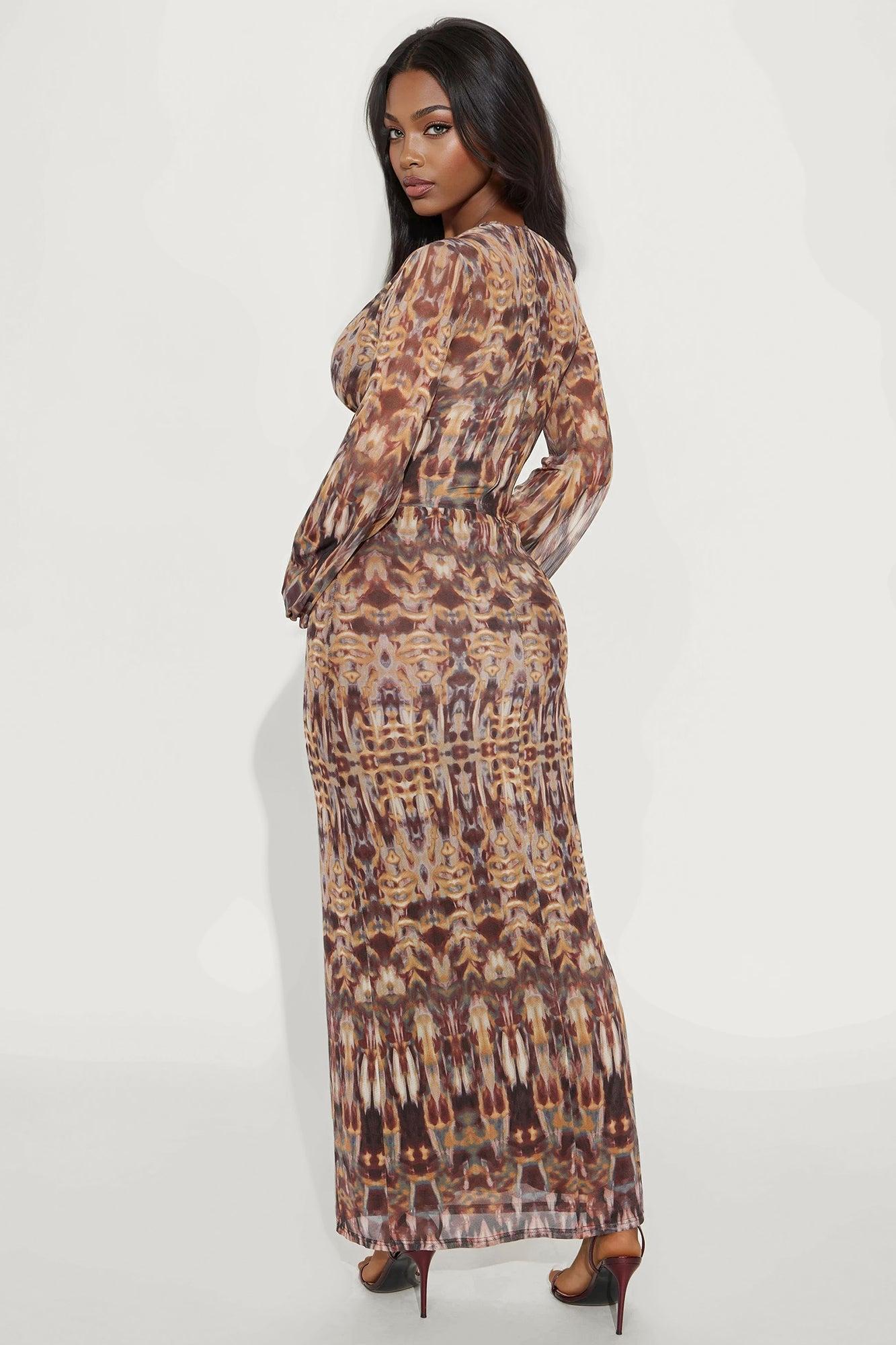 Available In Brown/combo. Floral Print Mesh Maxi Dress Long Sleeve Deep V-Neckline Hardware Details Hidden Back Zipper Sheer Lined Stretch Disclaimer: Print Placement Will Vary. Self: 100% Polyester Lining: 100% Polyester Imported California Proposition 65WARNING: Cancer and Reproductive Harm - www.P65Warnings.ca.gov.