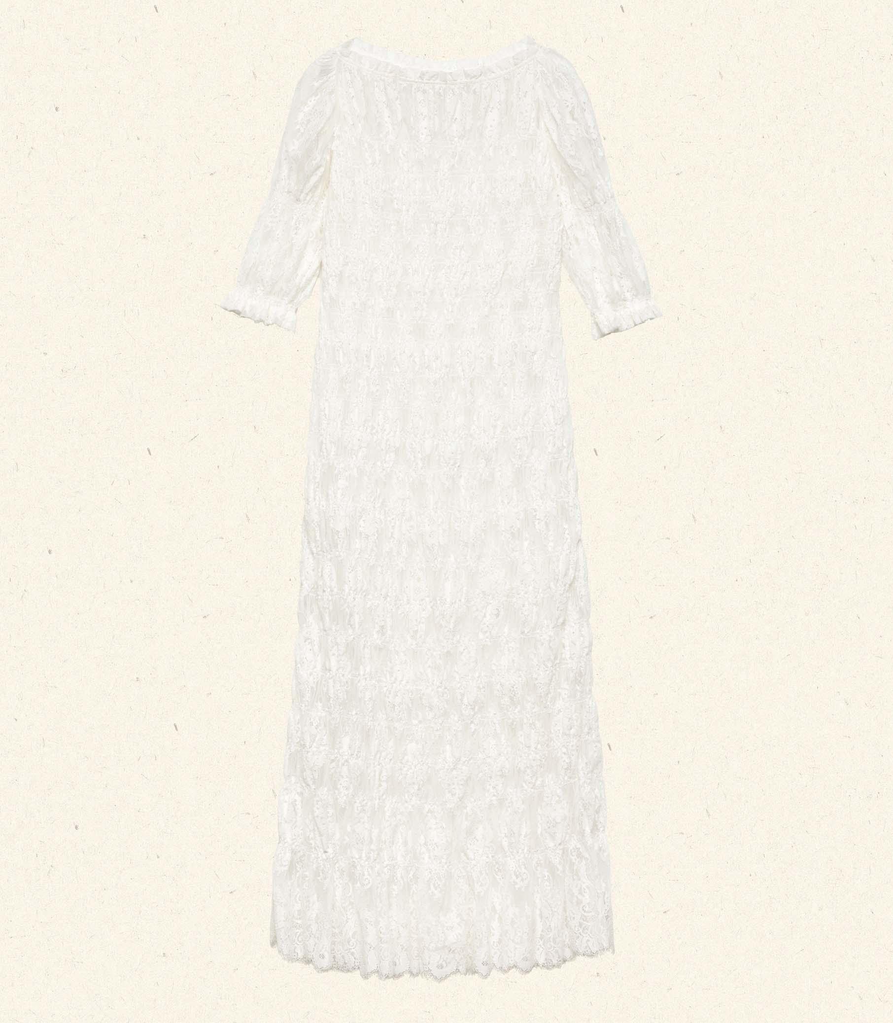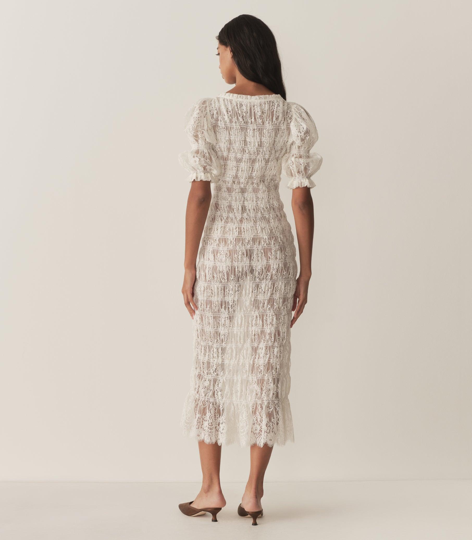 Reimagined in intricate chantilly-inspired lace, the Raquella Dress is an easy-wearing pullover style with a bateau neckline trimmed with a ruffle, elbow-length double-puffed sleeves, and allover elasticized smocking. A fitted silhouette gives way to an ankle-grazing skirt with a scallop lace hem.