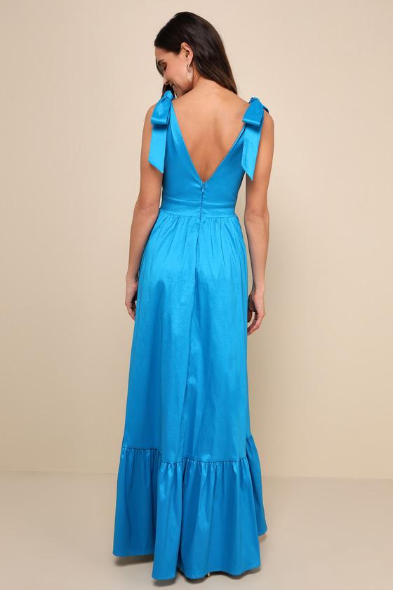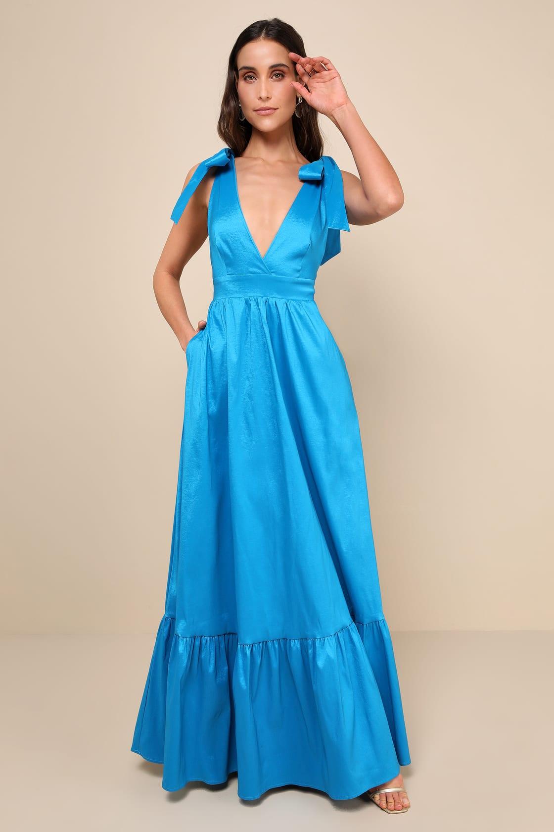 Slip into the Lulus Rare Charm Teal Blue Taffeta Tie-Strap Maxi Dress With Pockets so you can make the most remarkable entrance on that very special night! Stretch-woven taffeta shapes this awe-inspiring gown that starts with a sleeveless bodice with a plunging surplice neckline, a deep V-back, and long straps that tie at the shoulders. The high, banded waist tops a twirl-worthy, A-line skirt that boasts side seam pockets and falls to a tiered maxi hem. Hidden back zipper/clasp.
