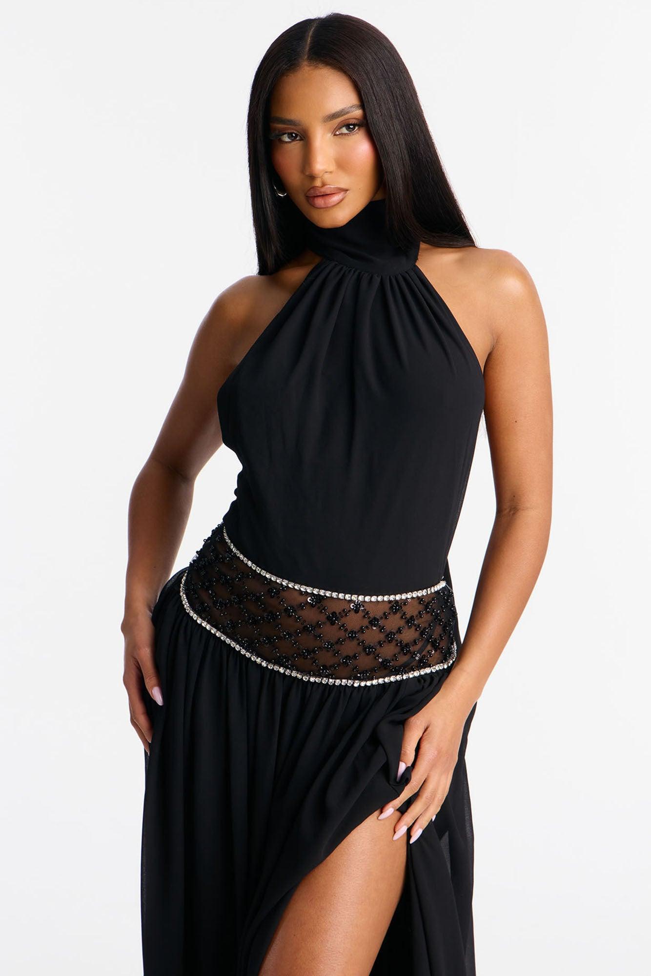 Available In Black. Maxi Dress Sleeveless, Backless Mock Neckline Mesh Cut Out Embellished Hidden Side Zipper Lined Non Stretch Disclaimer: Rhinestone Placement Will Vary. Self1: 100% Polyester Self2: 100% Polyester Lining1: 100% Polyester Lining2: 100% Nylon Imported