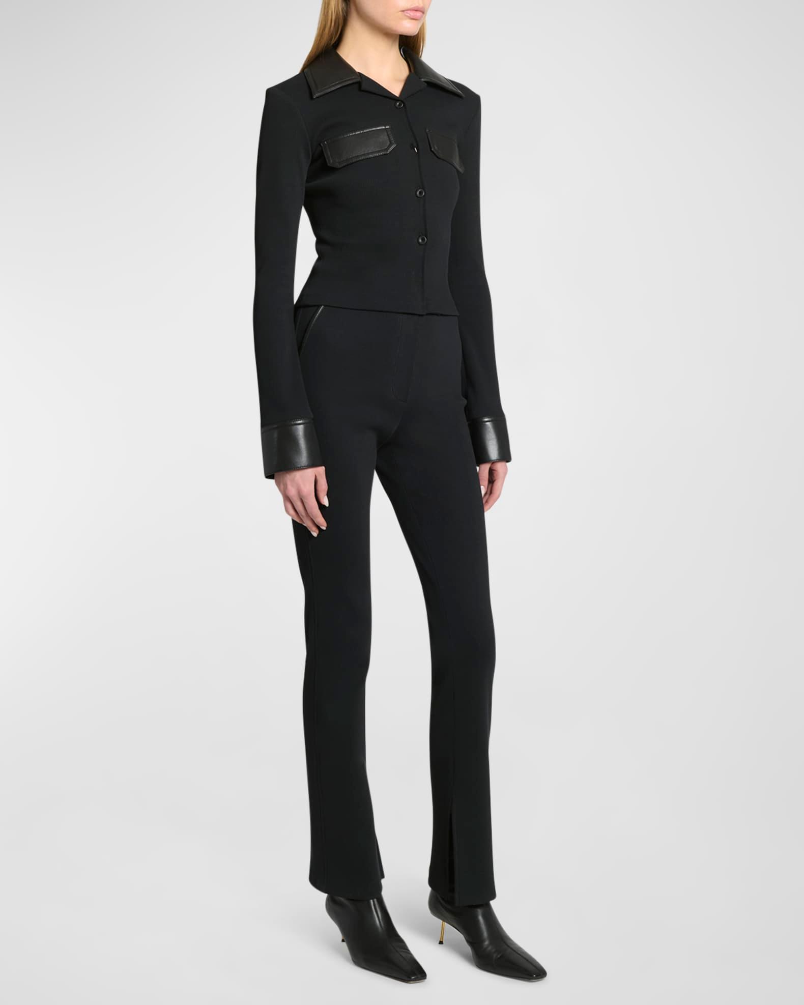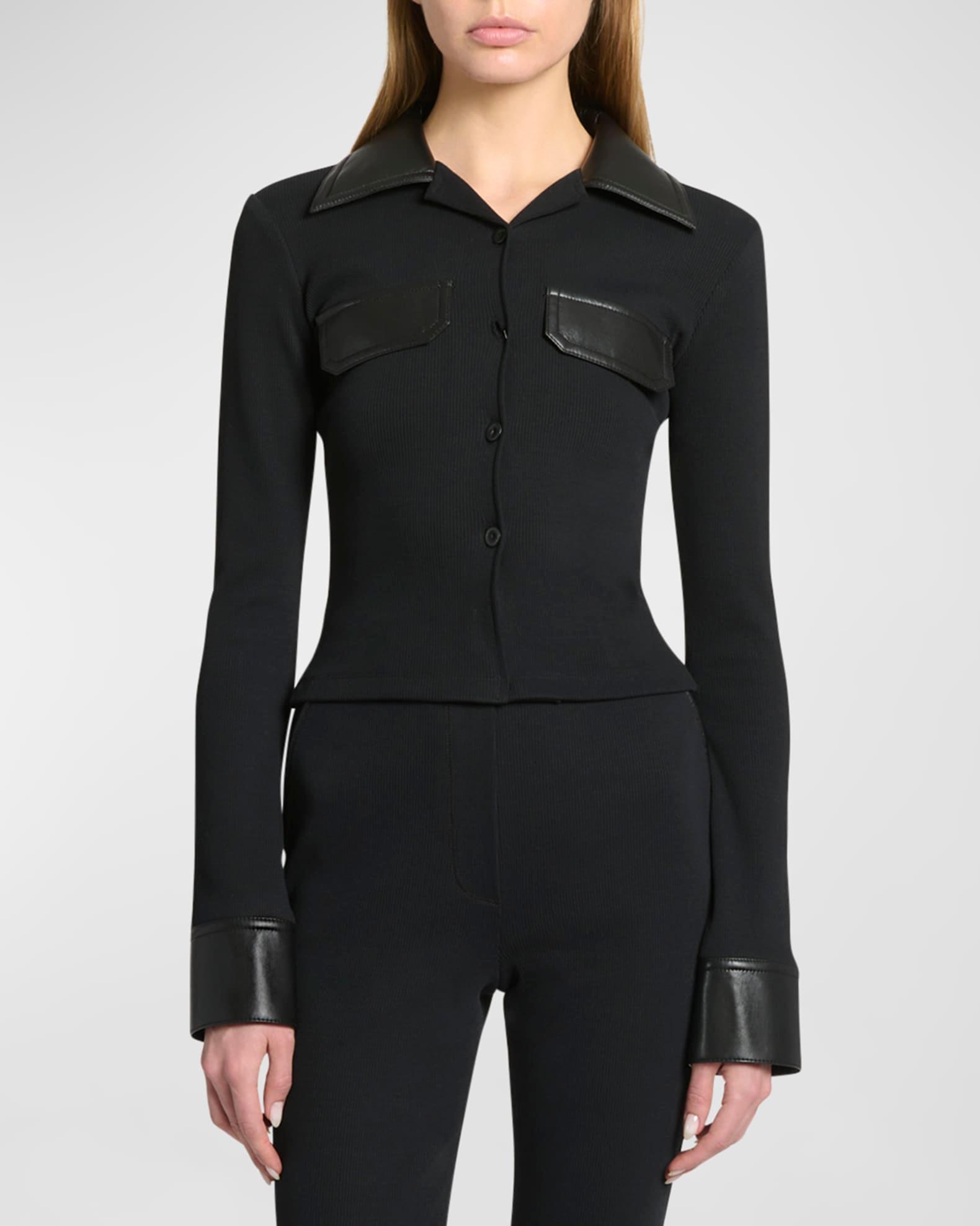 Nanushka "Rasima" ribbed-knit top featuring leather detailing Point collar Long sleeves with button cuffs Faux chest pockets Fitted silhouette Hem sits at the hip Button-front Polyester/leather Do not iron, dry clean Imported Model is 5'10"/177cm.