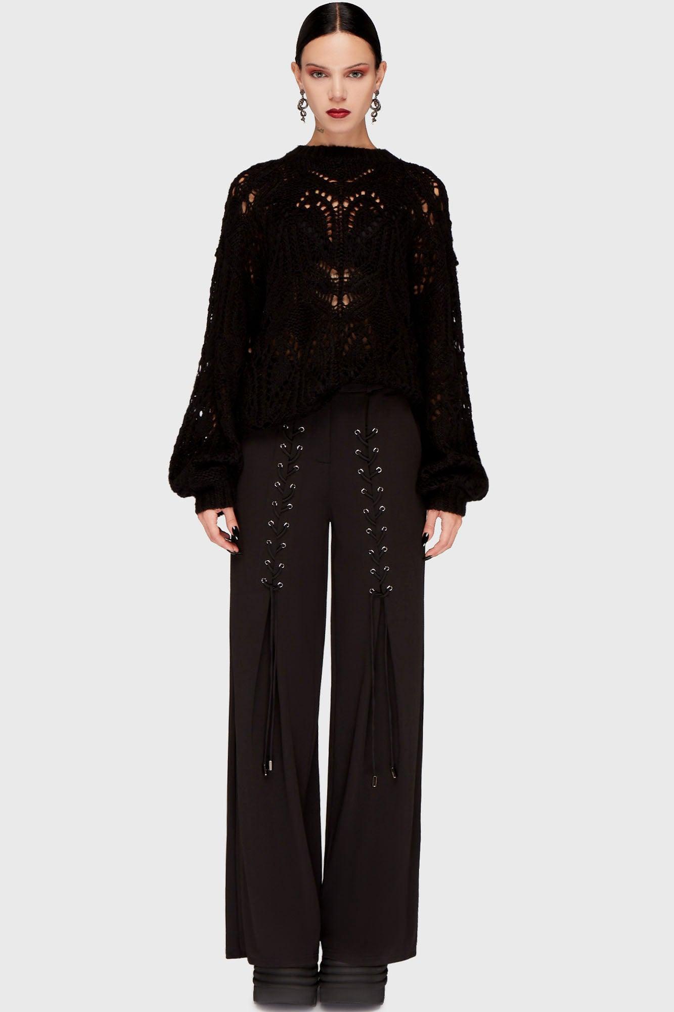 RAVEN'S LAMENT- High quality, woven fabric.- Front pleats with silver metal eyelets and self fabric lace up.- Silver metal caps on tie ends.- Wide leg.- High waist with fly zip and hook & bar fastening.- Side pockets.- Designed in Brighton, England.Model is 5'8 and wears a size XS.Inseam length: 81cm/ 31.8"With KILLSTAR branding, 93% Polyester 7% Elastane.Machine wash cold (30°c) / Do not bleach / Do not tumble dry / Iron At Low Temperature / Do not dry clean. Imported.Nocturne NightsBrass-gold hardware glows against deep hues, while blood-gloss bags add a dark punctuation of polish to every ensemble.