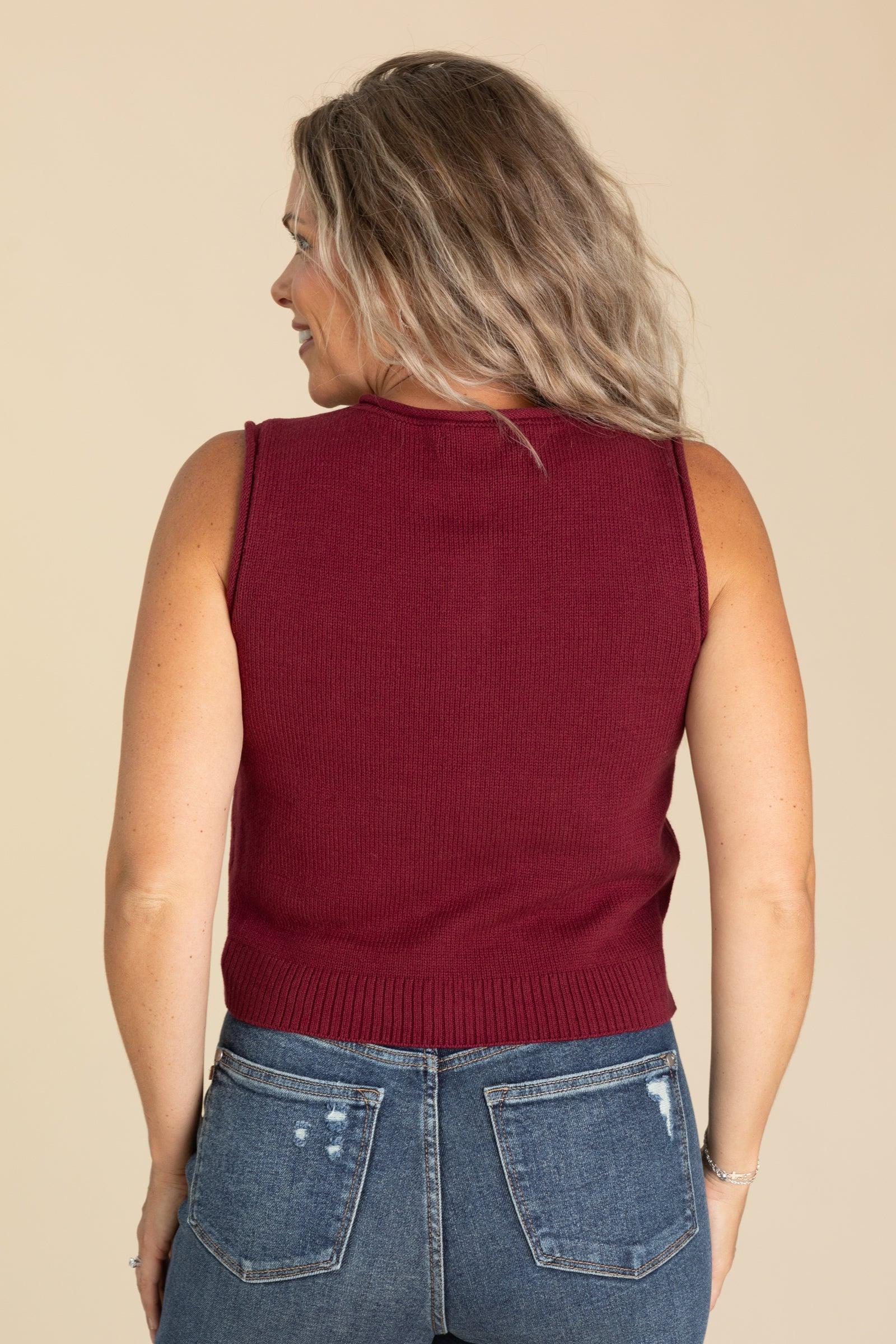 Product Details Colors: Burgundy/ Cream Print: Solid Neckline: Button Down Sleeve: Sleeveless Hemline: Straight Brand: The Workshop Material and Care 60% Cotton 40% Acrylic Hand Wash Cold Hang/Line Dry Size and Fit Small: Bust 32" Waist 34" Length 19" Medium: Bust 34" Waist 36" Length 19.5" Large: Bust 36" Waist 38" Length 20" Erica is 5’7” and wearing her true size small