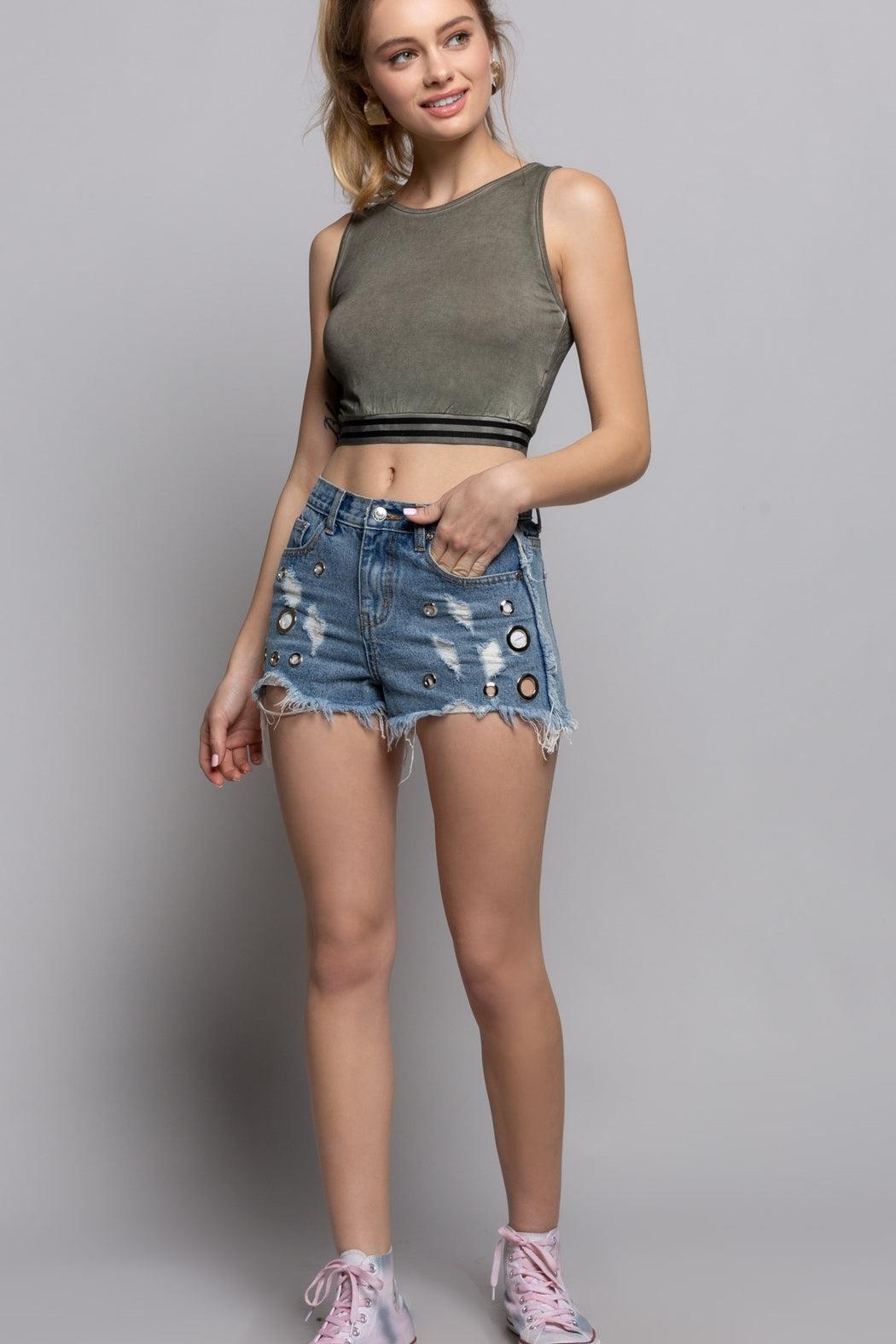 Raw Edge Denim Shorts with Eyelet Details