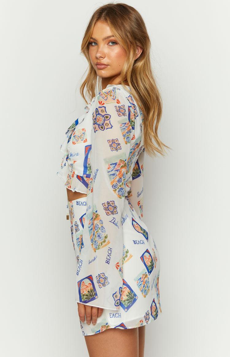 Chiffon Printed Mini DressHow to style:This mini dress in our Italia print combines casual beach girl and fancy clean girl vibes together. Pair this dress with high heels and gold jewellery or a cute pair of sandals.Features: Light weight non stretch material Fully lined Chiffon outer Long sleeve style V neckline Mini length Collar ruffles Front tie Left side invisible zip Prints may differ Gold hardware