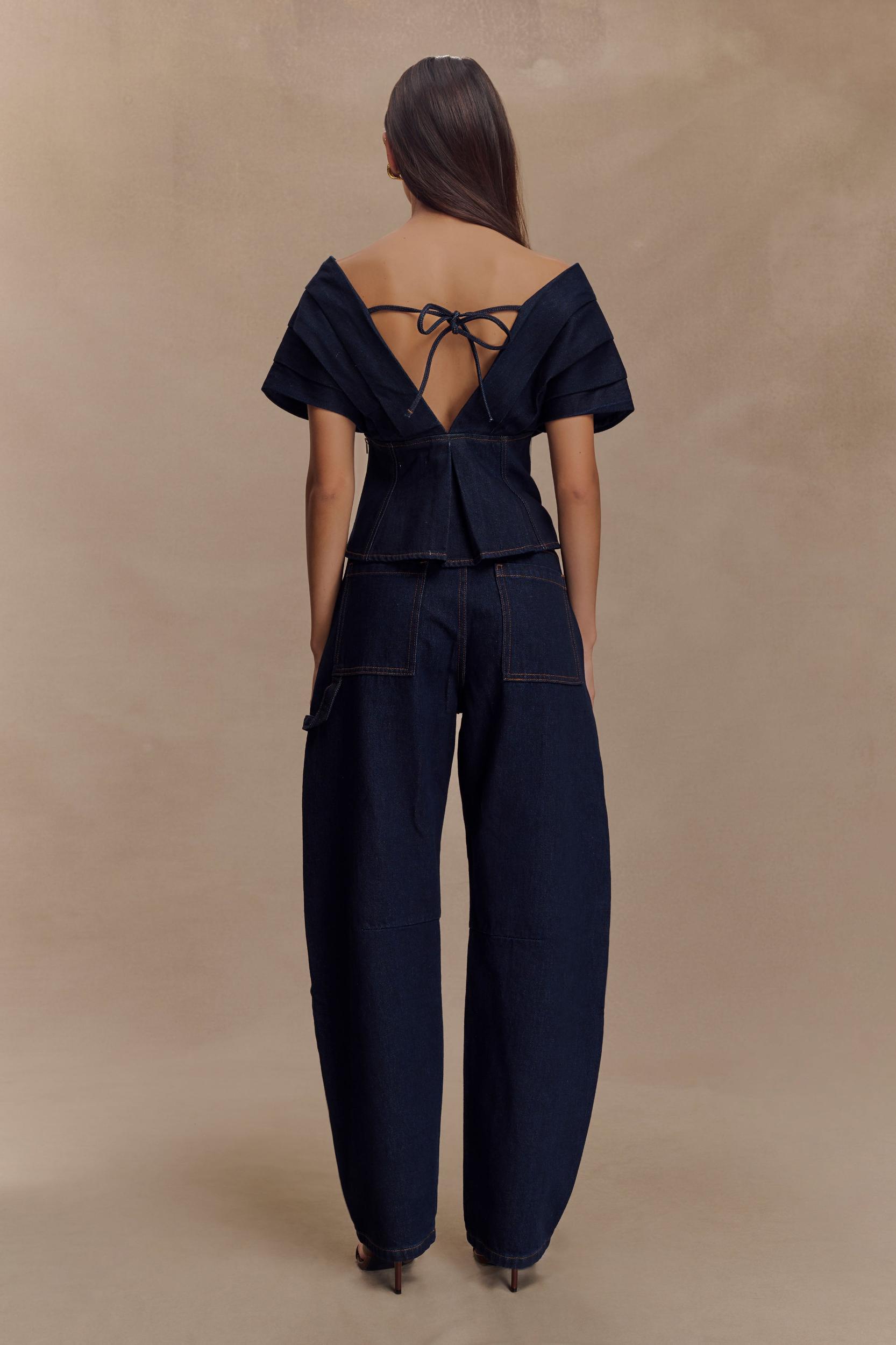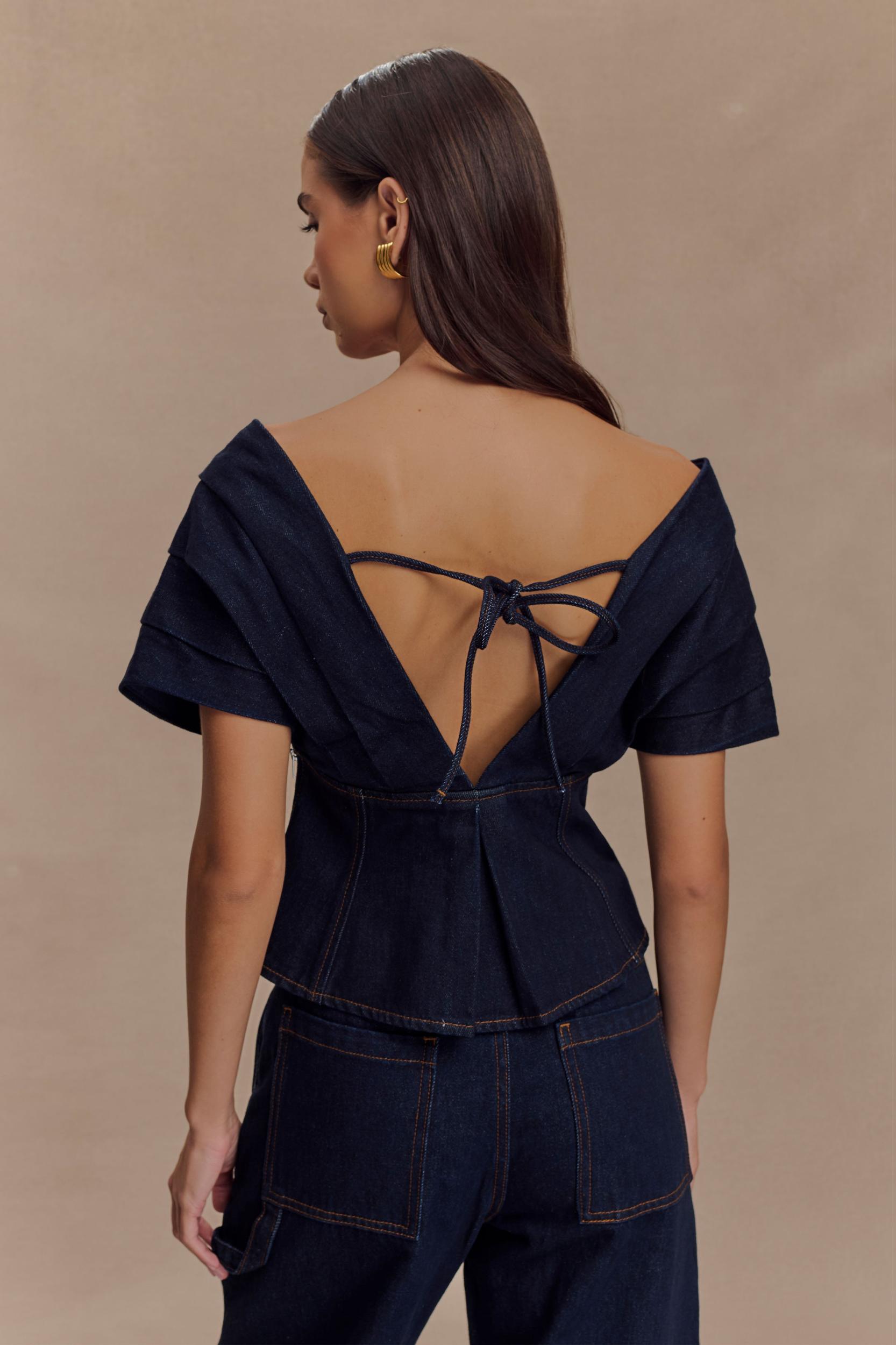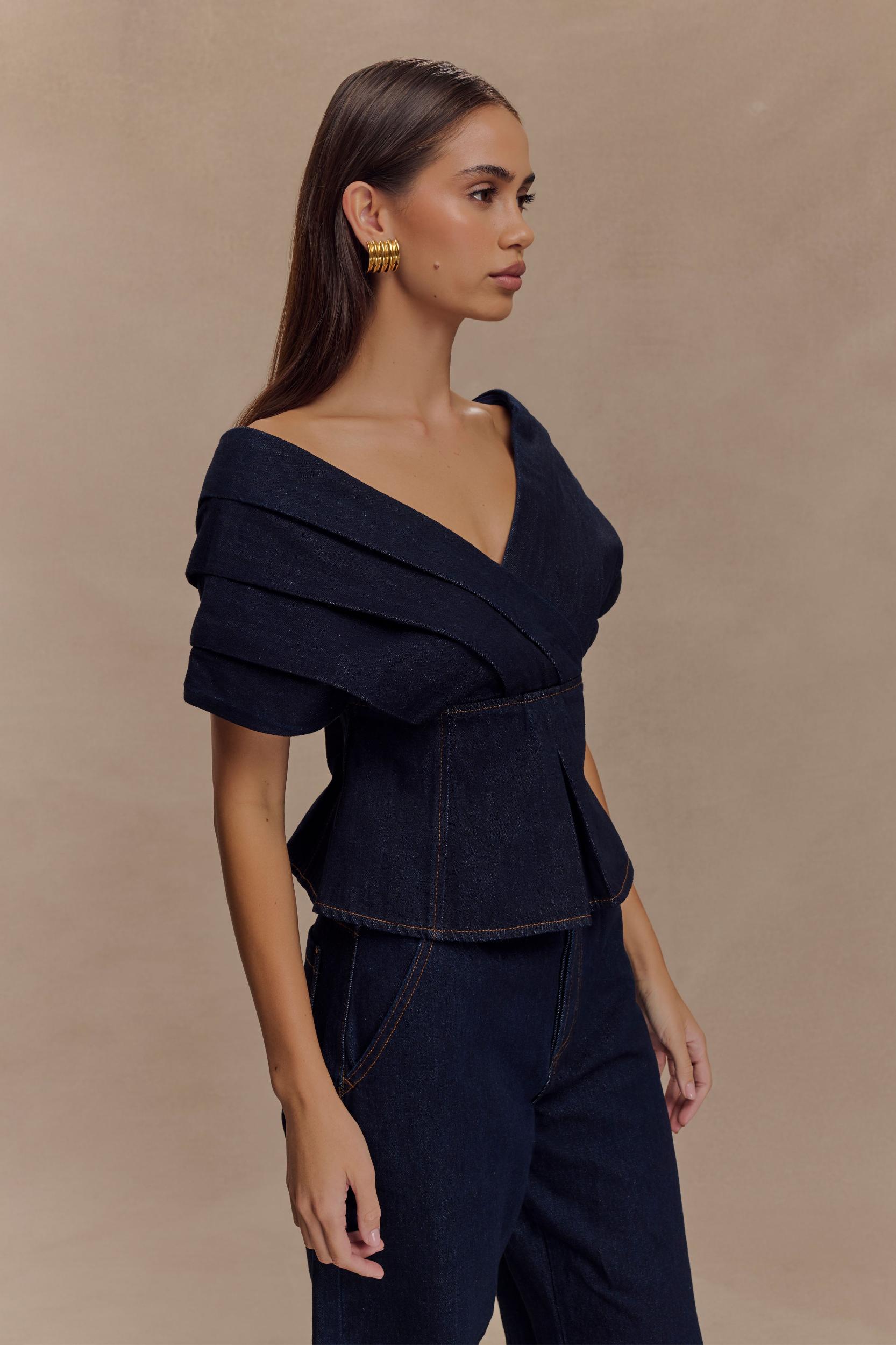 Soft edge, structured style. The RAYNE Off Shoulder Denim Top brings a relaxed elegance to structured dressing. Featuring a flattering V neckline and off-the-shoulder silhouette, this top is designed with an adjustable back strap for a custom fit. The relaxed shape balances effortlessly with its tailored finish, while the side zip and full lining ensure comfort and ease. Pair with the Rayne Wide Leg Denim Jeans for a double denim moment that feels fresh, modern, and endlessly wearable.