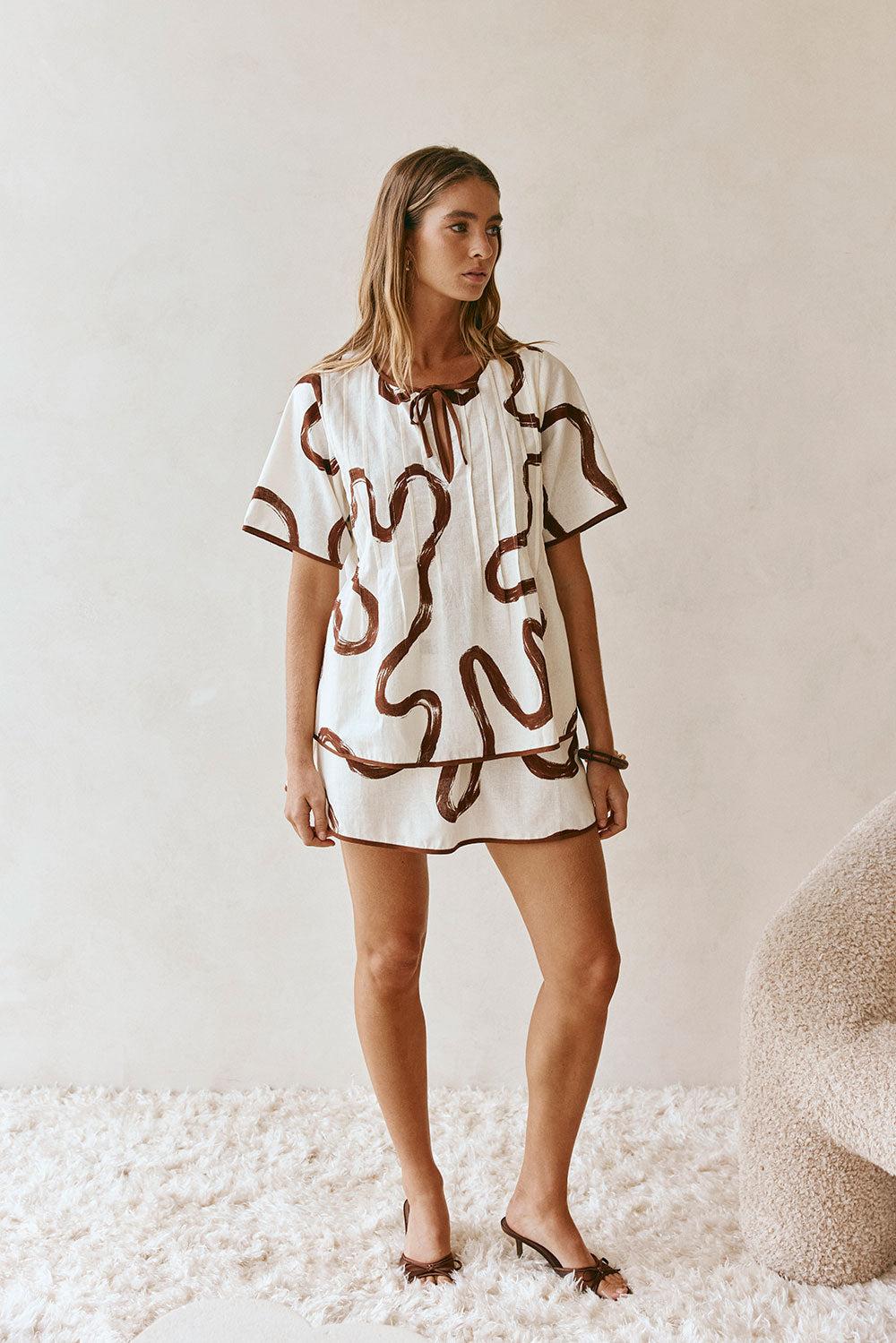 Introducing our Rayne set from our Sono Arte collection - The Rayne Top is made from a natural linen cotton blend fabric with our exclusive Marbled Mocha print. It is a relaxed fit and features contrast chocolate bind trims, split at centre neck with tie closure, short boxy sleeves, pintuck details across top and a flouncy flared hem. Get the look with the Rayne Skirt. Designed exclusively by Sabo.