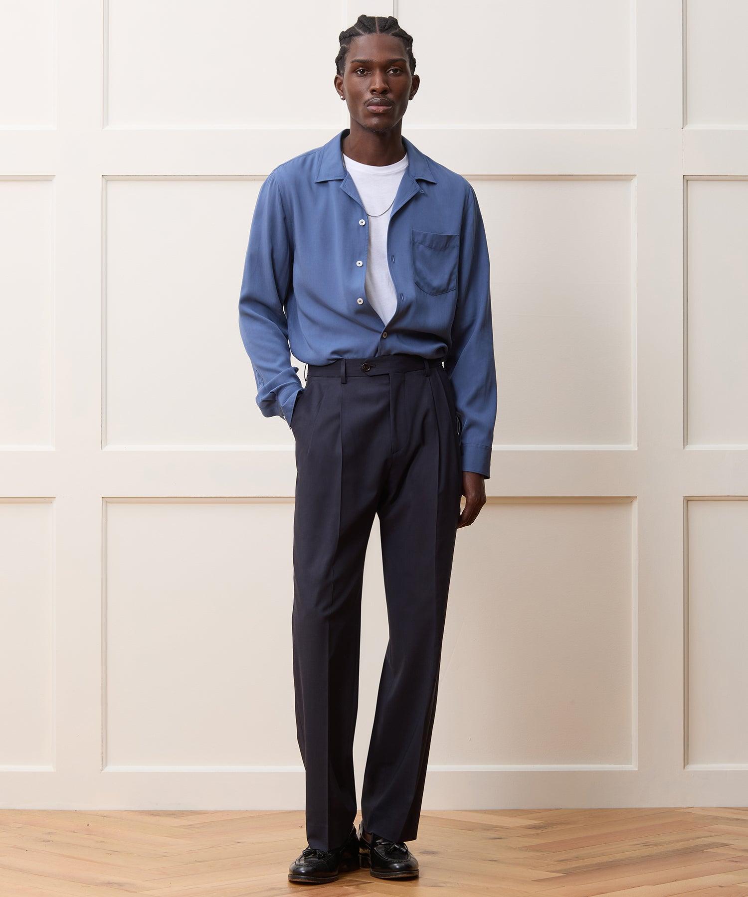 All the laidback style of our bestselling Camp Collar Shirts, now in a new, long-sleeved silhouette. This easy-wearing shirt is made from a soft-but-solid rayon fabric that works well all on its own, layered and worn open over a tee, or even worn underneath a suit jacket or sport coat to add a casual pop of color to your look. 70% Viscose, 30% Lyocell Slim Fit Model is 6'1" and is wearing a size Medium Single Chest Pocket Camp Collar Made in China Dry clean or machine wash cold, gentle cycle, with like colors. Do not bleach. Tumble dry low, cool iron as needed. Style SH1040915