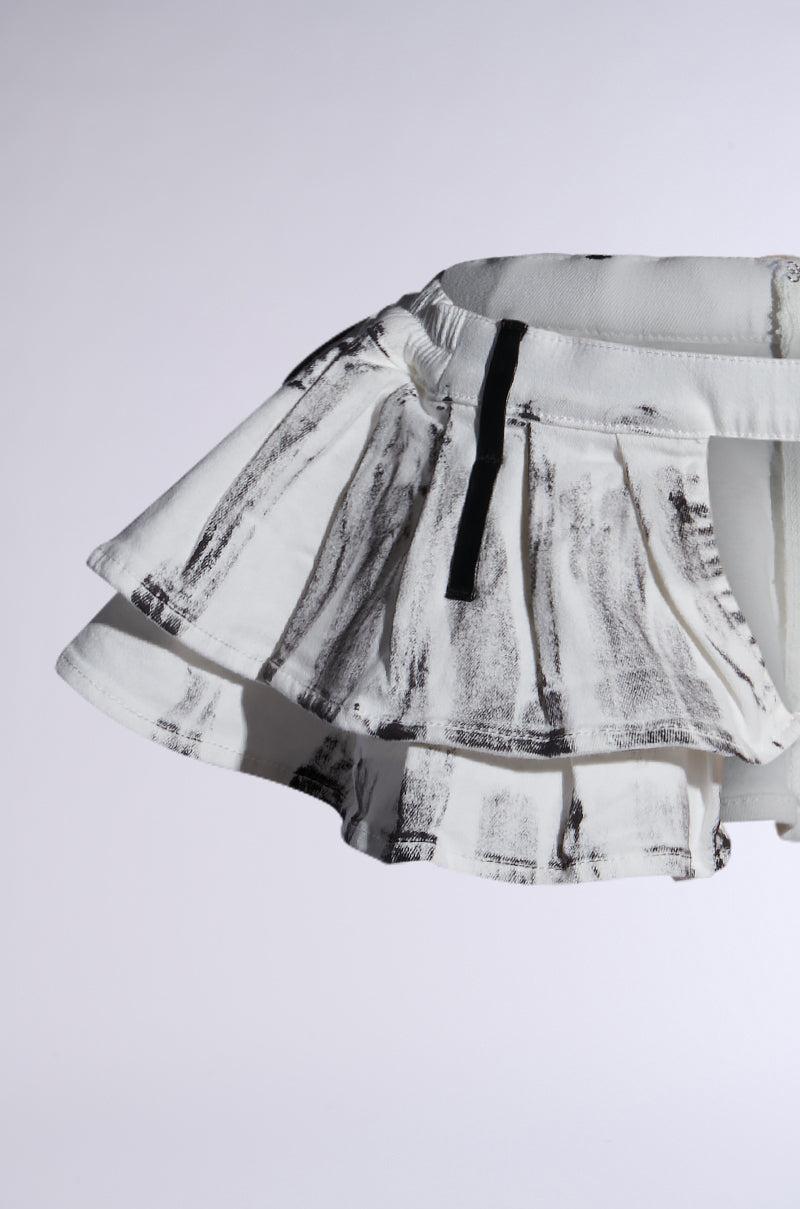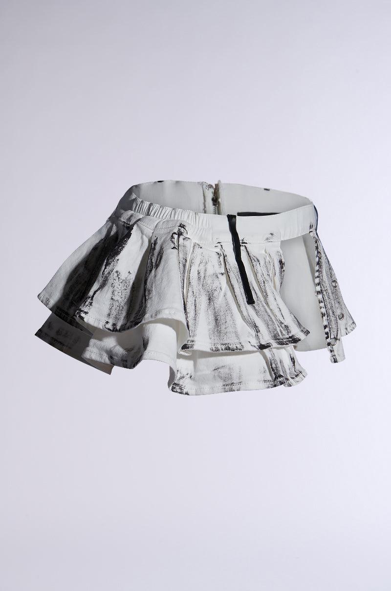 Add flair to any outfit with The AKIRA Label Rayray Washed Denim Belt Skirt. This sassy accessory is crafted from a cotton denim base and features contrast acid wash detailing throughout, elasticized detailing on each side of the waistband for a comfortable fit, a layered ruffled construction that creates a high-low peplum silhouette, and faux leather belt loop accents. Complete with faux silver grommet hardware scattered throughout one side of the belt, and an exposed metallic back zipper closure. Pair atop baggy cargo pants to show off your drip. - Shell: 98% Cotton 2% Spandex- Slight Stretch- Imported (all measurements approximate from size S/M)- 32” Circumference (stretchy)- 7.5” Top to Bottom Hem Product ID: 467140