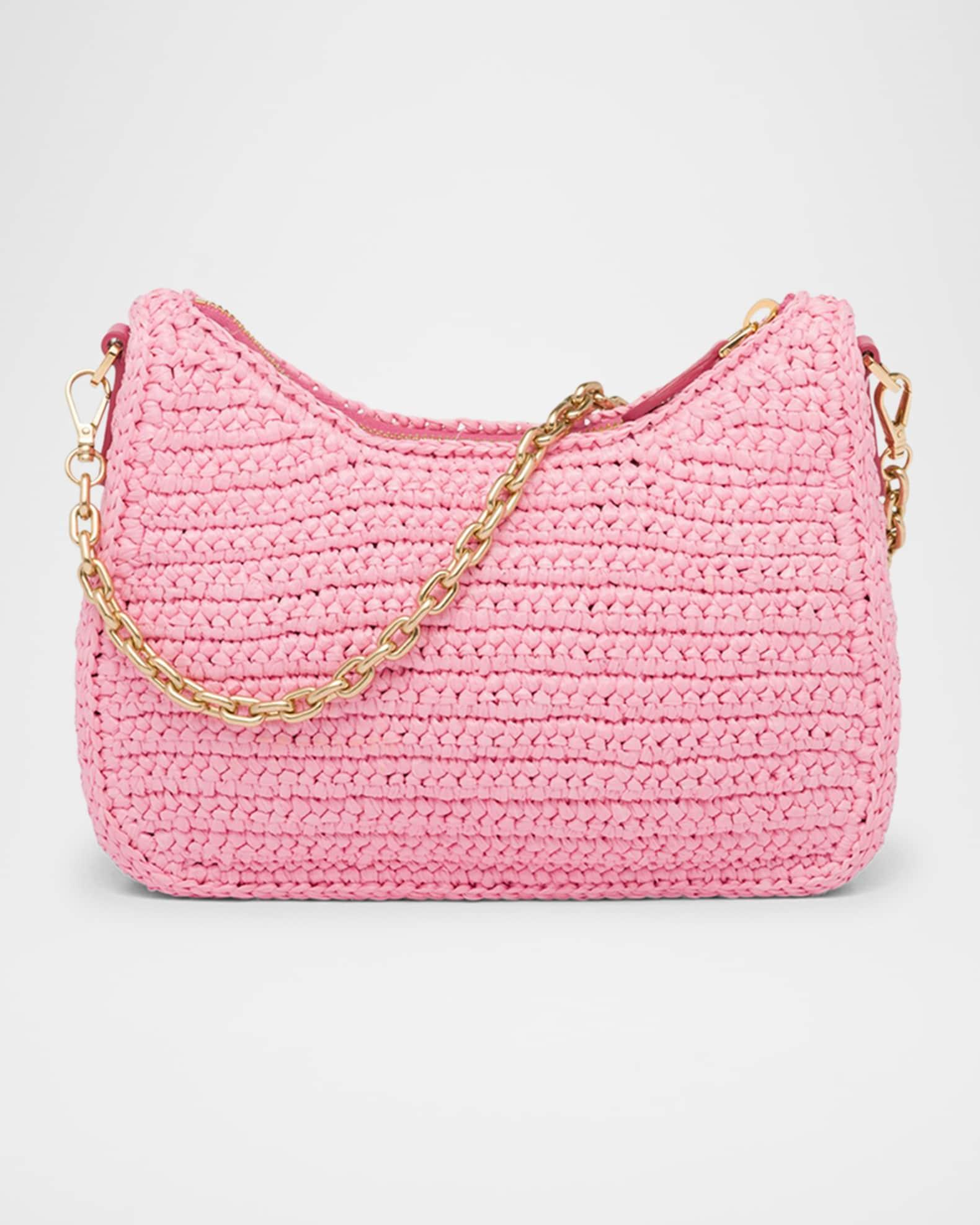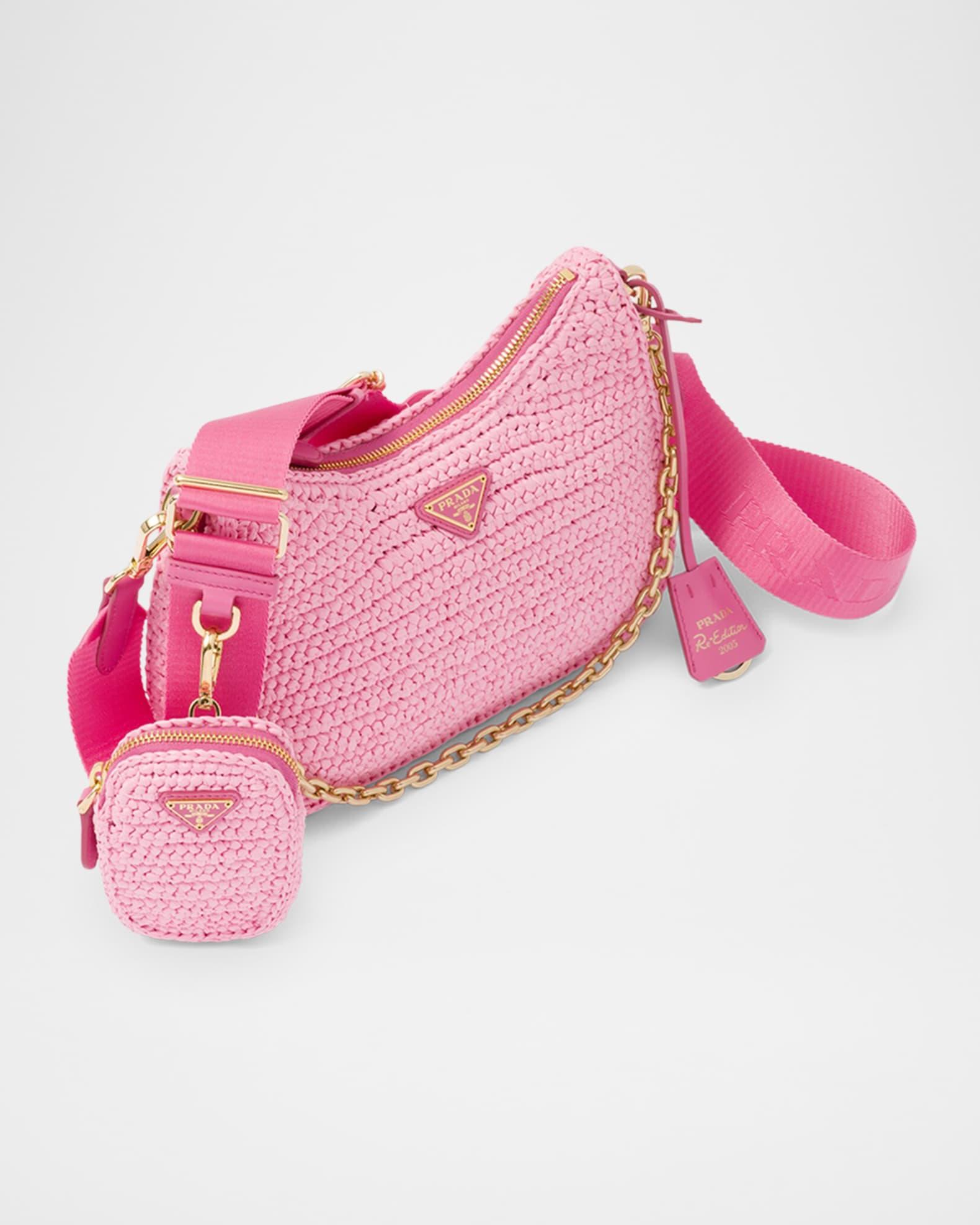 Inspired by the iconic nylon mini hobo bag, the Prada "Re-Edition 2005" raffia-effect crochet shoulder bag is crafted in viscose with smooth leather details. Detachable top handle chain Detachable web shoulder strap; 33.5" long Removable zip pouch and Re-Edition key ring Zip top closure Exterior, enameled triangle logo on the front Re-Nylon logo-print lining Metal hardware Approx. 7.1"H x 8.6"W x 2.4"D Imported