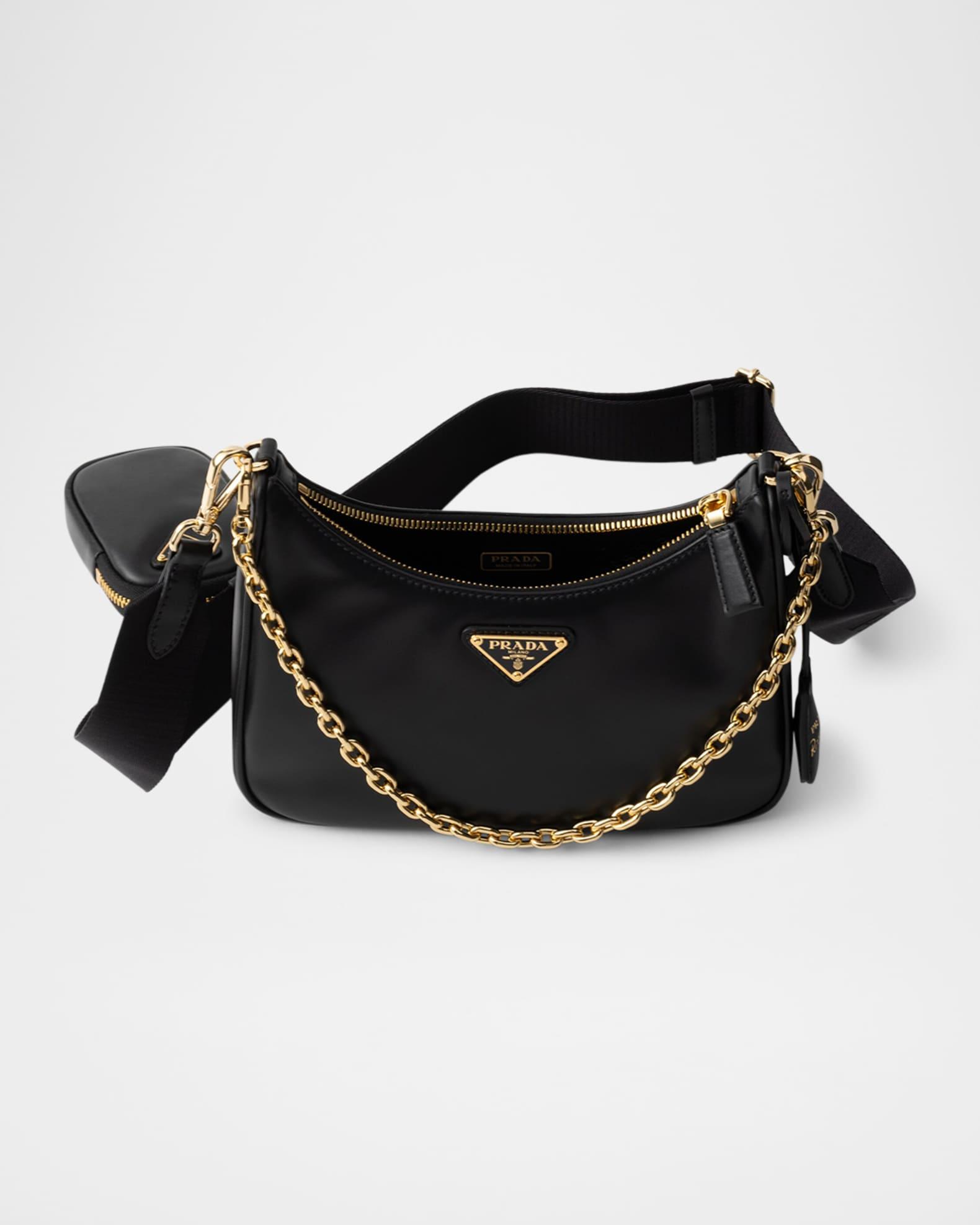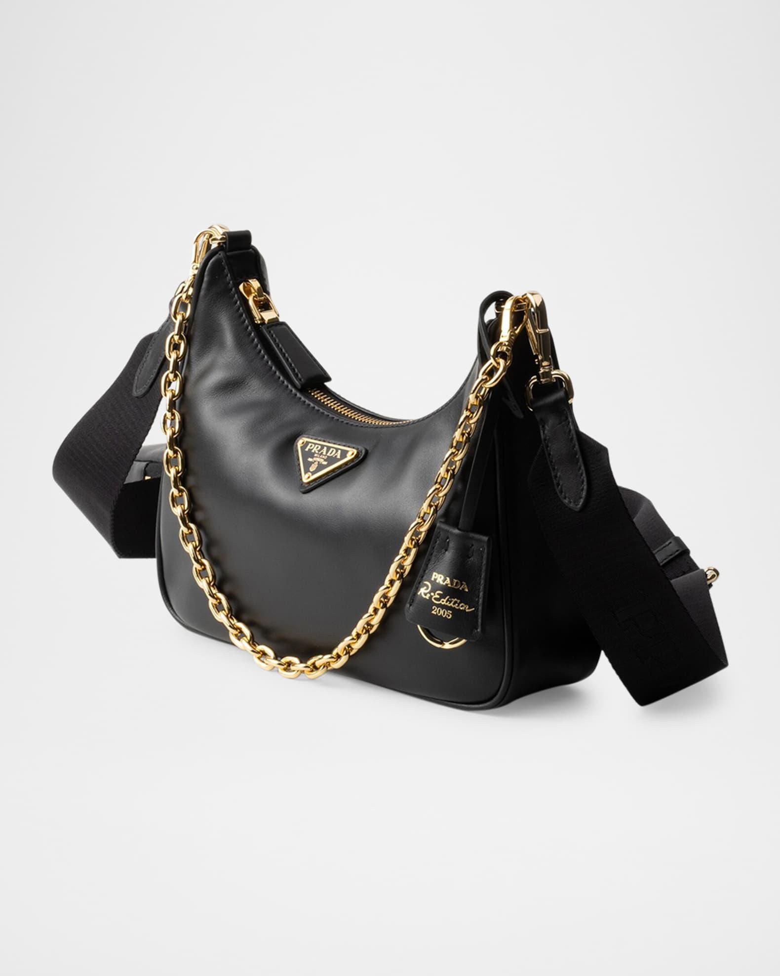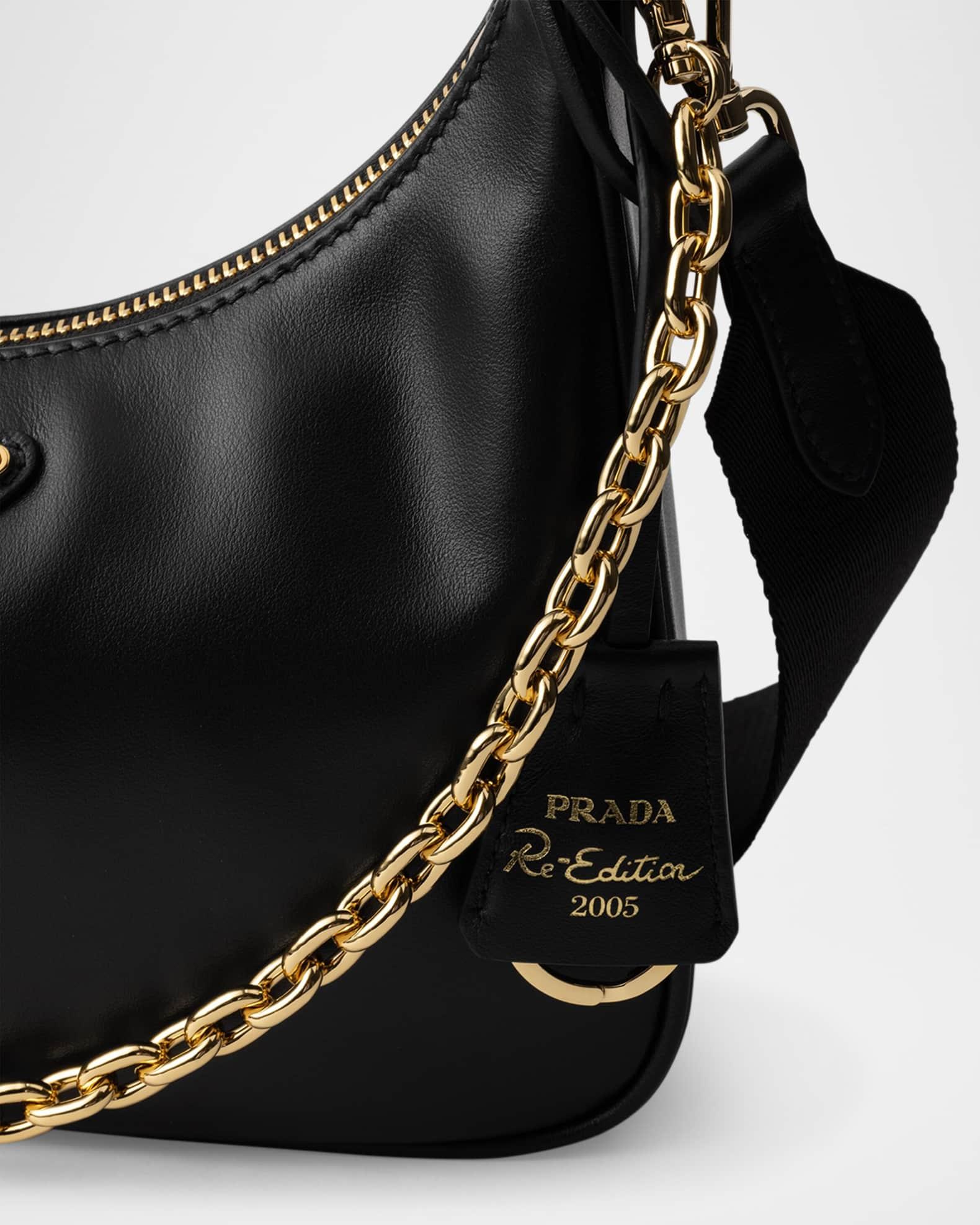 Prada "Re-Edition 2005" shoulder bag in leather features the signature enameled metal triangle logo on the front Detachable chain top handle Detachable web shoulder strap; 16.9-23.6" drop Can be worn as a top handle or shoulder/crossbody bag Detachable leather zip pouch and Re-Edition key ring Zip top closure Logo-print lining in nylon Metal hardware Approx. 7.1"H x 8.7"W x 2.4"D Imported