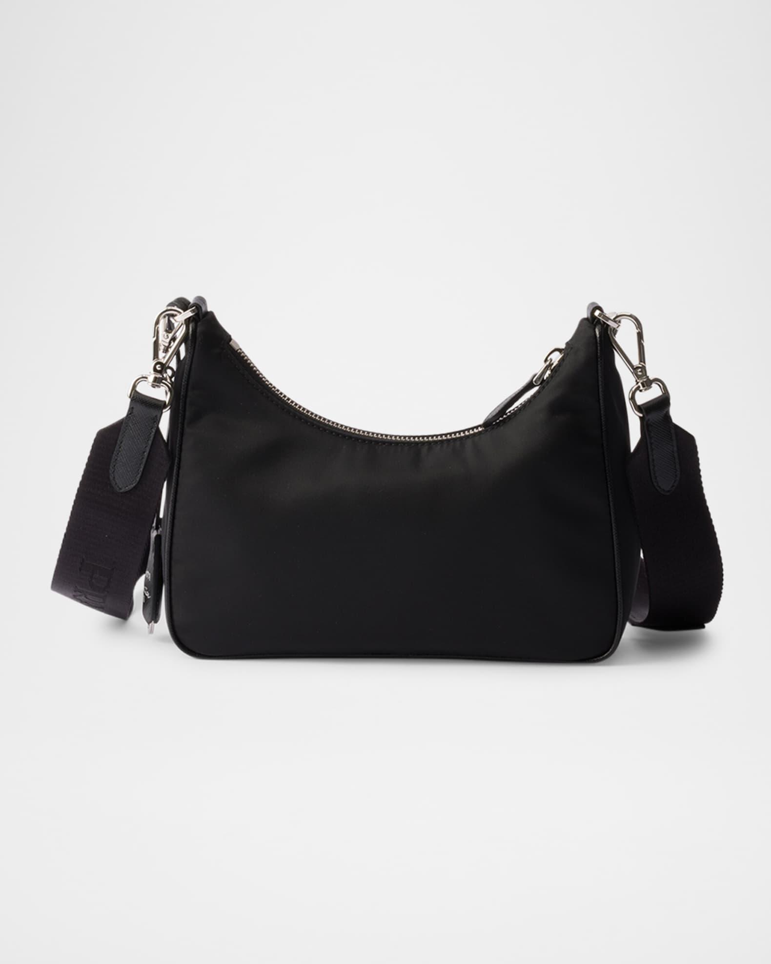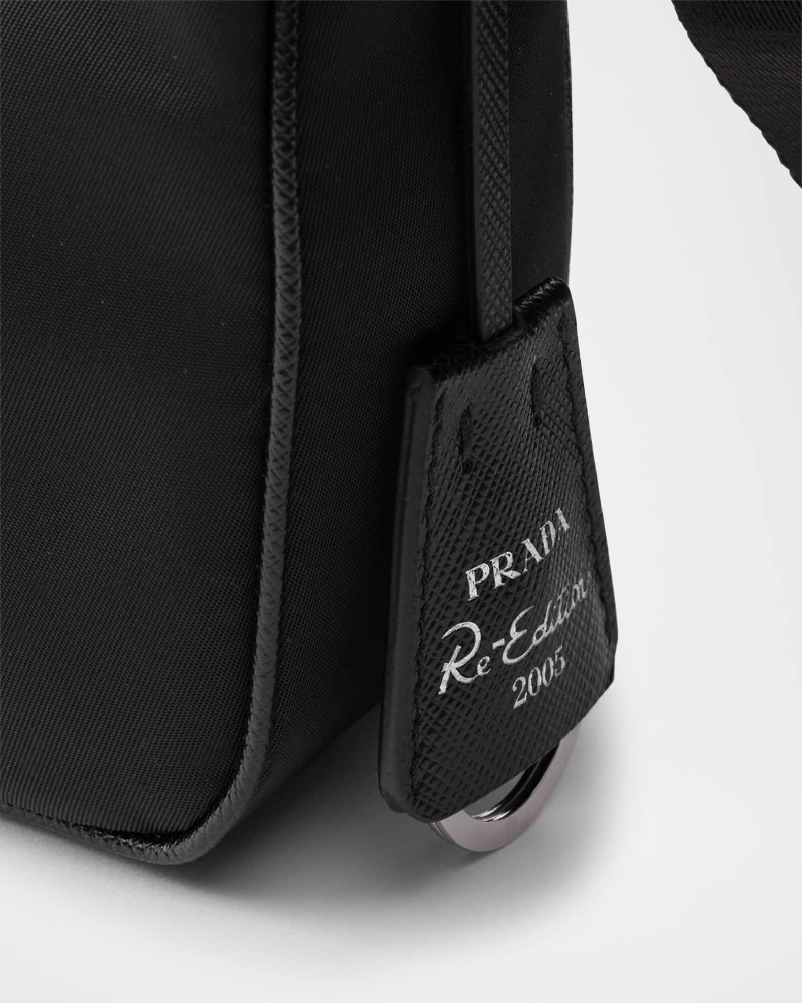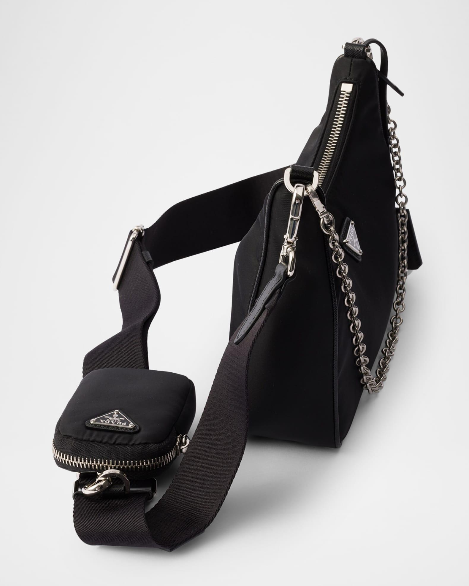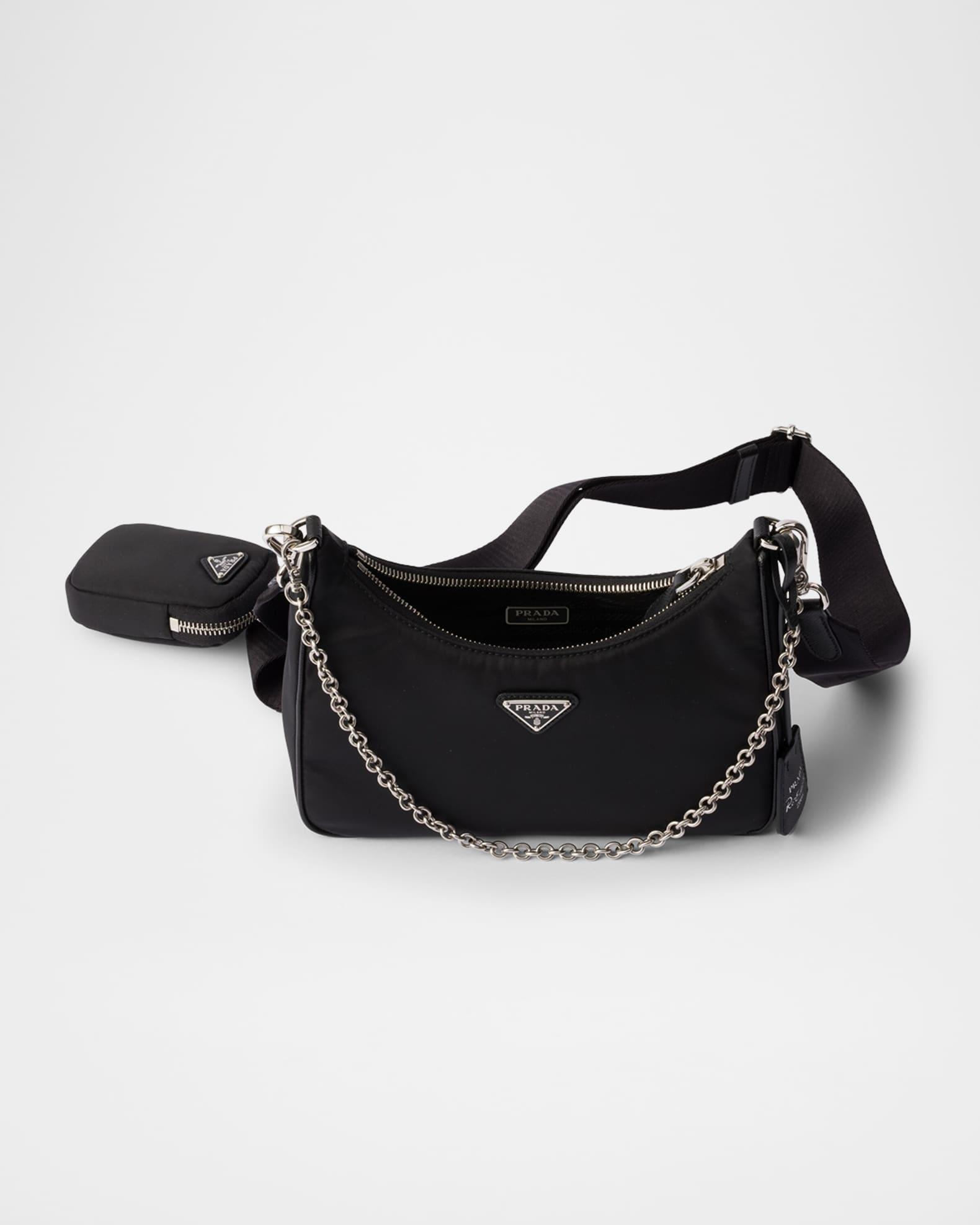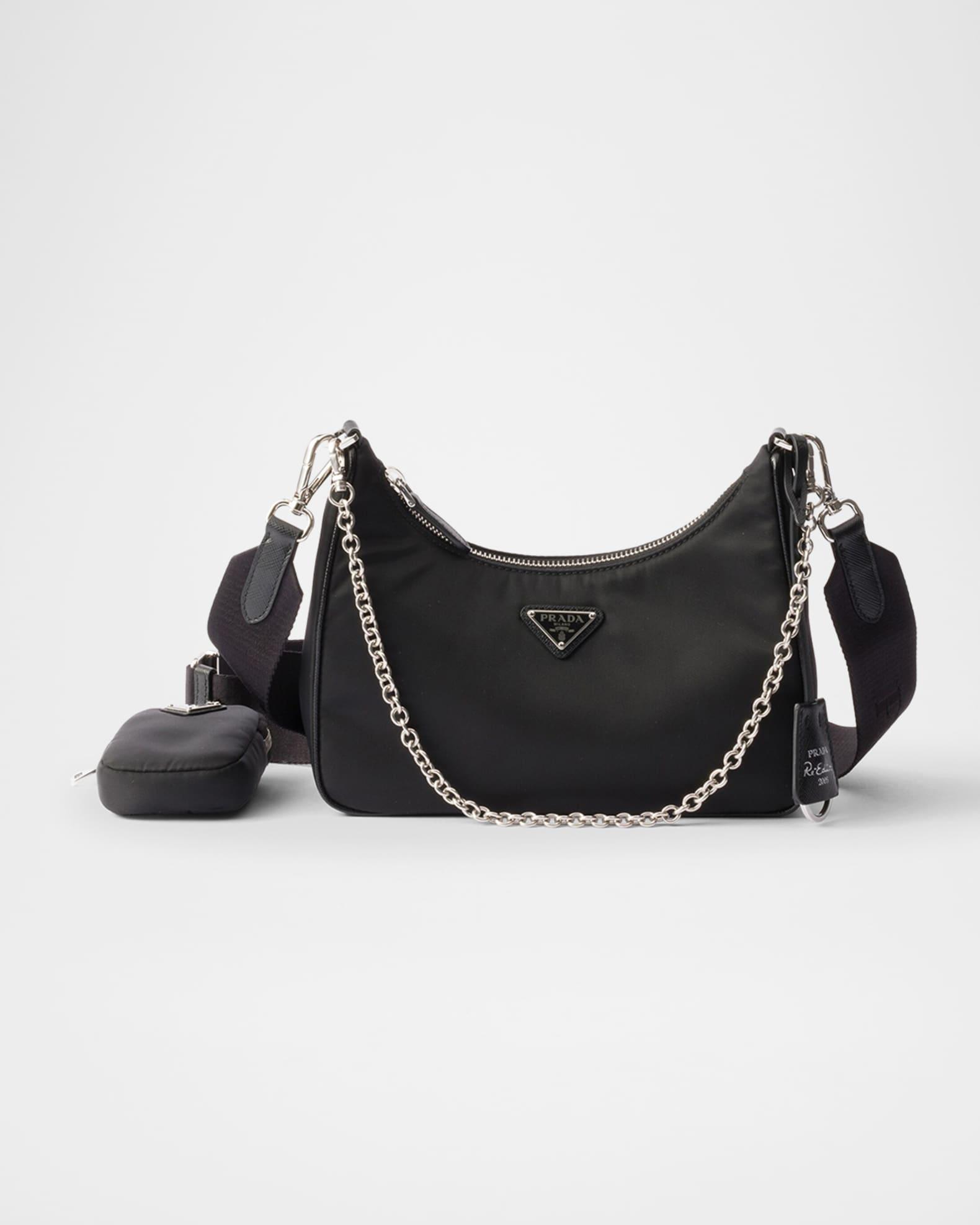 Prada "Re-Edition 2005" shoulder bag in Re-Nylon with Saffiano leather trim Features the signature enamel triangle monogram Detachable chain top handle Detachable, adjustable web shoulder strap Detachable Re-Nylon zip pouch and Re-Edition keychain Can be worn as a top handle and shoulder bag Zip top closure Re-Nylon logo lining Metal hardware Approx. 7.1"H x 8.7"W x 2.6"D Imported
