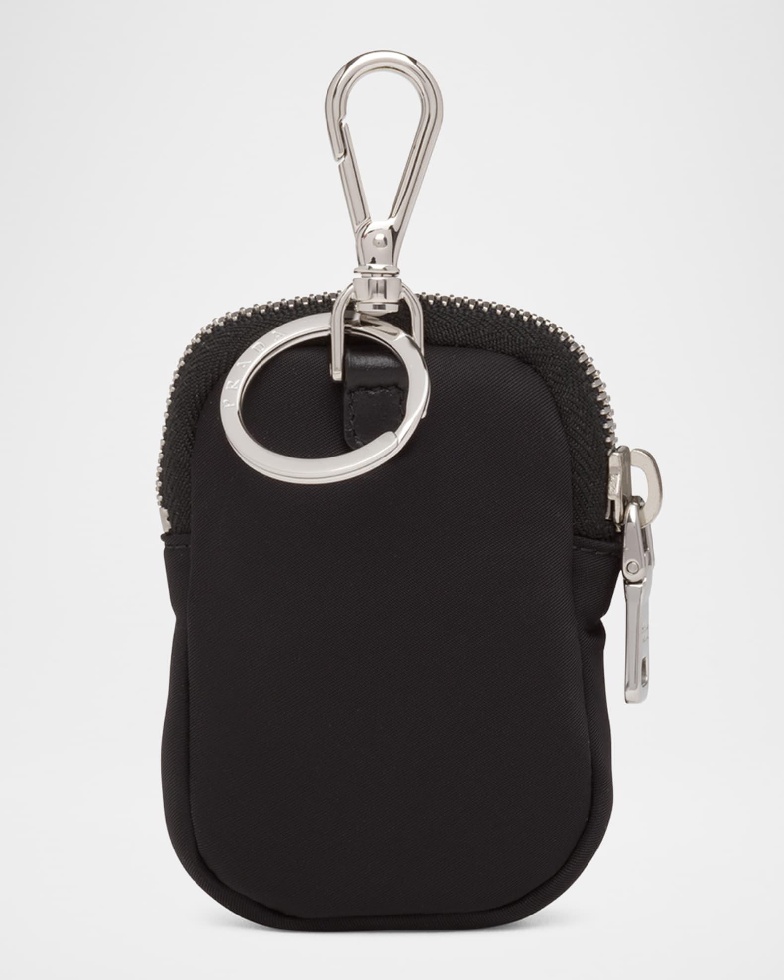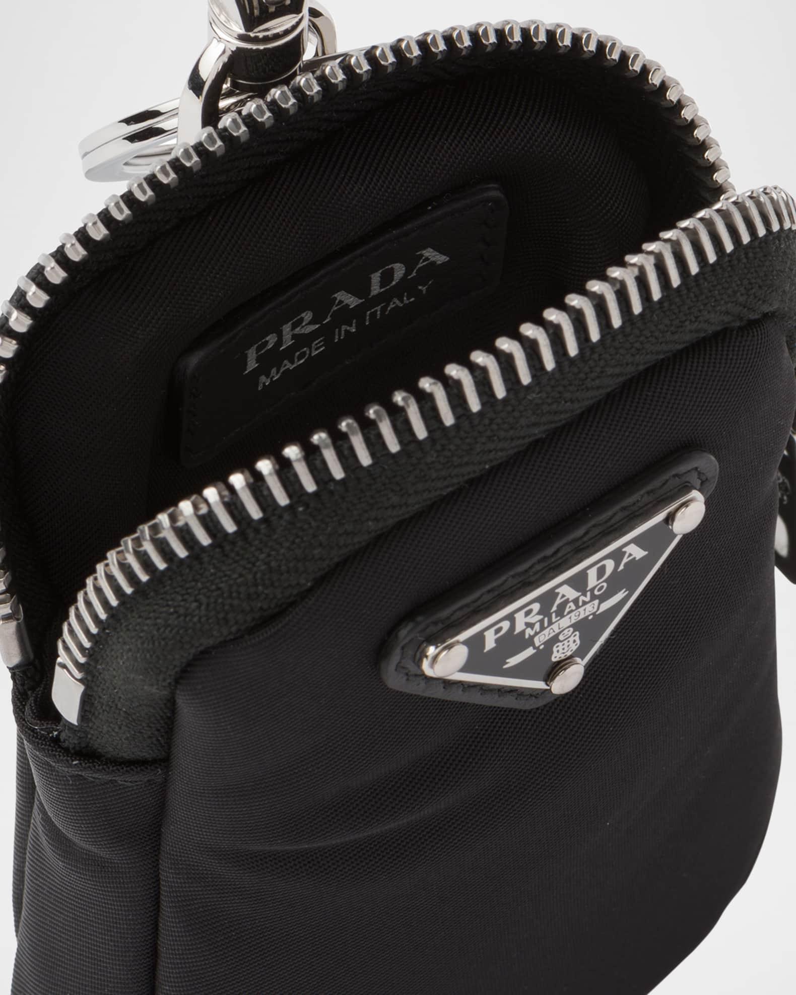 Prada padded mini-pouch made of Re-Nylon defined by the iconic enameled metal triangle logo Re-Nylon is regenerated nylon yarn produced from recycled, purified plastic trash collected in the ocean, fishing nets and textile waste fibers Keyring and lobster clasp Zip closure Approx. 3.74"H x 2.56"W Dry clean Imported