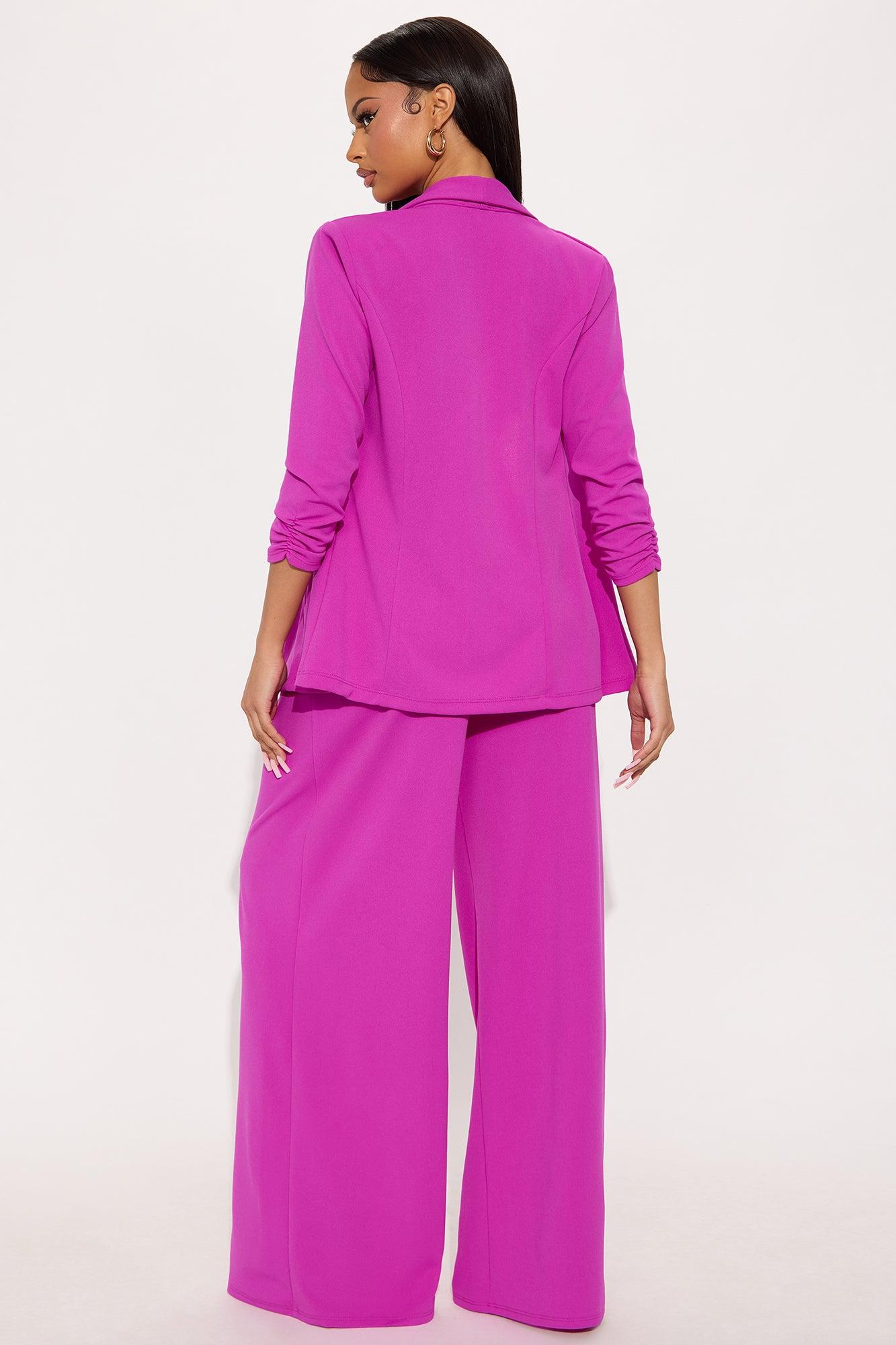 Available In Brown, Magenta And Royal. 2 Piece Ensemble Open Blazer And Wide Leg Pant Set Stretch Inseam 33" Elastic Waistband On Pant Self : 95% Polyester 5% Spandex Imported