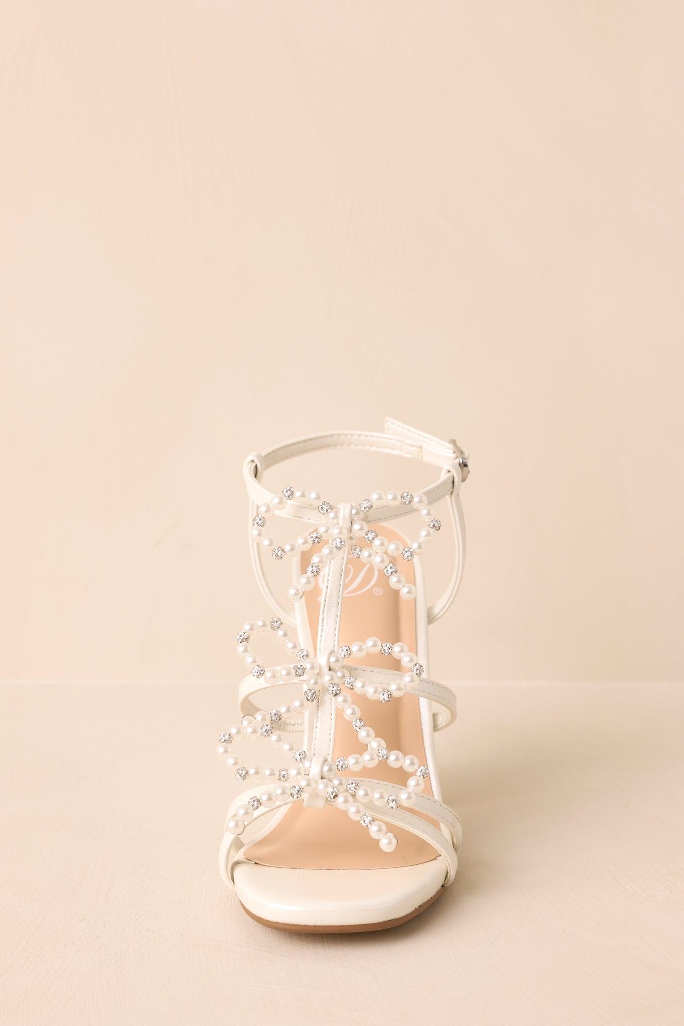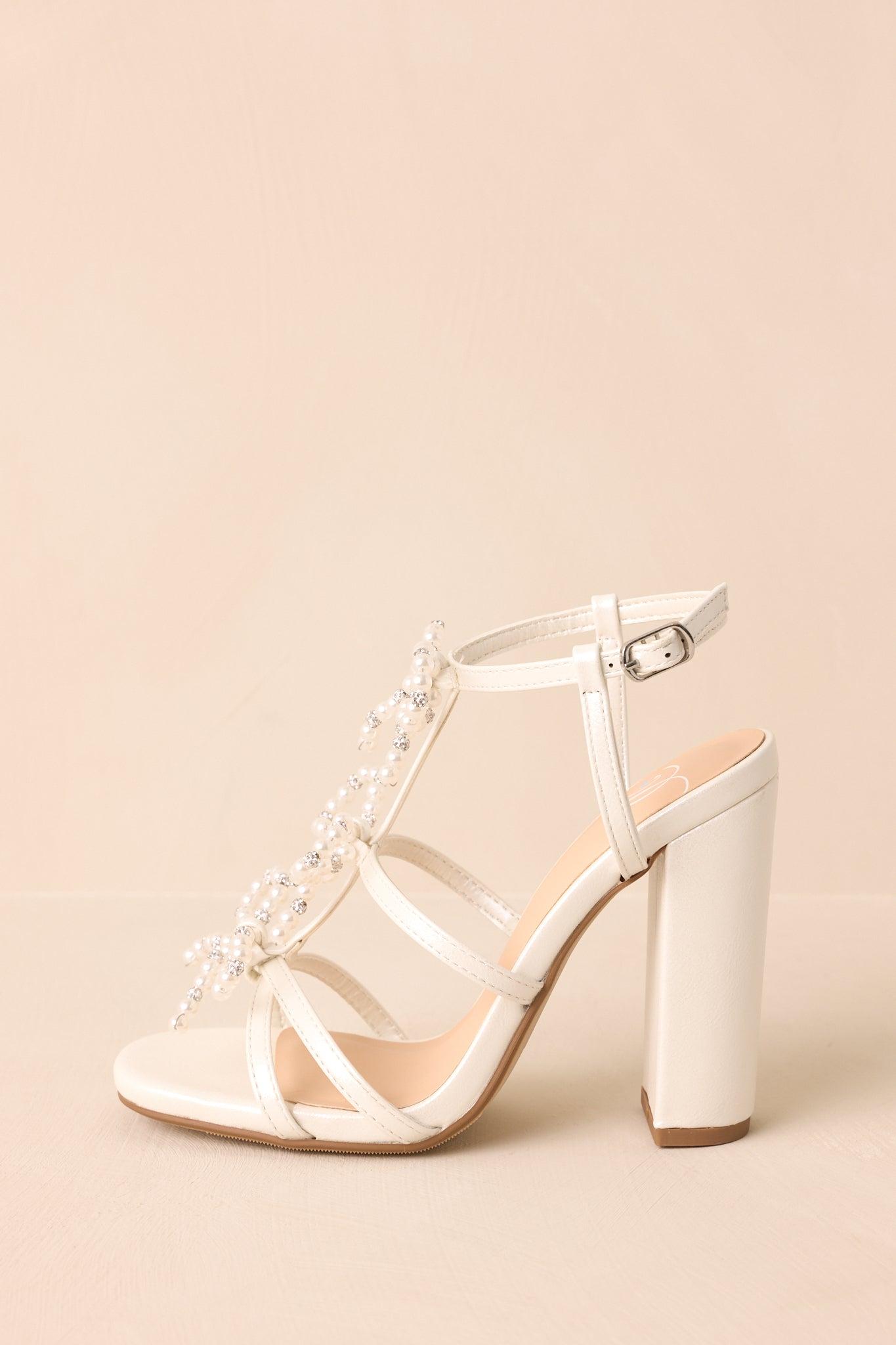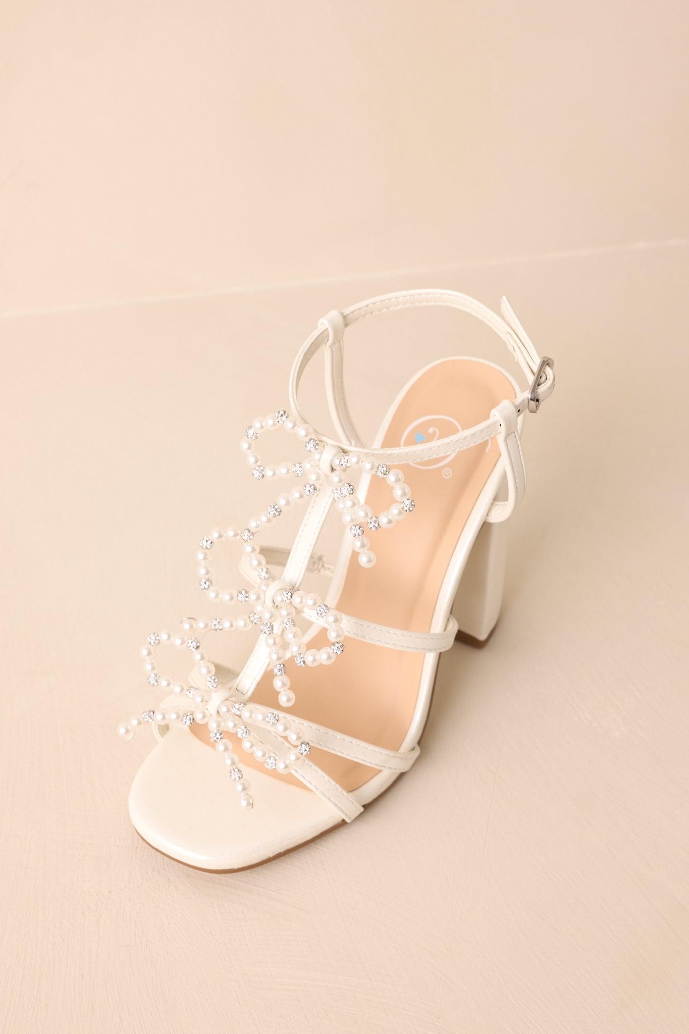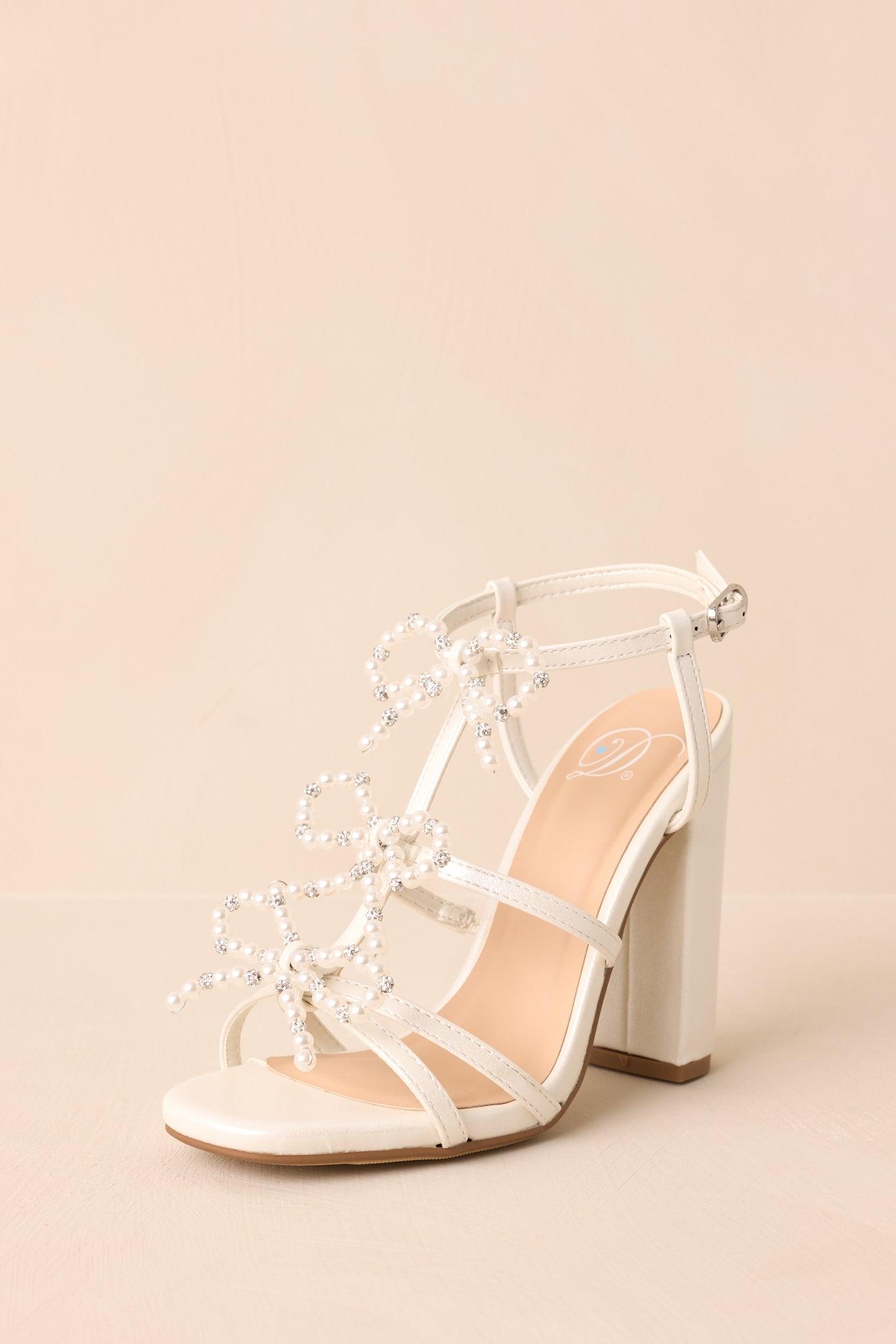 The Reaching Higher Ivory Pearl Bow Front Ankle Strap Heels are for the moments when you're stepping into something more. Graceful and full of quiet confidence, they’re a reminder that every step forward deserves to feel special. These ivory heels feature an ivory faux pearl & rhinestone three bow front, a subtle sparkly finish, a block heel, and an adjustable ankle strap. Heel measures 4" Man made materials Manufactured in China Designed in The USA True to Size