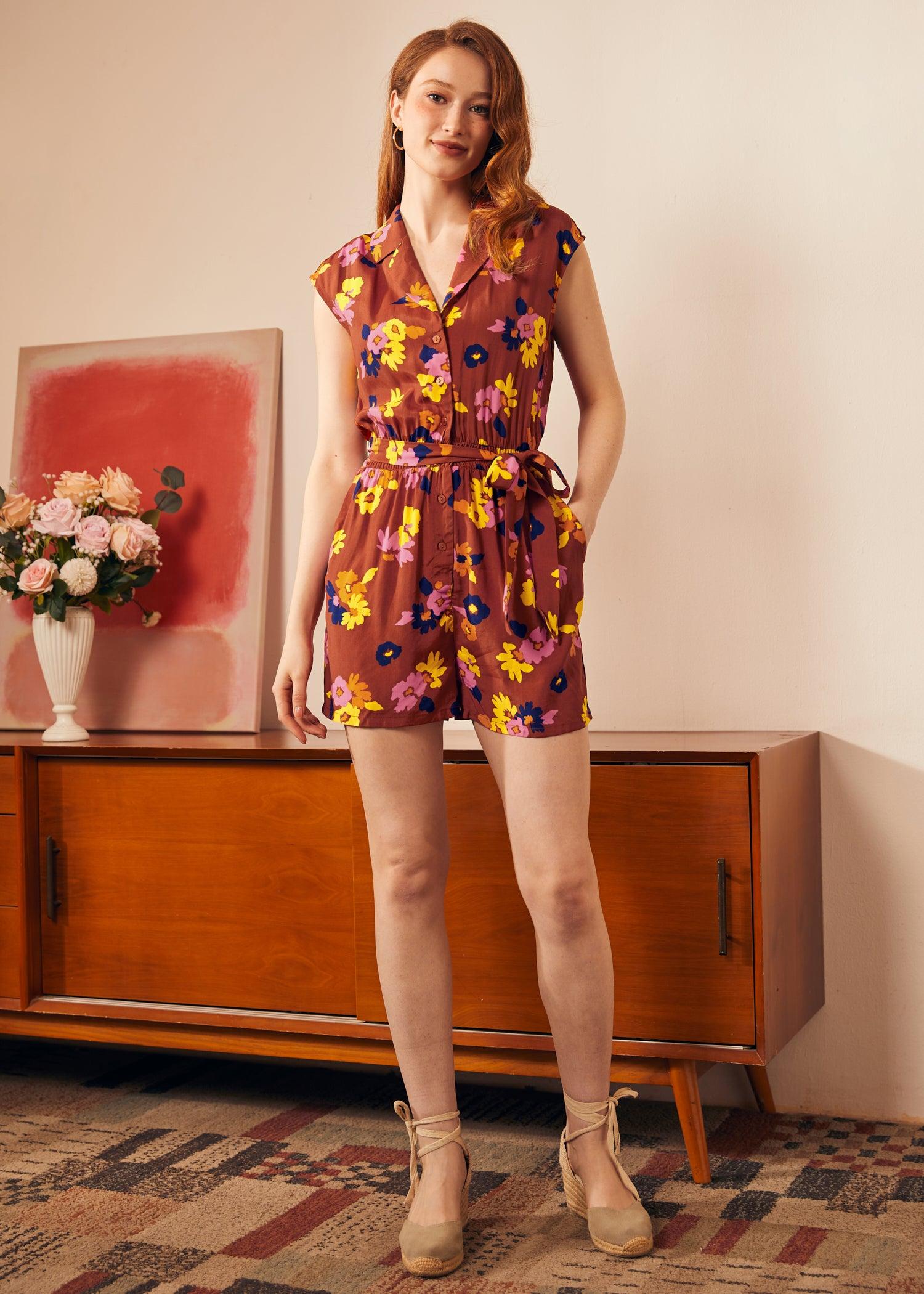 Spend a winning afternoon with a compelling read, a cup of tea, and the lovely comfort of this sleeveless rust-hued romper from our ModCloth namesake label. Channeling pin-up style vibes, this timeless woven one-piece boasts a hand-drawn floral print in shades of yellow, pink, and navy blue, button-up closure at the front, a stylish V-neckline with a notched lapel collar, a sash-tied waistline, an elasticized panel at the back for ease of fit, and is complete with handy side pockets. 53% Viscose, 47% Rayon. Machine wash. Side pockets. Semi-sheer. Front button closure. Removable sash. Imported Fabric does not provide stretch. Elasticized waist. S=33 inches Length S=2.5 inches Inseam 1X=40 inches Length 1X=3.75 inches Inseam
