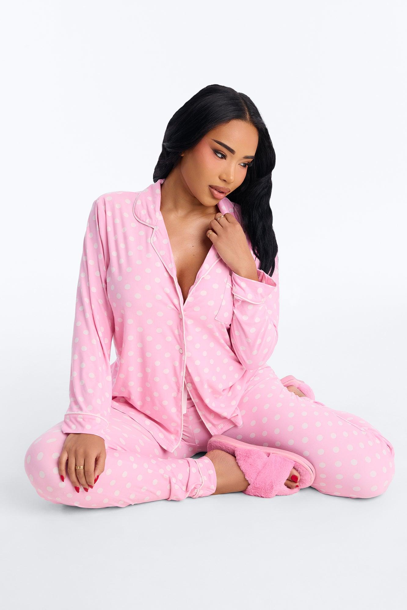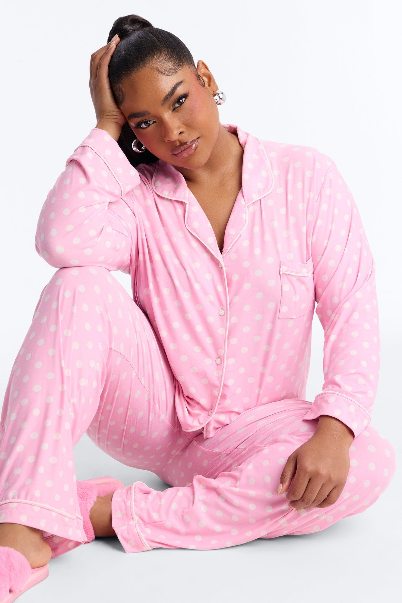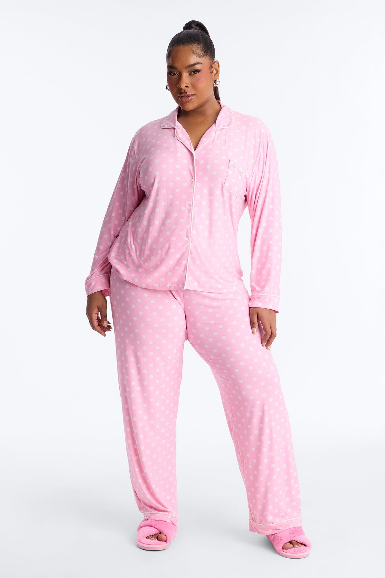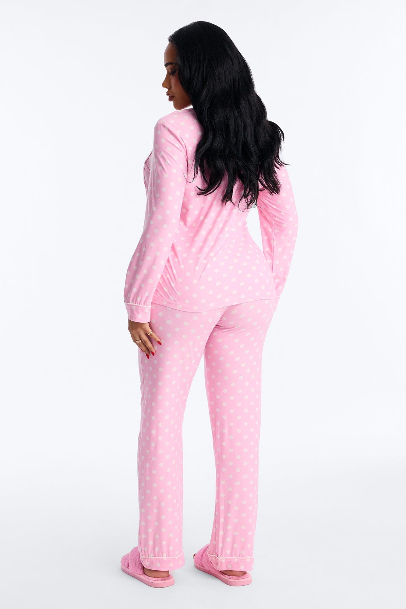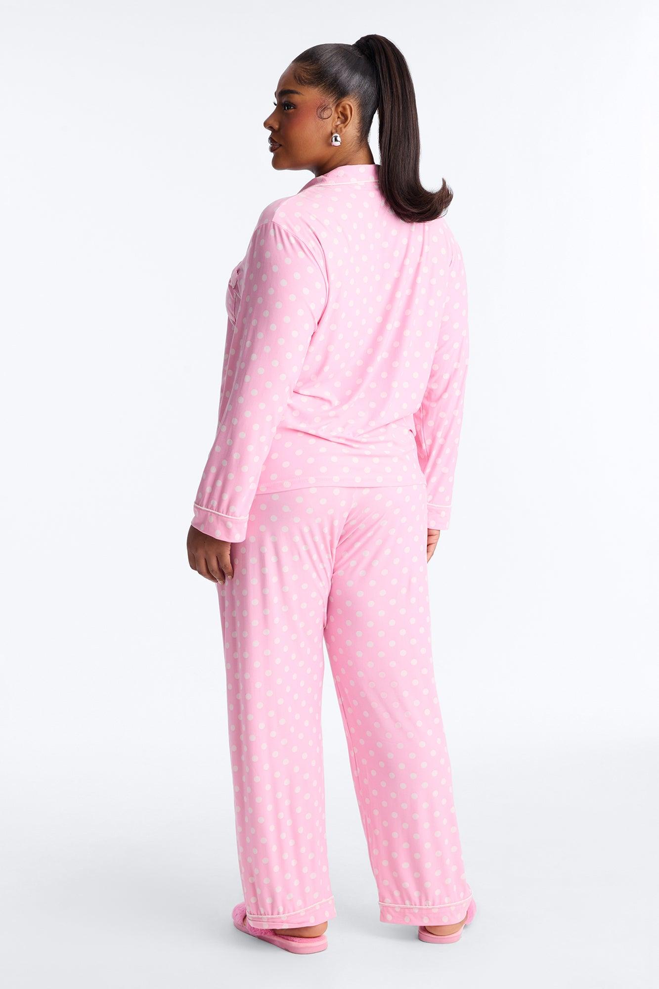 Available In Pink. 2 Piece Set Polka Dot Print PJ Button Up Top Long Sleeves Chest Pocket Contrast Trim Matching Pants Drawstring Stretch Final Sale Disclaimer: Print Placement May Vary. 95% Polyester 5% Spandex Imported