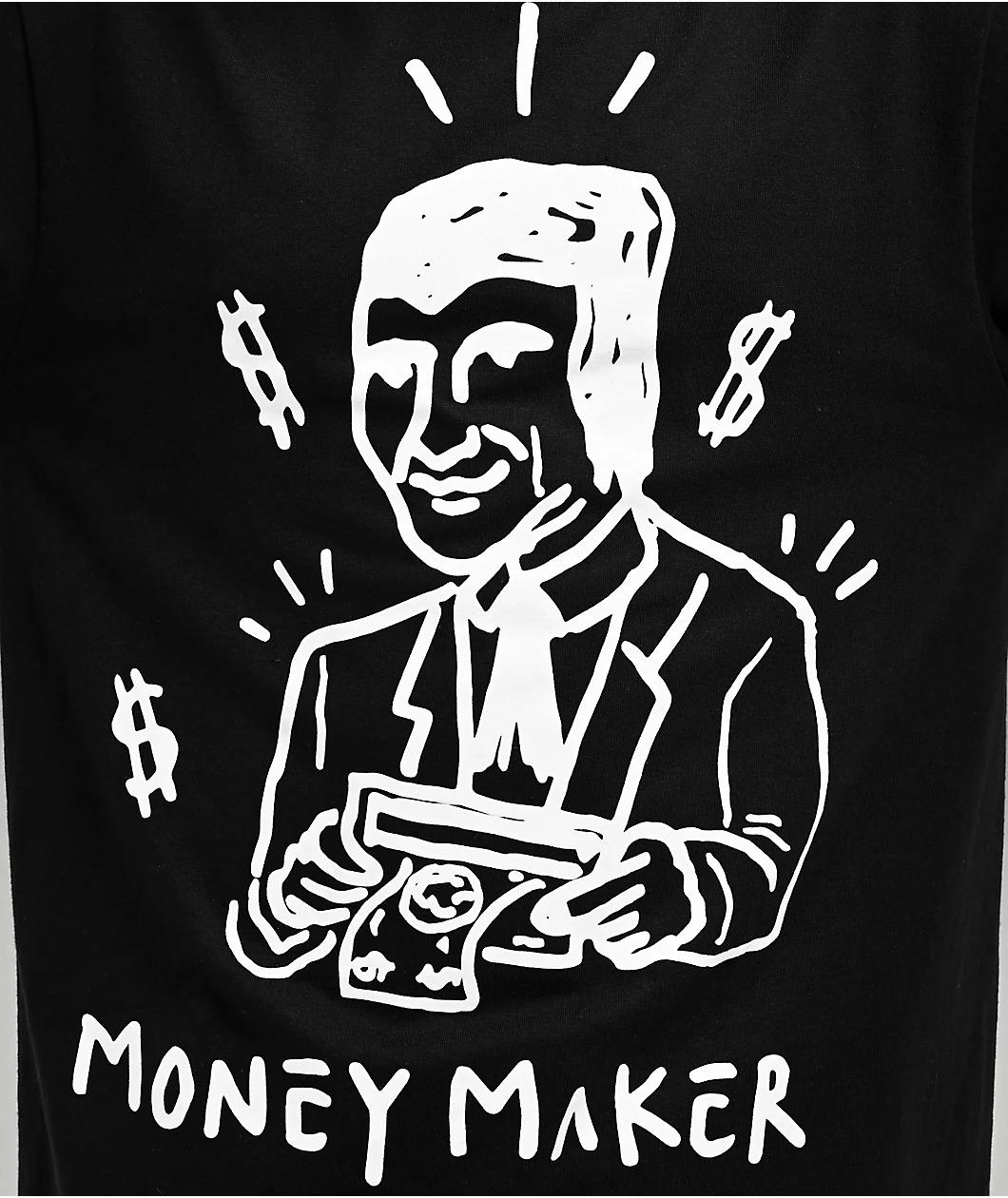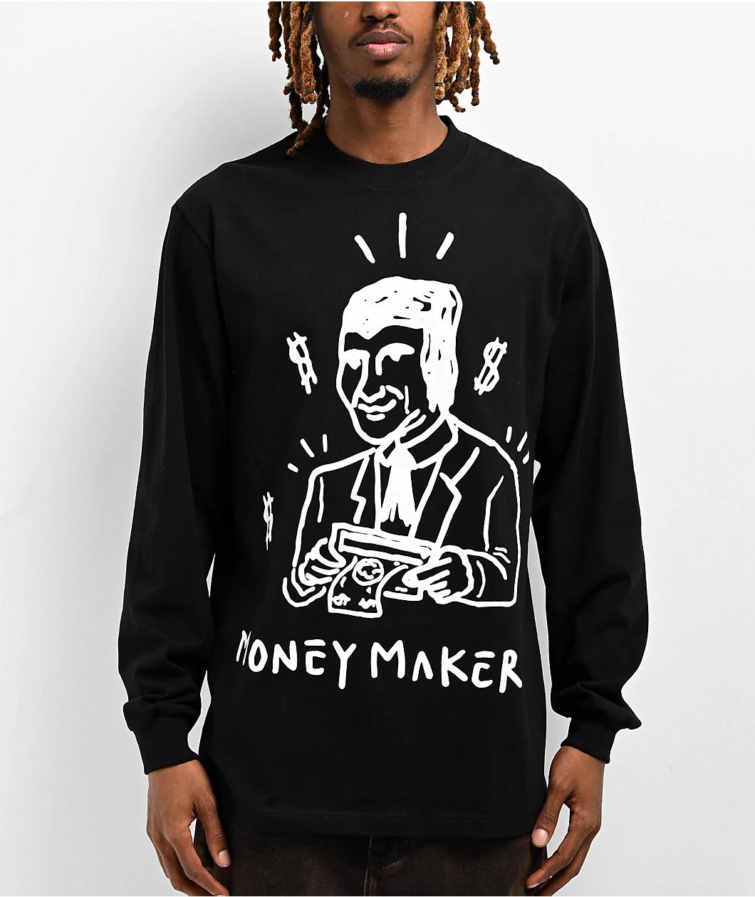Featuring artwork by Trevor "Trouble" Andrew, the Money Maker long sleeve t-shirt from Real Buy comes in a black colorway with white accents. A suited figure holding a money dispenser is featured on the chest, accompanied by "Money maker" in the arti