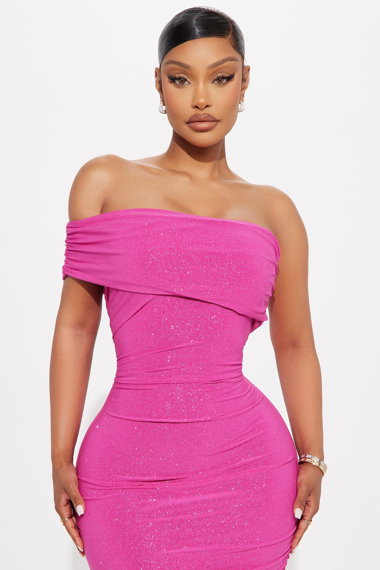 Available In Hot Pink And Black. Glitter Midi Dress One Shoulder Short Sleeve Ruched Lined Stretch Length Measured Flat = 45" Disclaimer: Glitter Will Transfer Due To Glitter Application. Self: 95% Polyester 5% Spandex Lining: 100% Polyester Imported California Proposition 65WARNING: Cancer and Reproductive Harm - www.P65Warnings.ca.gov.