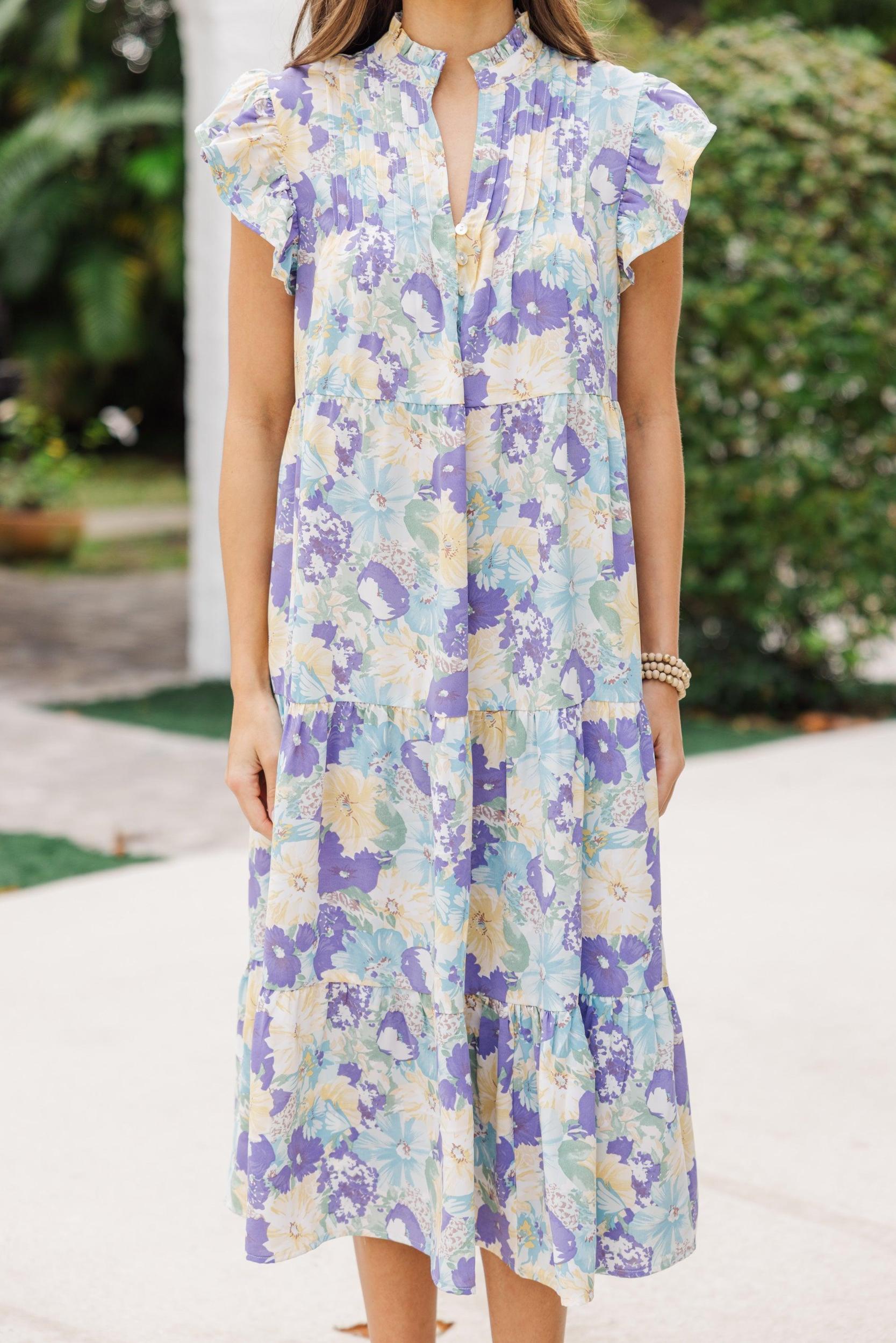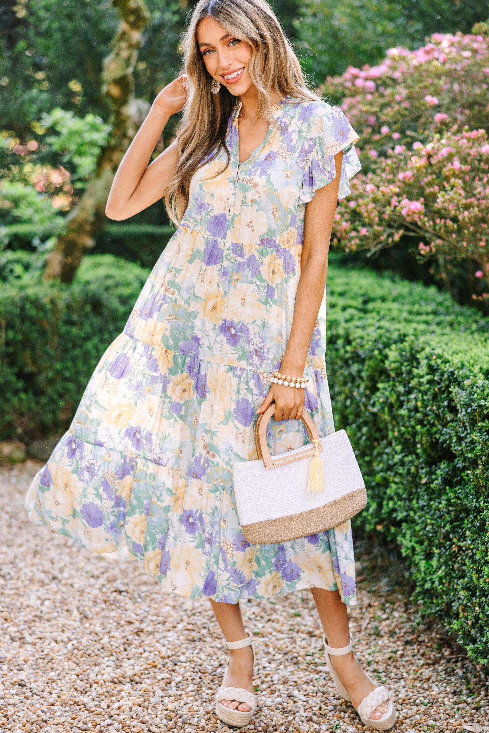 This Real Love Yellow Floral Midi Dress is the perfect choice for summer days! Create an unforgettable look with this light and flowy dress. Feel confident and beautiful as you flaunt the cute floral design. Partial button down v-neckline Short flutter sleeves Floral print Tiered body No stretch London is wearing the small.