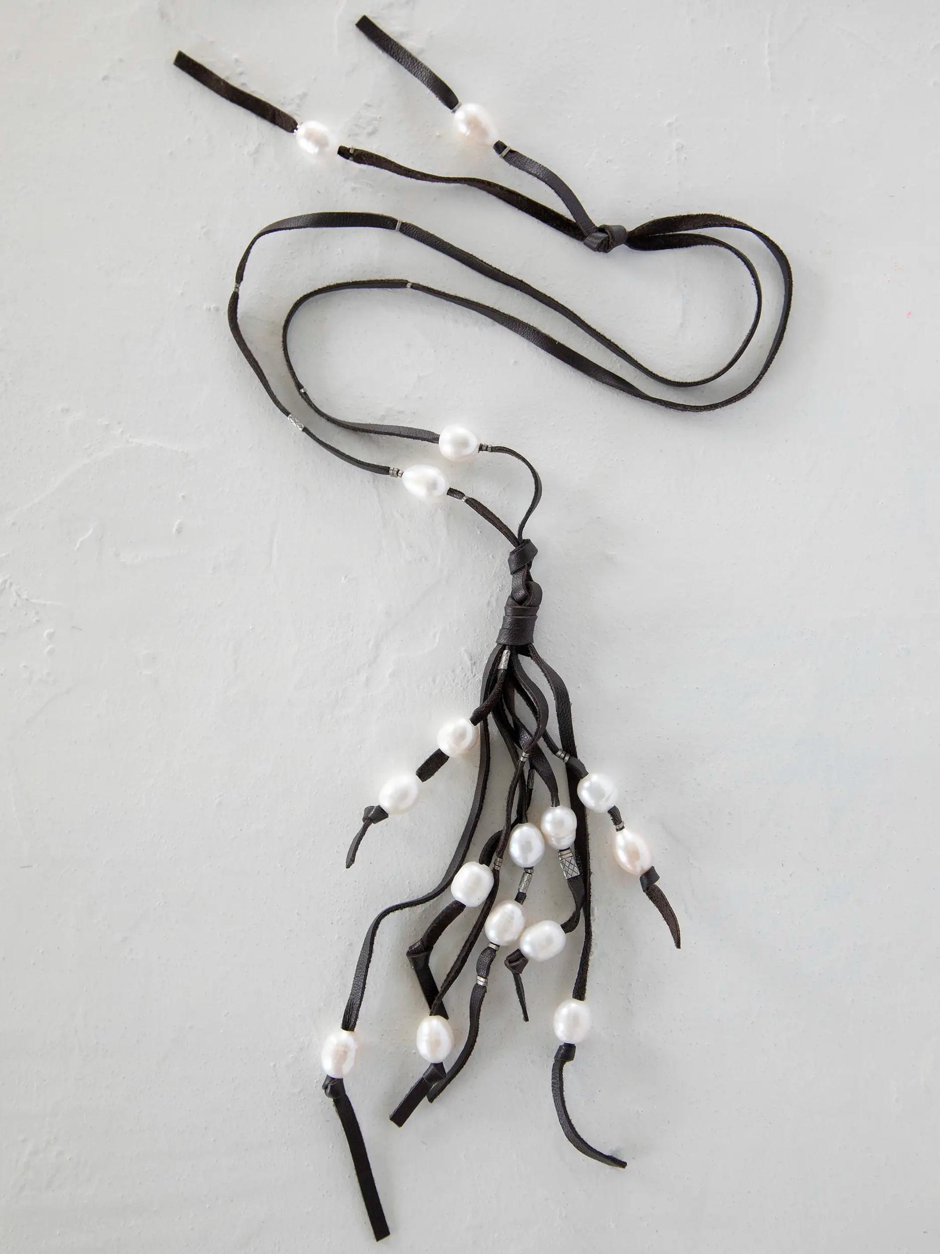 Real Pearl & Leather Tassel Necklace - Long White