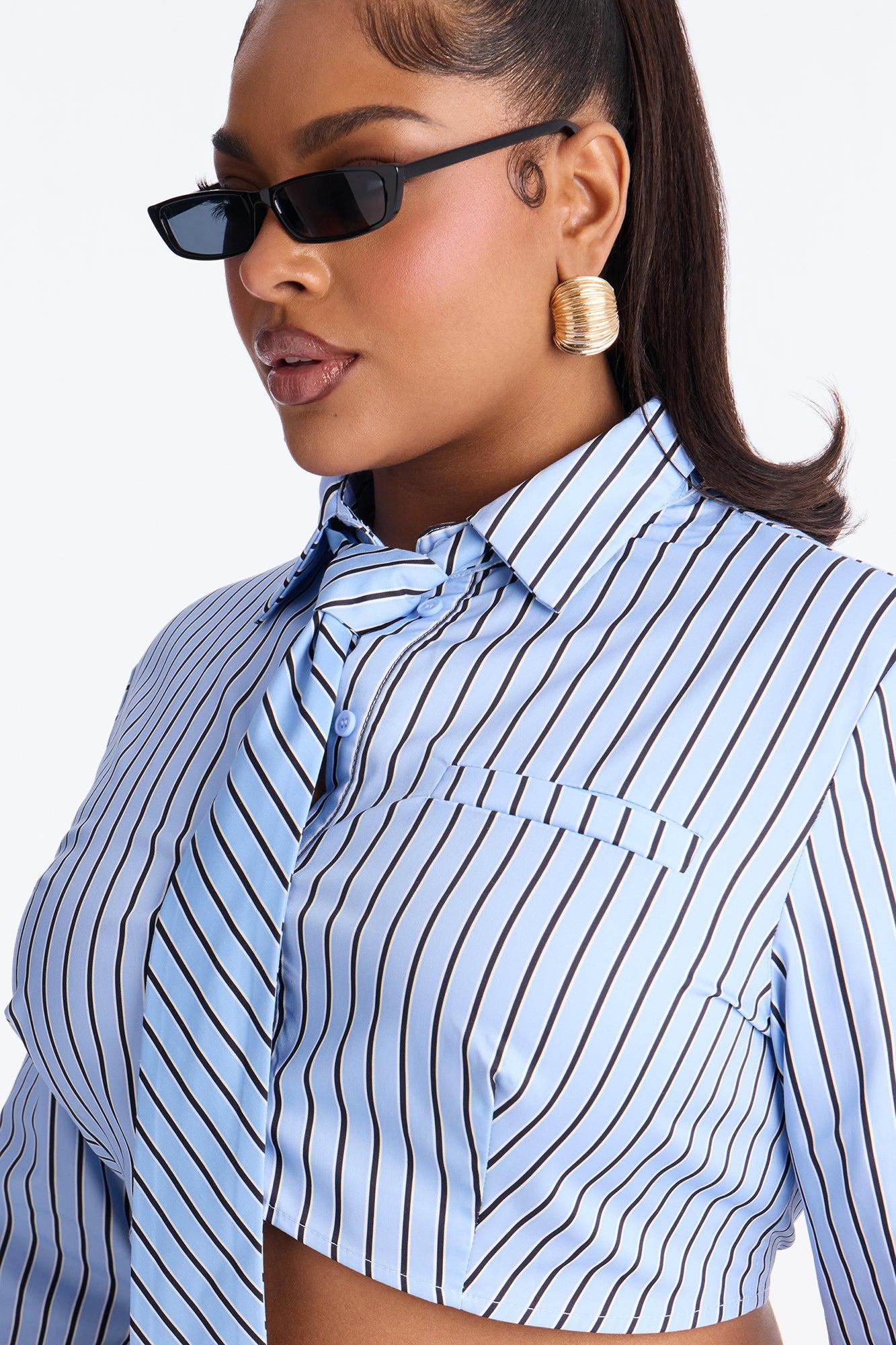 Real Woman Striped Poplin Tie Shirt - Blue/combo