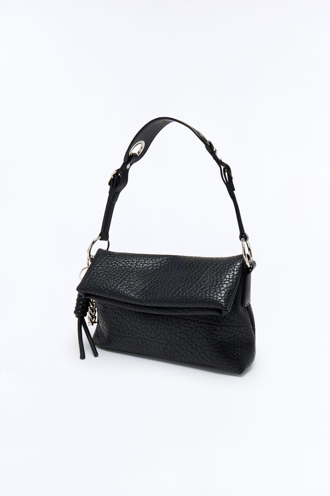 Available In Black. Shoulder Bag Top Zip Closure Textured Faux Leather Material Metal Hardware Detail Bag Chain Detail 11.5" W 3.25" H 6.8" D Imported California Proposition 65WARNING: Cancer and Reproductive Harm - www.P65Warnings.ca.gov.