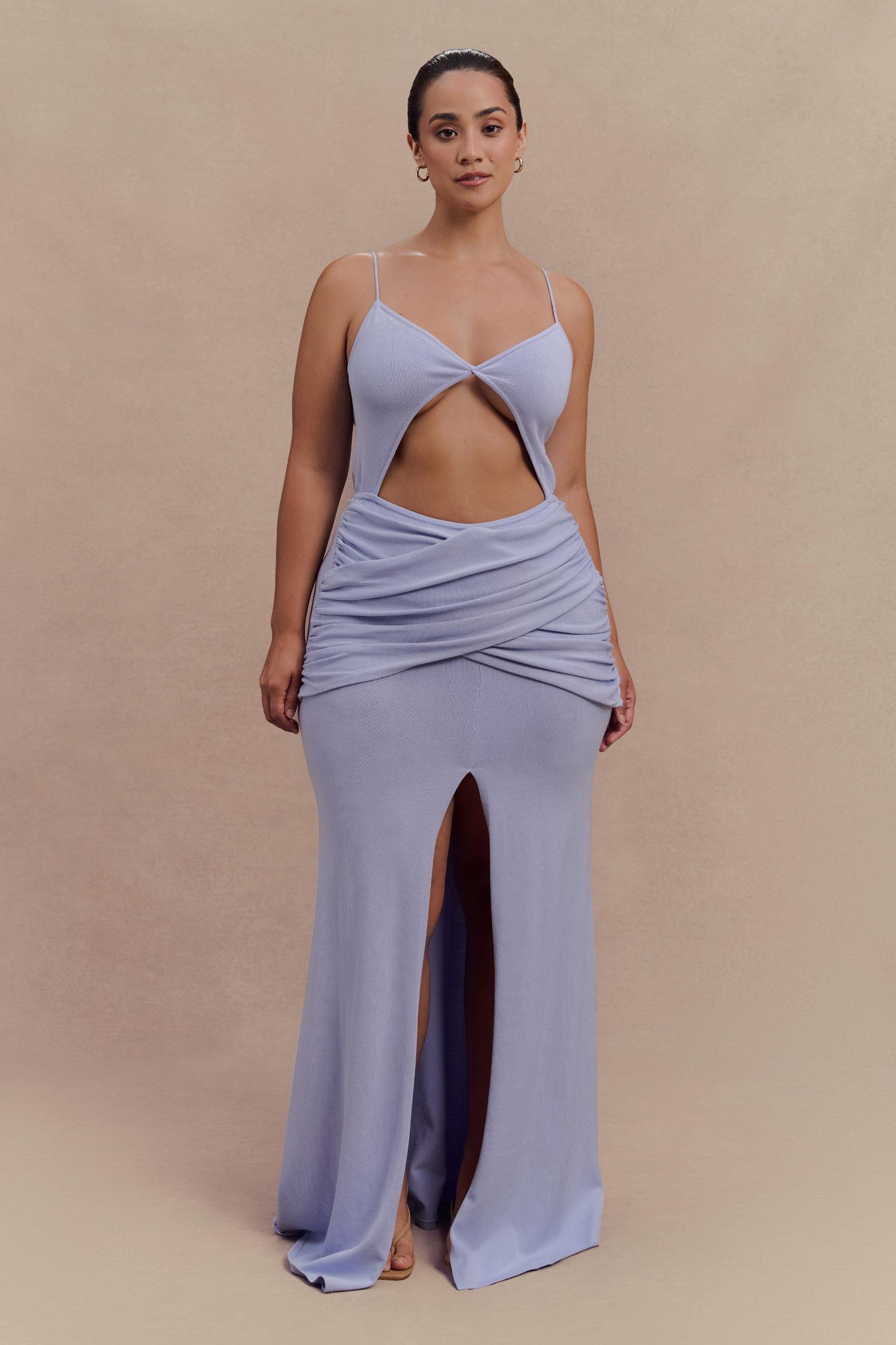 Twisted texture, city-bound allure. The REAMA Wrap Over Knit Maxi Dress is your elevated go-to for warm city days and romantic evenings alike. Designed with a flattering V neckline and twist front detail, this maxi silhouette features bold front and back waist cutouts that highlight the figure. A gathered overlay panel adds texture and dimension, while a front skirt split creates soft movement with every step. Crafted from a lightweight knit and unlined for a breathable, second-skin feel, this dress effortlessly balances structure and fluidity.