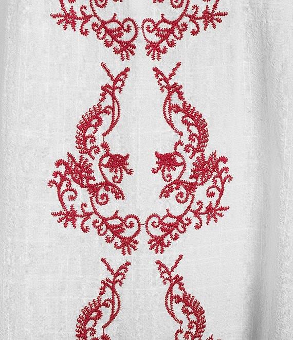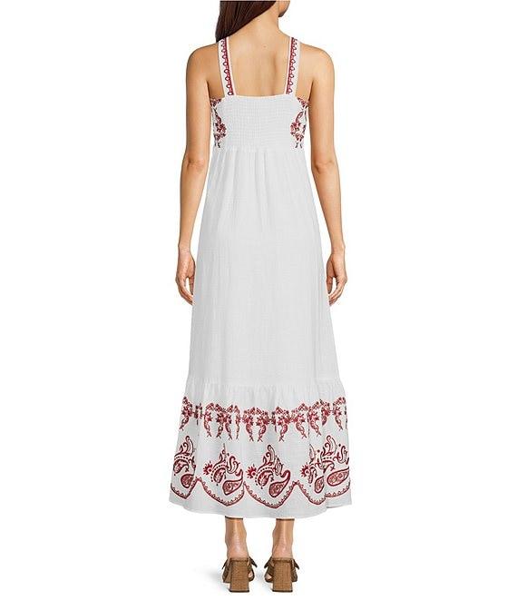 From Reba, this dress features:A-line silhouettePaisley print Square necklineSleeveless with adjustable shoulder strapsEmbroidered detailsSmocked bodicePullover construction Approx. 44.5" in lengthCottonHand washImported.