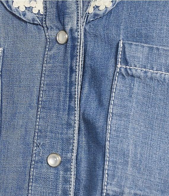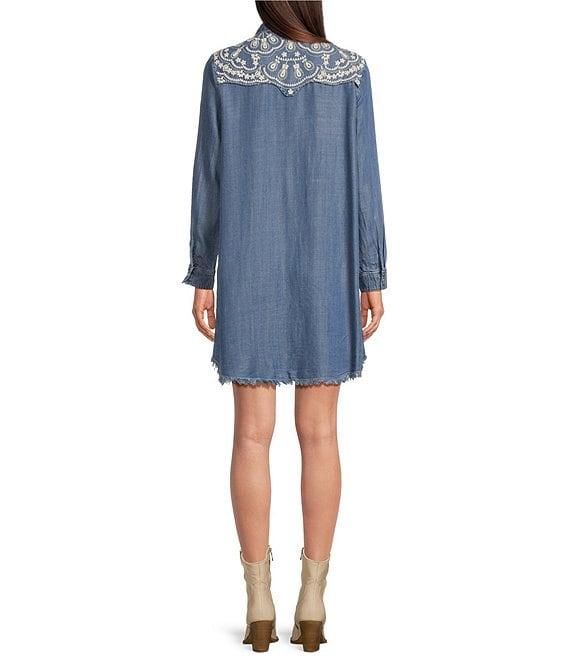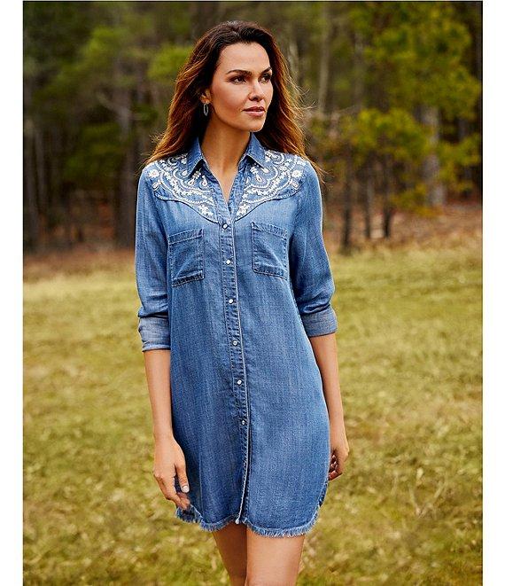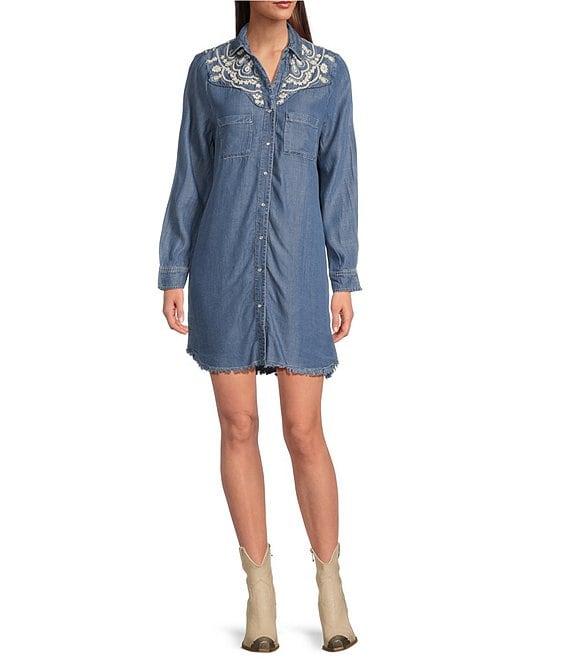 From Reba, this dress features: Tencel fabrication Shirtdress silhouette Point collar Long roll tab sleeves Patch pockets at chest Embroidered details Shirttail hemline Snap front closure Approx. 36" in length Lyocell Hand wash Imported.