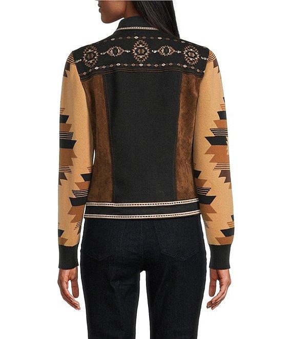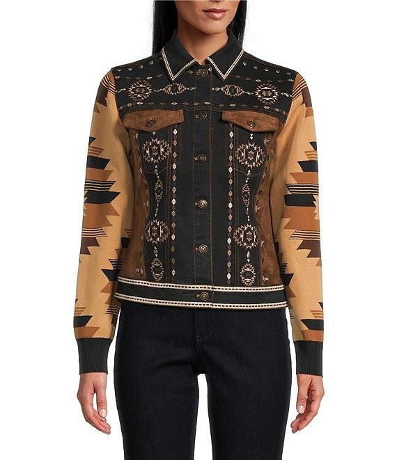 From Reba, this jacket features: Mixed media denim fabrication Point collar Long jacquard knit sleeves Southwestern embroidered details Faux suede chest flap pockets & side panels Front princess seams Straight hemline Button front closure Approx. 23" length Cotton/polyester/nylon/spandex Hand wash Imported.