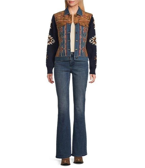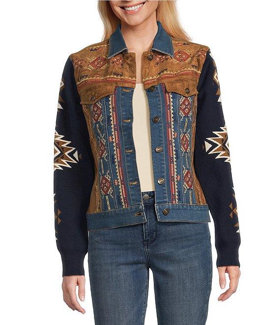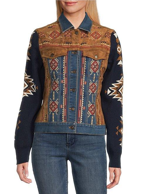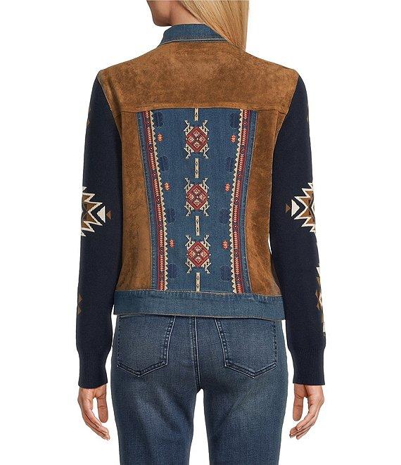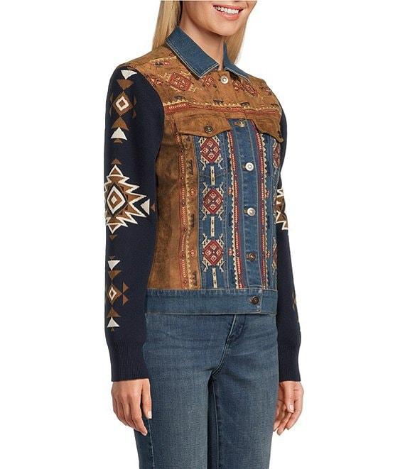 From Reba, this jacket features: Mixed media fabrication Point collar Long knit jacquard sleeves Western embroidery motif Faux suede chest flap pockets & side panels Princess seam detailing Straight hemline Button front closure Approx. 23" length Cotton/polyester/nylon/spandex Hand wash cold/line dry Imported.